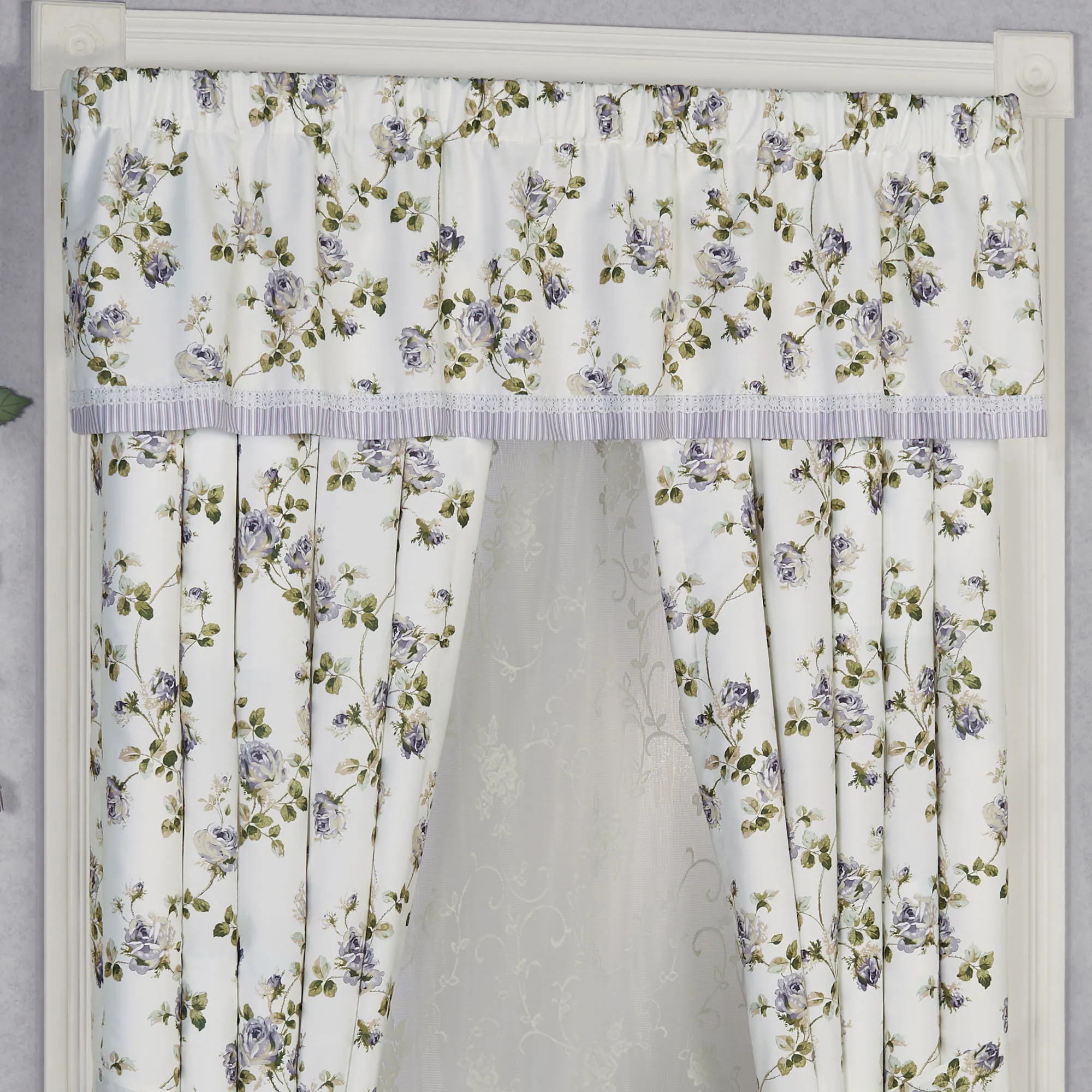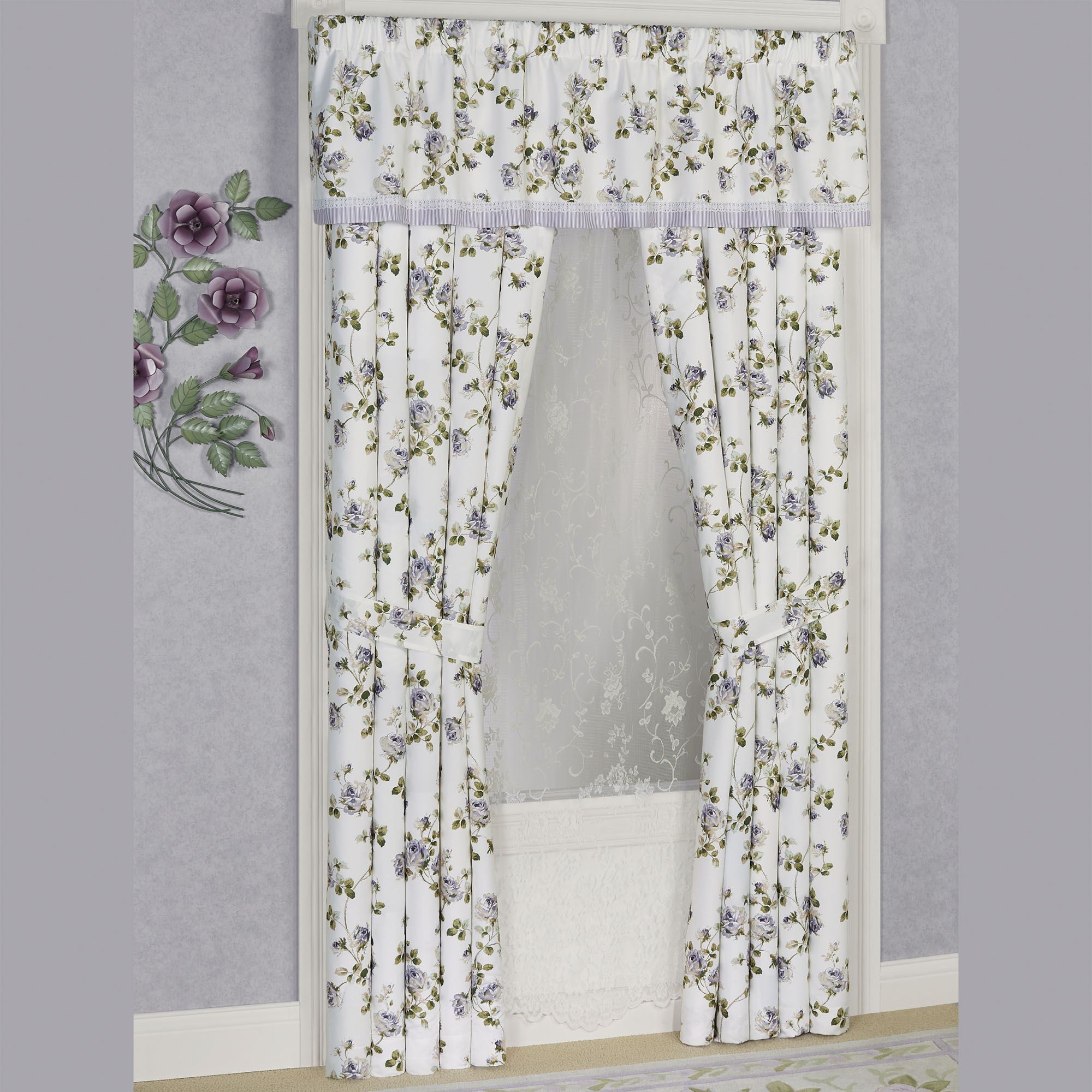 Sweet romance blossoms with beautiful roses on the charming Rosalyn Floral Window Treatment. This cottage-inspired, polyester microfiber ensemble features a printed vining rose design in shades of wisteria and sage on light almond. Window treatment has 3" rod pockets. Specify Tailored Valance or Curtain Pair. The lined Tailored Valance has stripes and crochet lace along the bottom. Tailored, lined Curtains include tiebacks. Machine washable. Imported. The curtain pair width is the total width of two panels together.