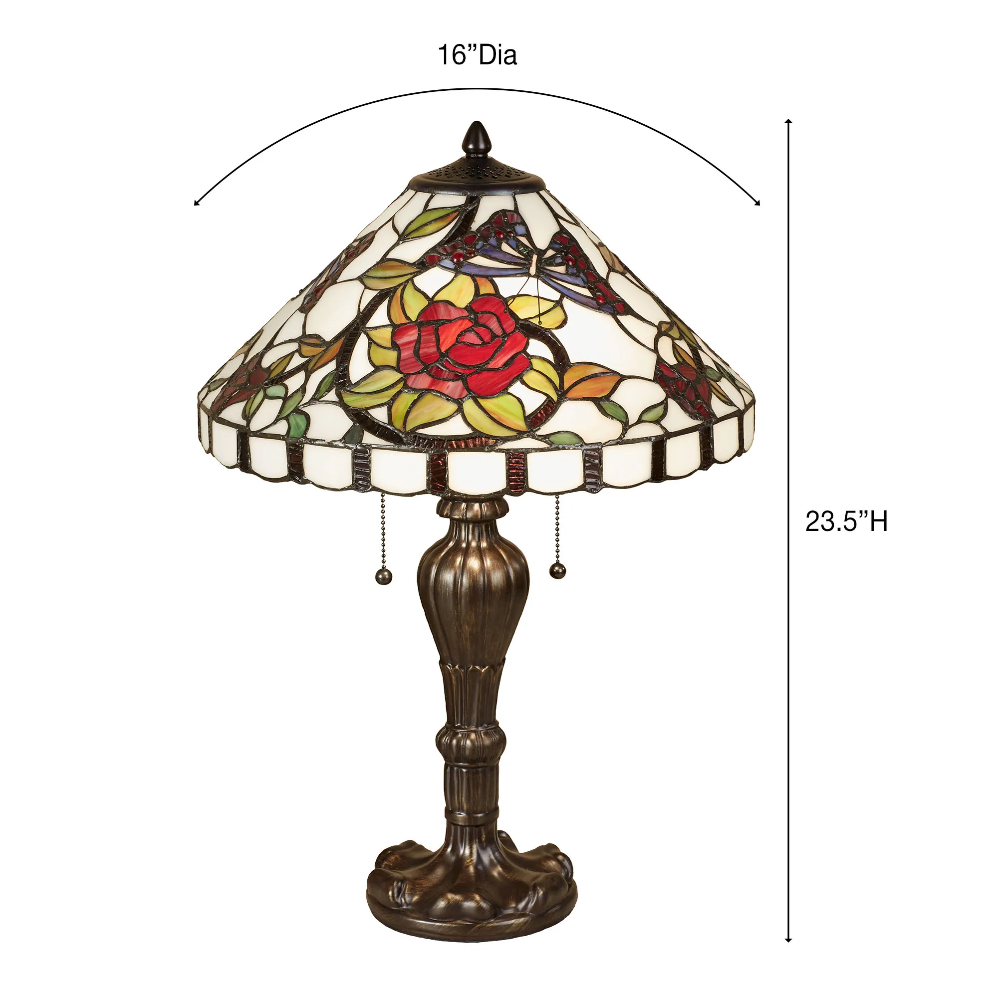 Vining red blooms with crisp sage leaves create an alluring romantic appeal upon the Rose Amour Stained Glass Table Lamp. Handcrafted, hand-cut, and hand-soldered, the ivory stained glass shade features a lush rose design with visiting butterflies and a lovely scalloped border, which is complemented by the dark bronze shaped metal font with weathered gold and grooved detailing. UL listed. Requires two 60W max. bulbs that operate from a dual pull chain illumination. Lamp measures 16"dia.x23.5"H, including the 1.25"H matching finial; weighs 12 lbs.