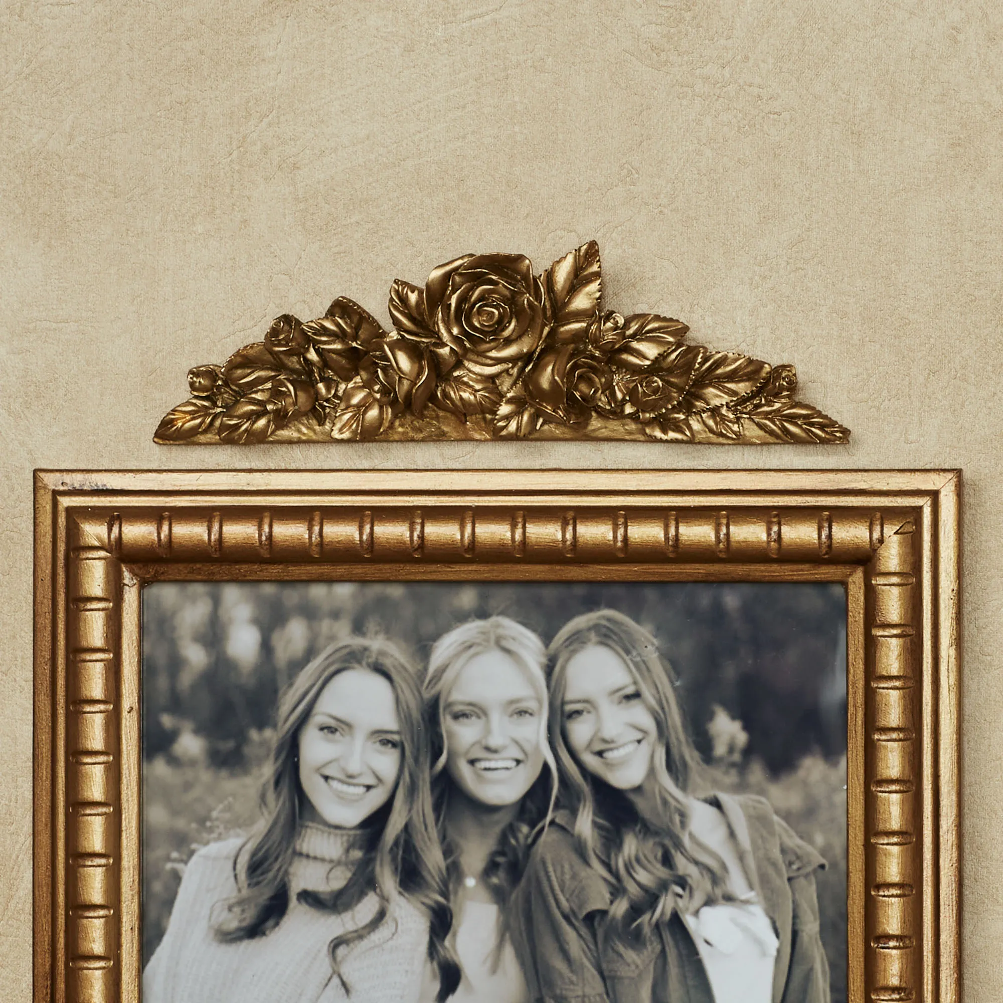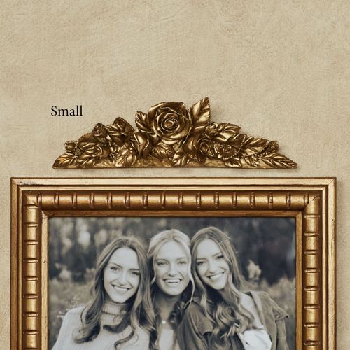 Enhance a framed picture with this pretty Rose Topper. Resin accent has a golden finish; charming accent also has an open rose, smaller buds, and leaves. Small is 6.5"x2".