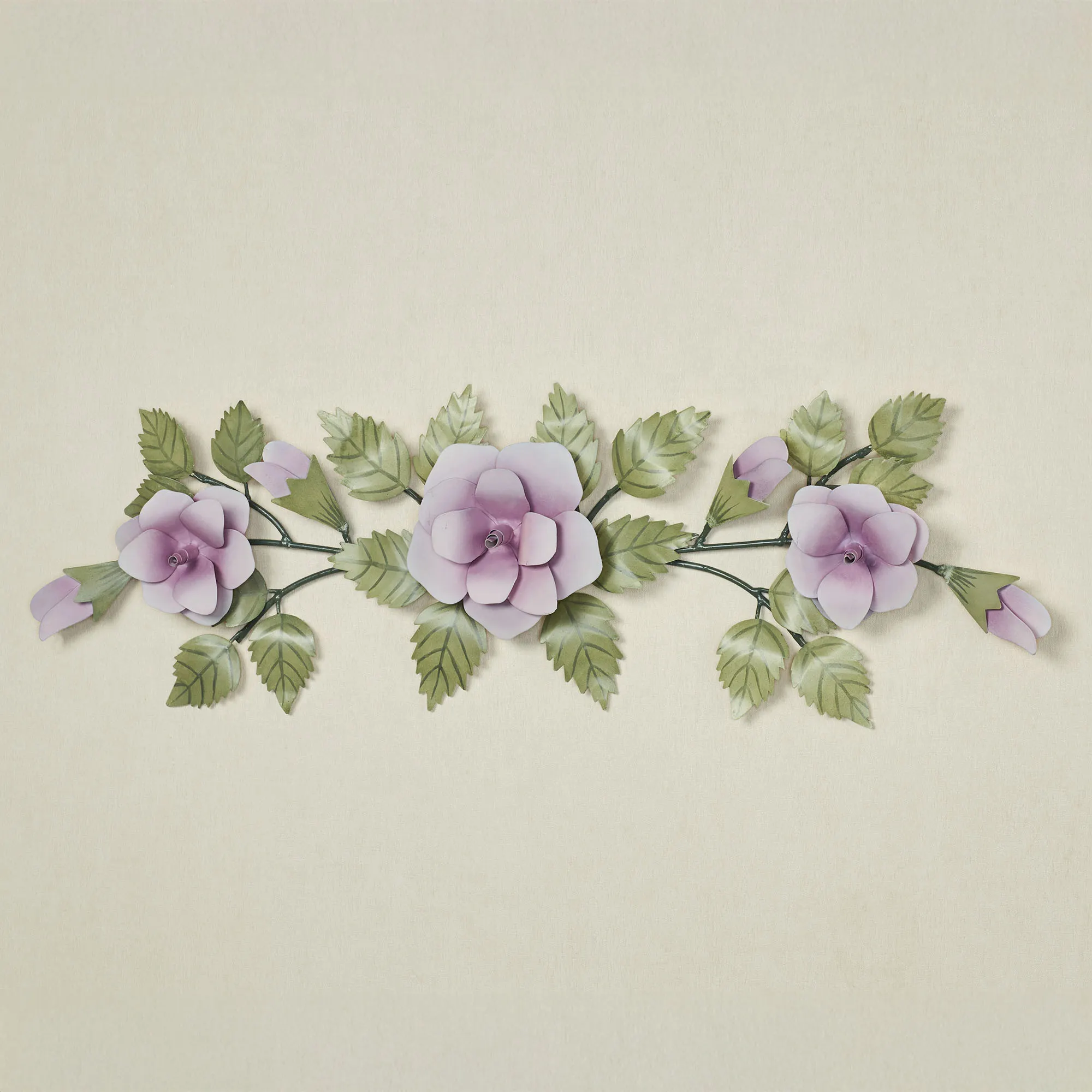 Flourishing with garden charm and classic elegance, the Rose Swag Lavender Floral Wall Topper blooms with sweetness. Handcrafted of metal, this handpainted wall topper features lavender rose blooms and buds nestled amid green leaves. Due to the handcrafted nature of this item, slight variations may occur. Floral wall topper may be used indoors or outdoors under a covered area. Measures 31"Wx3"Dx10"H.