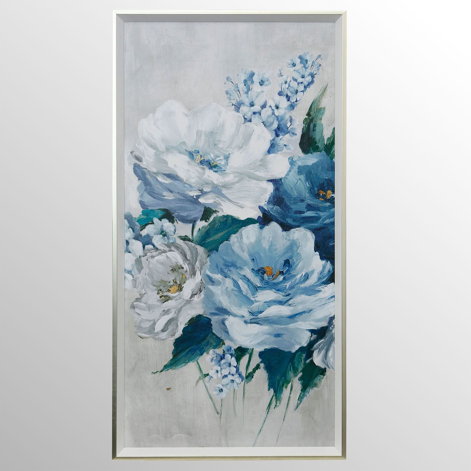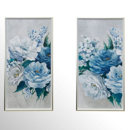 Embrace the delicate floral beauty of the Roses en Bleu Framed Art. This print on paper wall art features a beautiful flower bouquet in shades of blue on a light gray washed background. Roses en Bleu I has four roses: two large blue/gray roses, a light blue rose, and a hint of a dark blue rose. Roses en Bleu II has three roses: one dark blue full rose bloom, a pale blue/gray bloom, and a portion of a light blue rose. Art is surrounded by a polystyrene frame with a silver finish. Wall art is sold individually; each is 21"Wx1.5"Dx39"H.