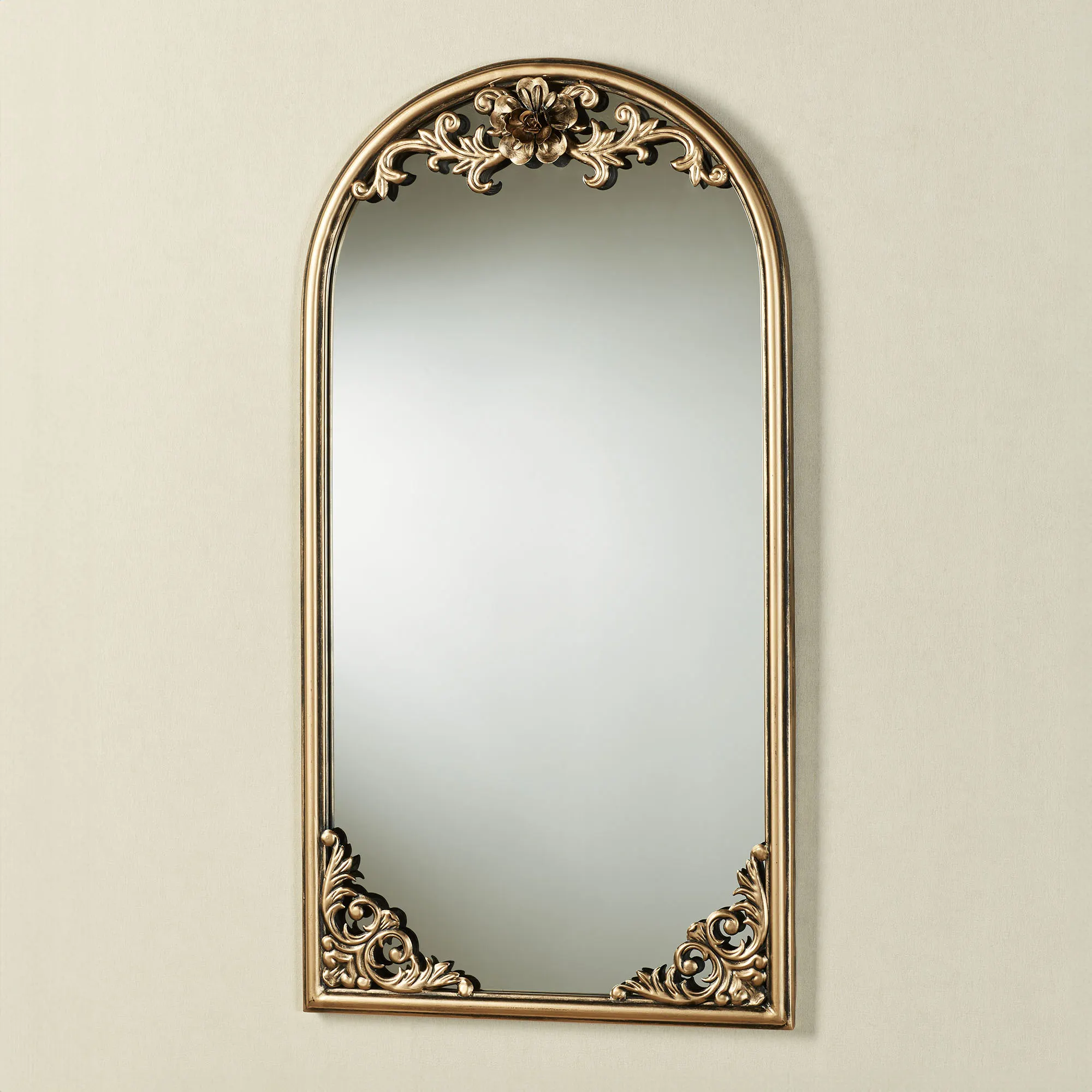 The Rosetta Arched Wall Mirror decorates with classic finery. This traditionally styled wall mirror has a mirrored glass in the center and an arched top. The aged gold metal frame has scroll, fleur, and flower designs. Measures 18"Wx2"Dx34"H; weighs approx. 12 lbs.