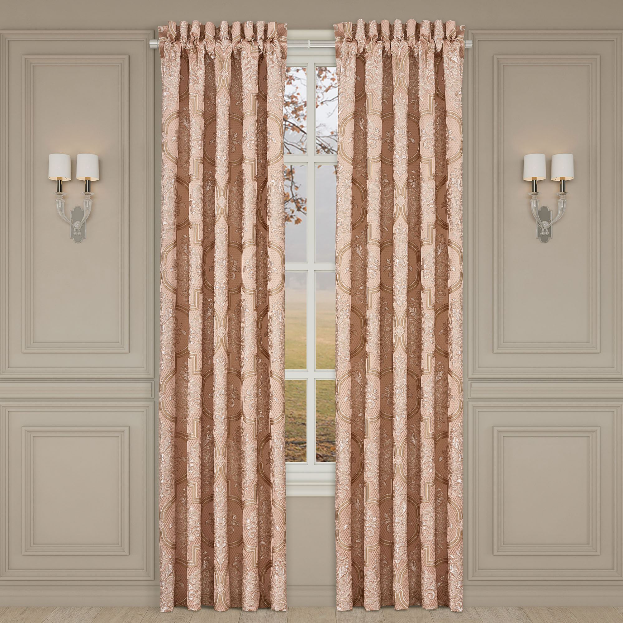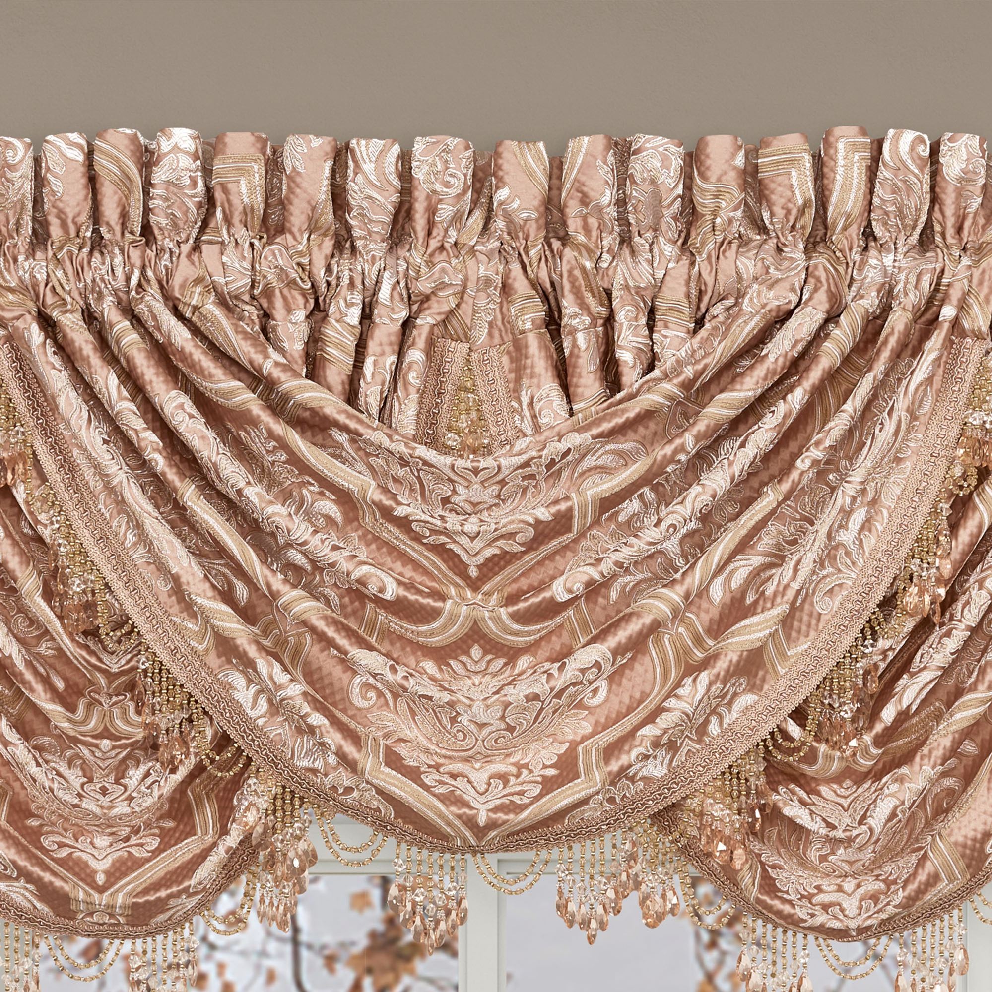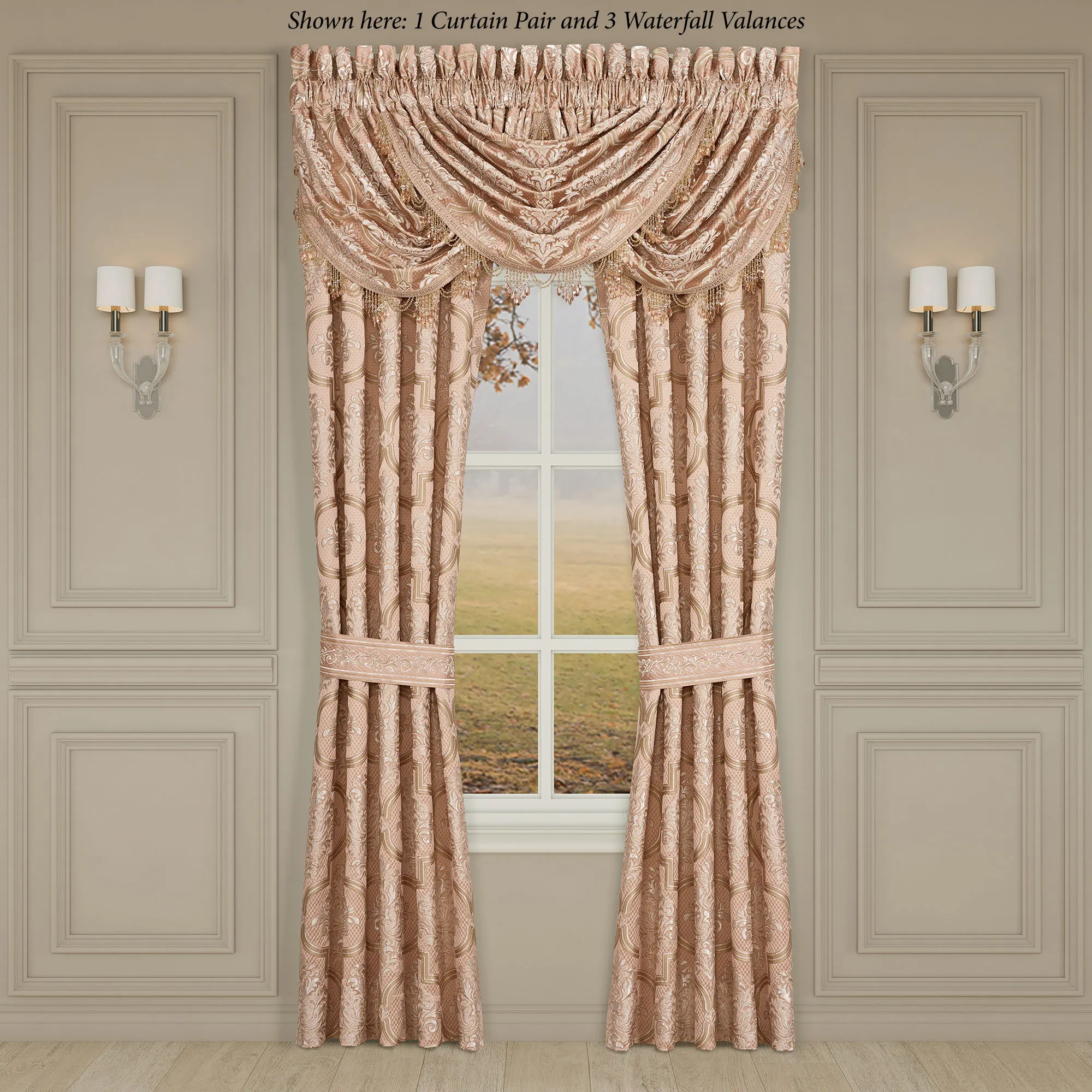 Lined Window Treatment has damask. Wide Curtain Pair has tailored edges and a 3" rod pocket. Tiebacks are included. Curtains are available in two lengths. Each Waterfall Valance features beaded-trim edges and a 3.25" rod pocket. We recommend one valance for every 12"-15" of window width.