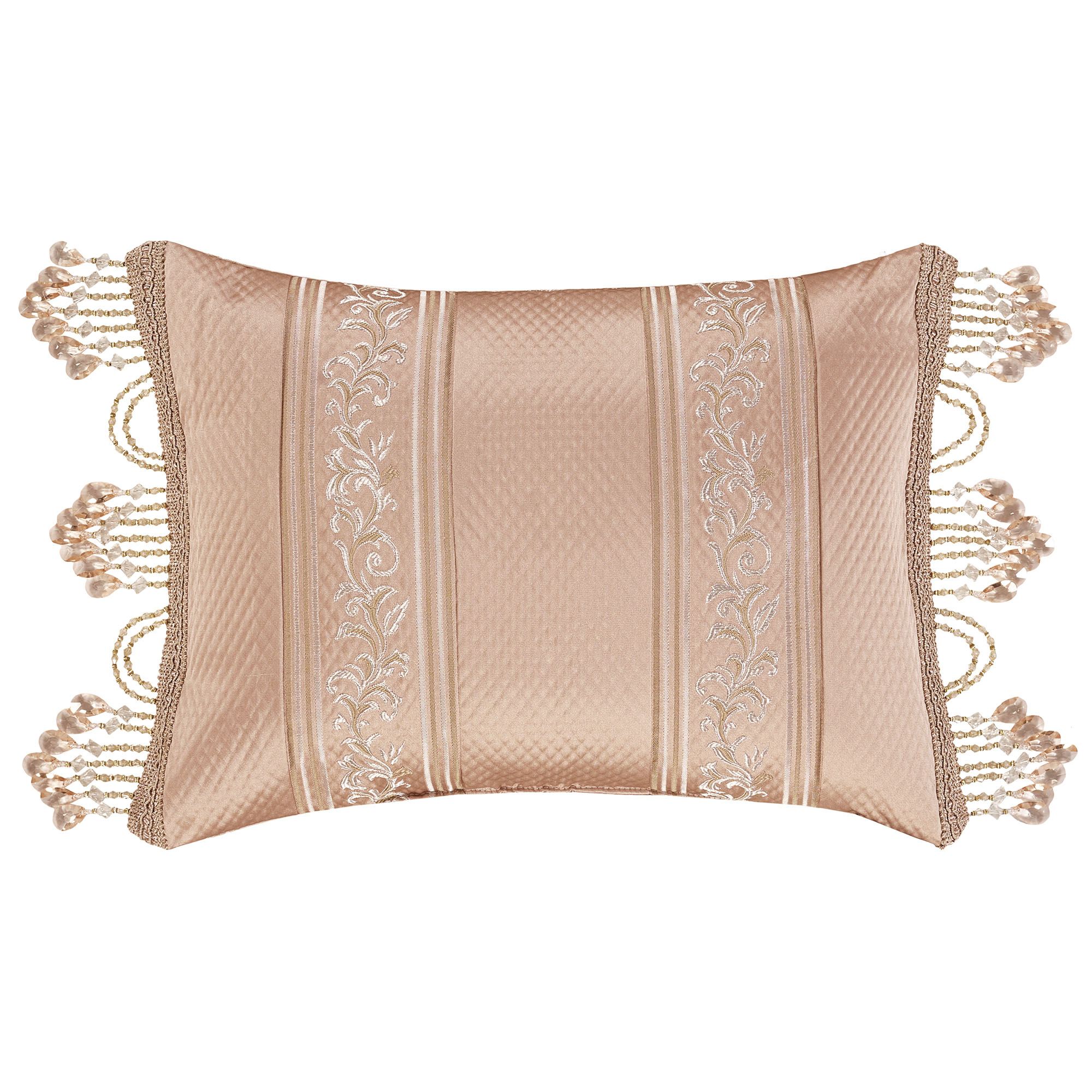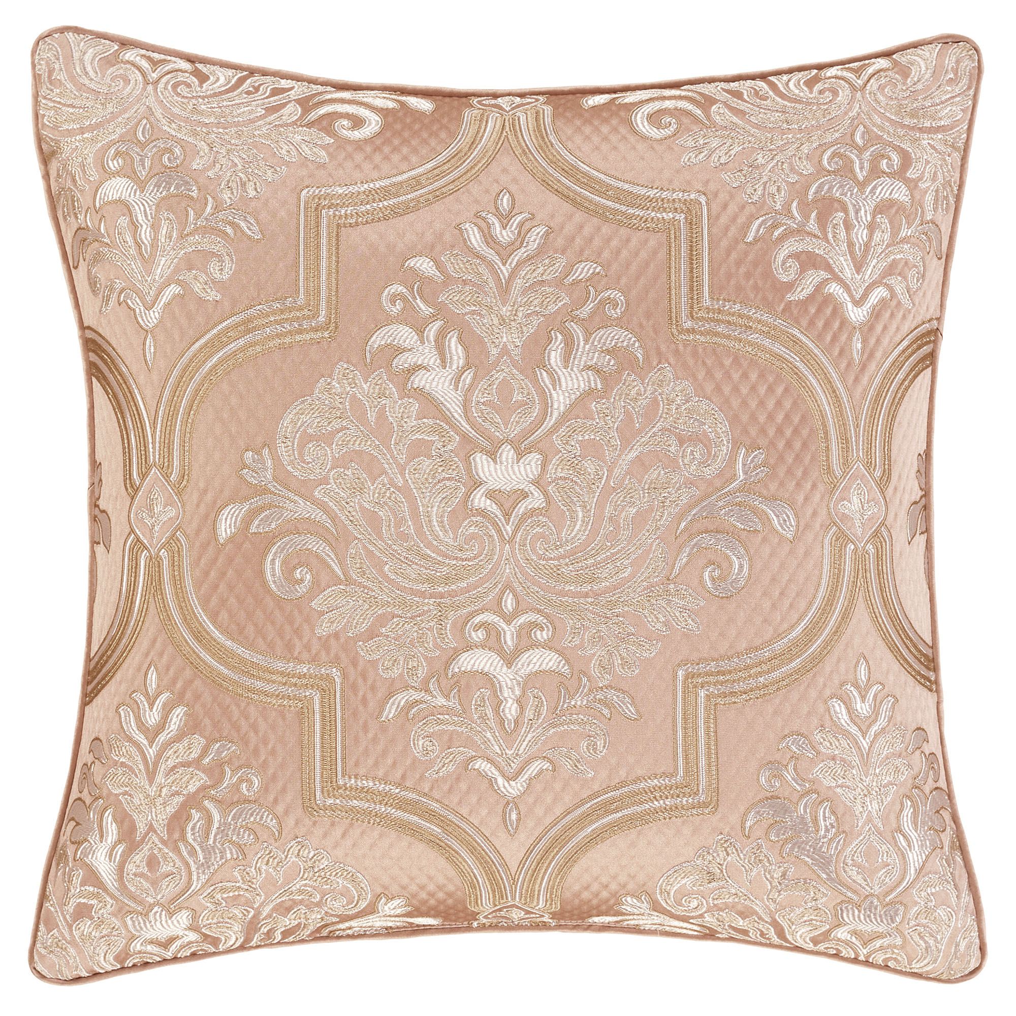 Reversible Pillows feature blush diamond matelasse. Spot clean. Tufted 18" Square has a mitred leafy-trim frame and piped edges. Embroidered 18" Square has embroidered quatrefoil motifs and piped edges. The 20" Square has damask and piped edges. Jumbo Rectangle has damask, piped edges, and a 2.5" side gusset; reverses to bands of matelasse and leafy trim. Tailored Rectangle features bands of matelasse and leafy trim and length ends with gimp trim and beading; reverses to bands of matelasse and leafy trim. Handmade Round is pleated with a button-tuft center and a 3" side gusset.