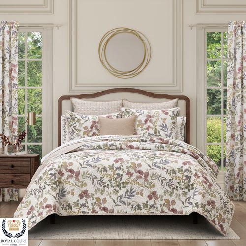 Delight in the botanical bliss of the Rosewood Bedding from Royal Court. The Quilt Set includes a quilt and sham(s). The ivory polyester microfiber bedding features printed leafy branches and greenery, all in rose, green, purple, and gold tones. Quilt has vermicelli quilting and an almond leafy latticework reverse. Bedding fill is polyester. Dry clean only. Imported.