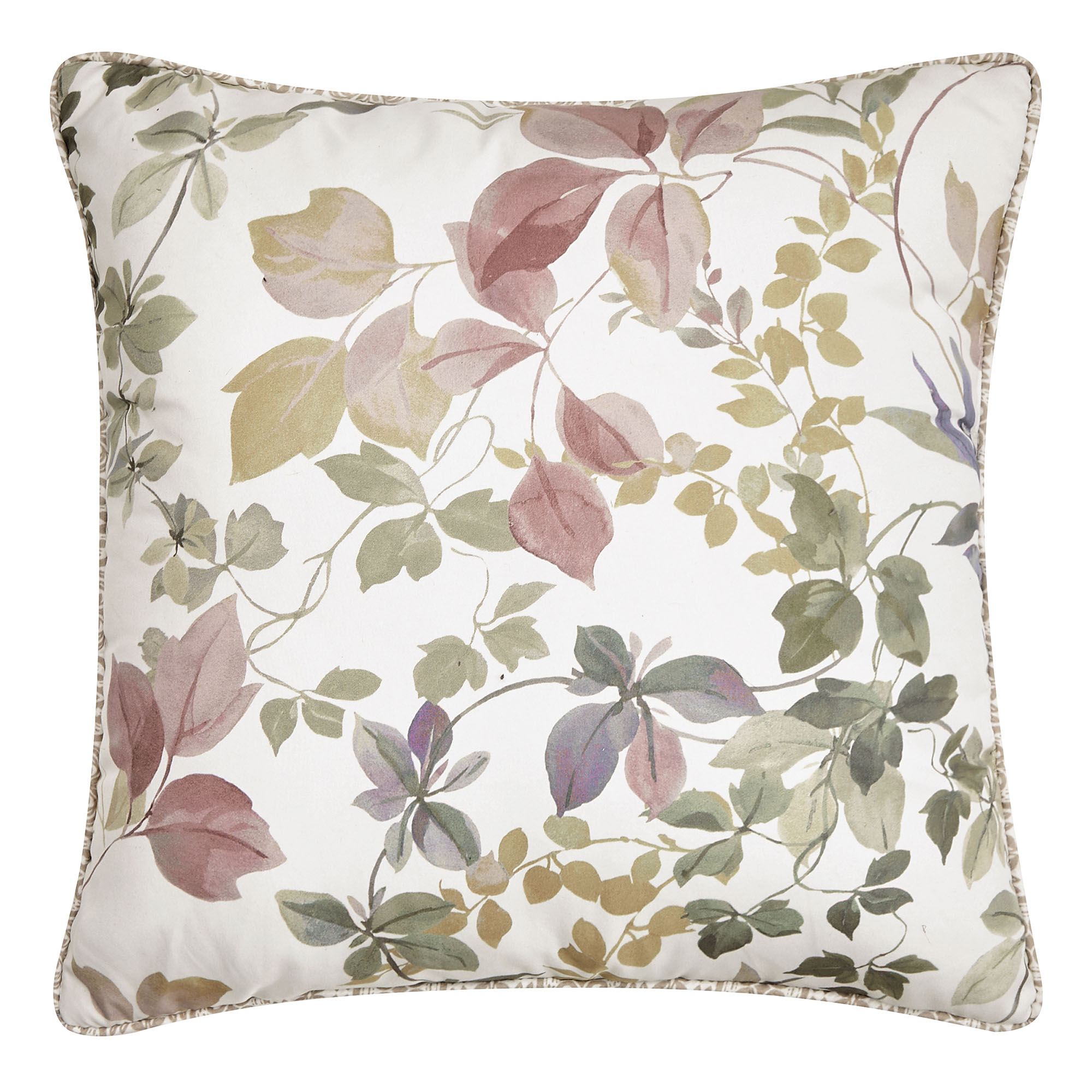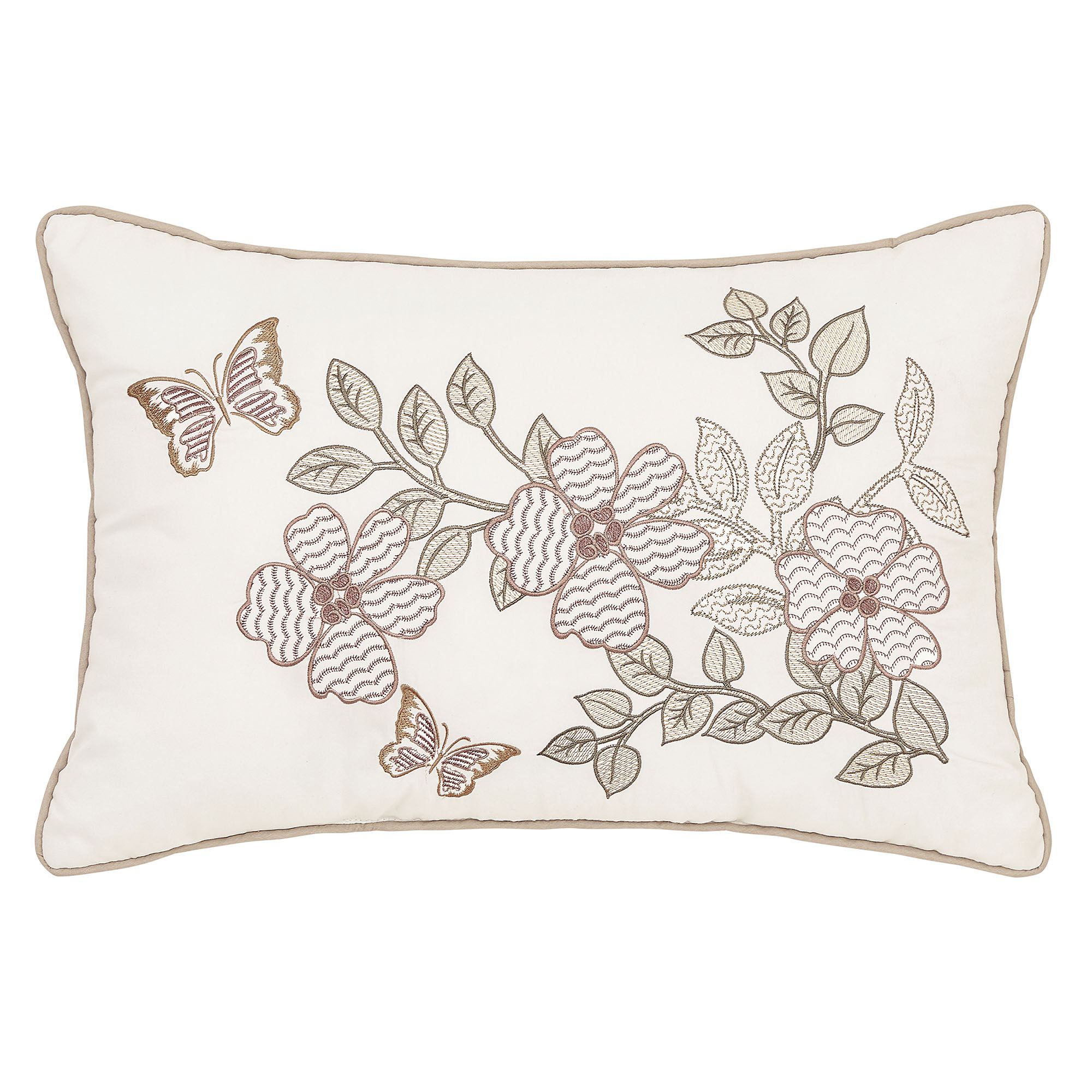 Pillows: Spot clean. Piped Square has leaves and reverses to leafy latticework. Quilted Square is almond with vermicelli quilting and bound edges; reverses to leafy latticework. Rectangle features embroidered florals, leaves, and butterflies on ivory with piped edges.