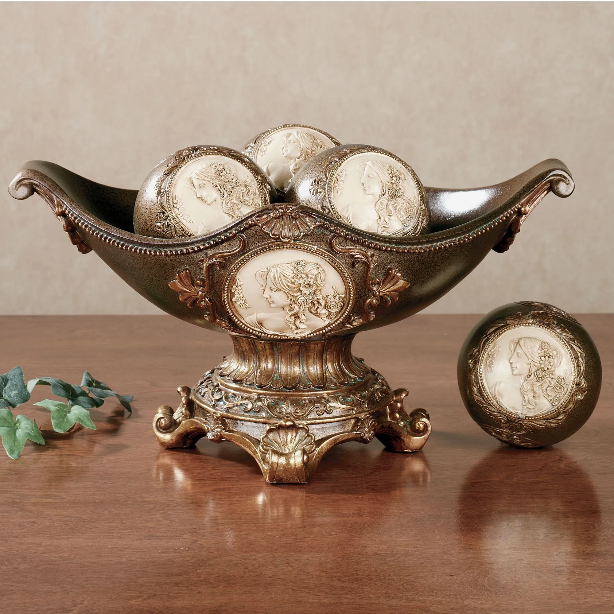 The classical theme of the resin Rossella Cameo Centerpiece Bowl and Orb Set will provide stunning decoration for your room. Decorative accents feature cameos of a Grecian maiden in ivory and a handpainted soft brown finish. Other embellishments include golden scrolls, beaded border, and classic shell accents. Shapely centerpiece bowl is 15.5"Wx10.5"Dx8"H; decorative orbs are each 4" dia.