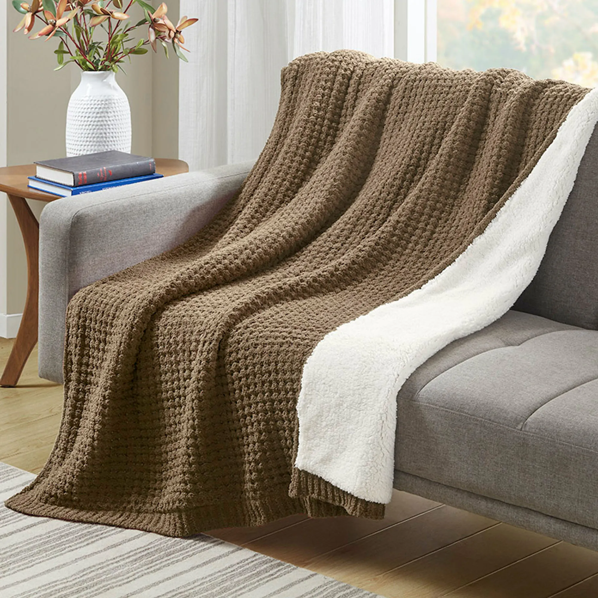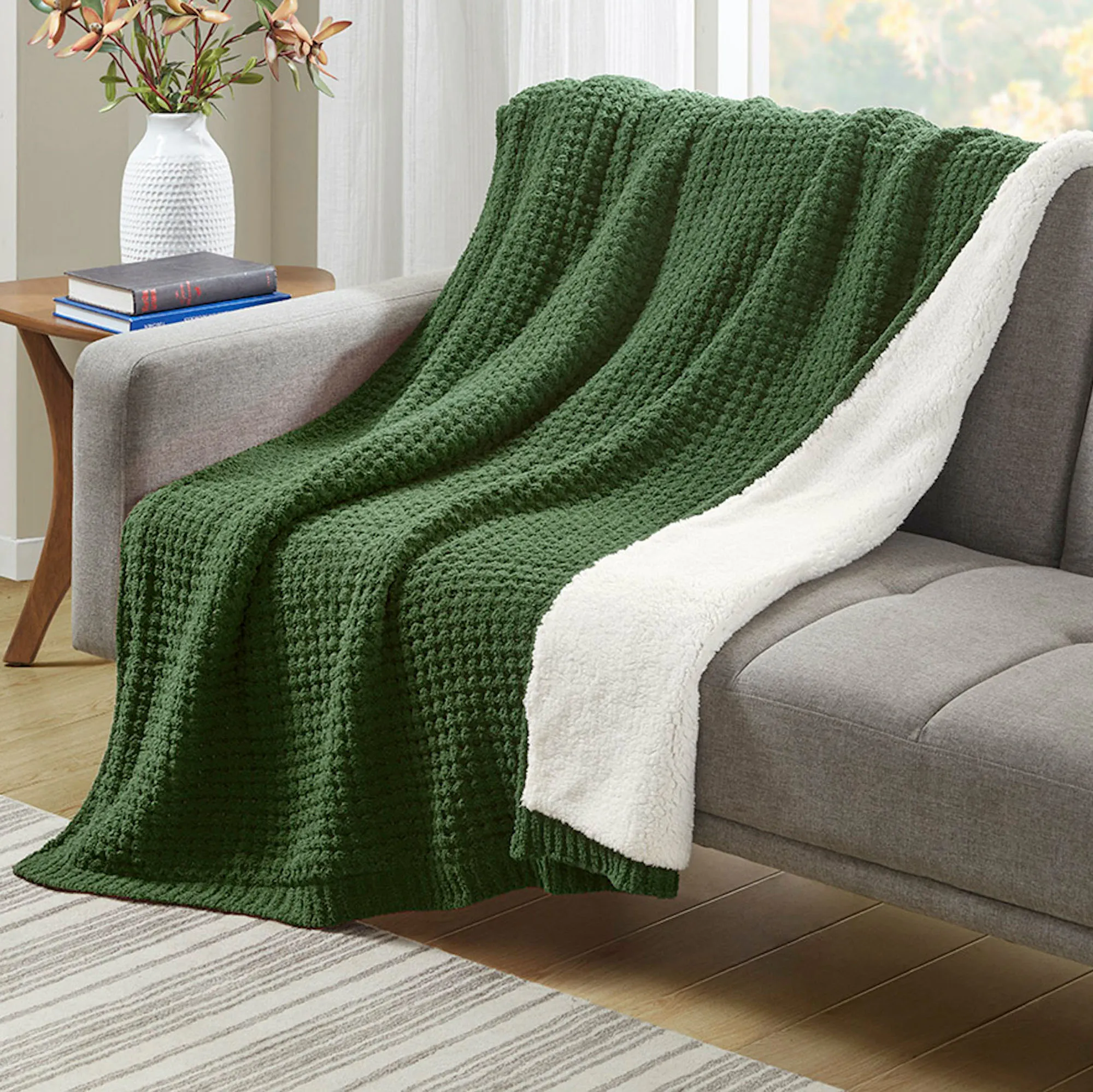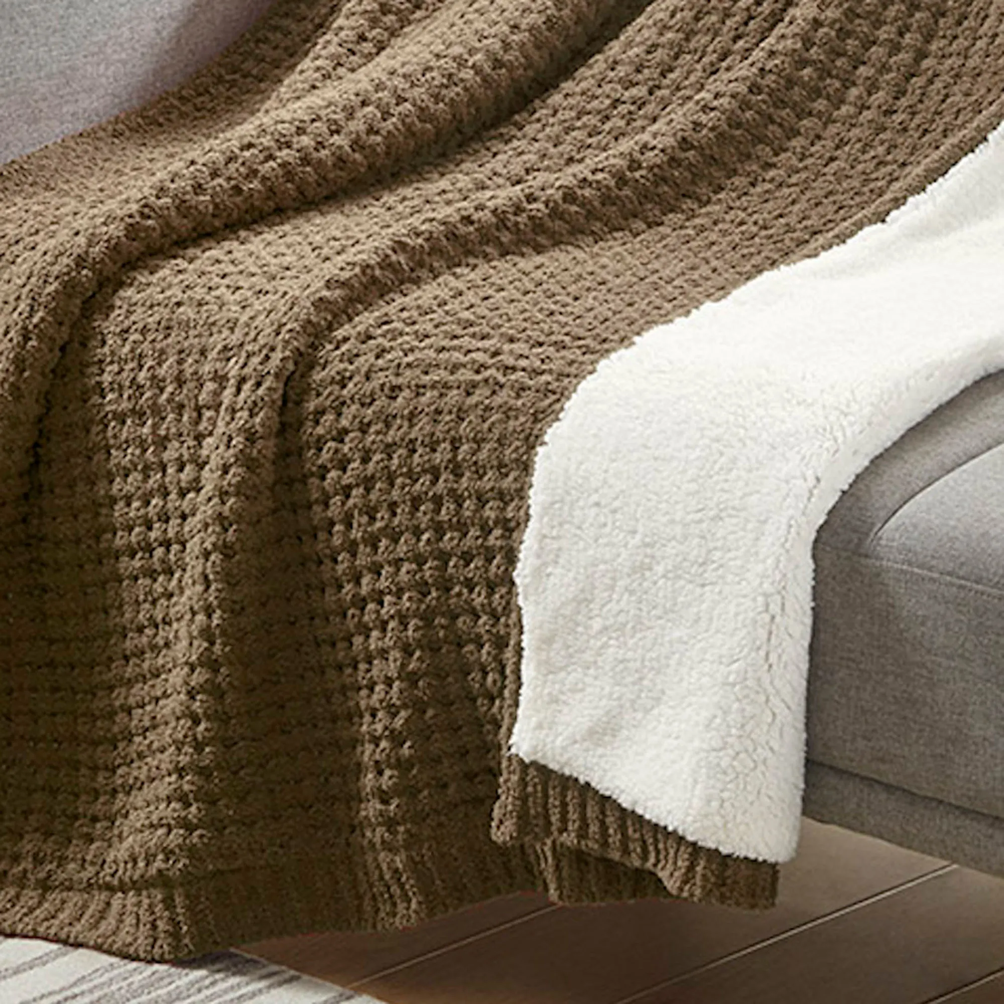 Rowan Solid Color Chenille Waffle Knit Sherpa Throw Blanket from Madison Park