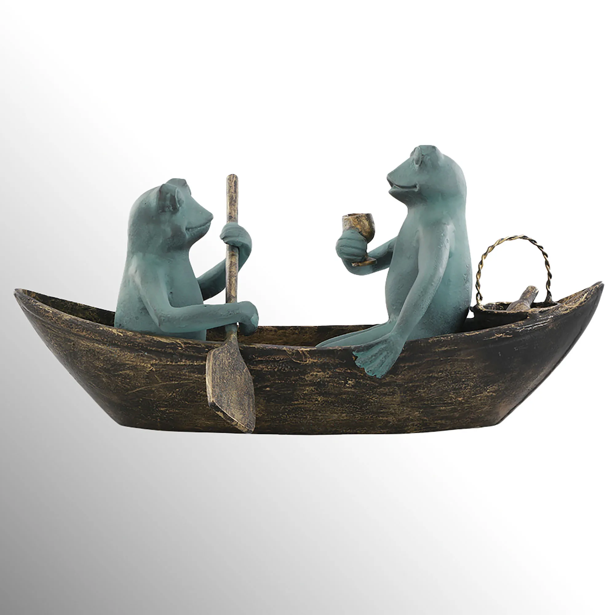 This couple has decided to spice up their routine with a Rowboat Picnic in your outdoor space. Hand-cast from aluminum with hand-rubbed finishes, the garden sculpture features a bronze rowboat, two verdi frogs, and gold accents. One frog holds an oar, while the other sips wine from the picnic basket. Perfect outdoors year round, the frog sculpture measures 21.5"Wx11"Dx10"H.