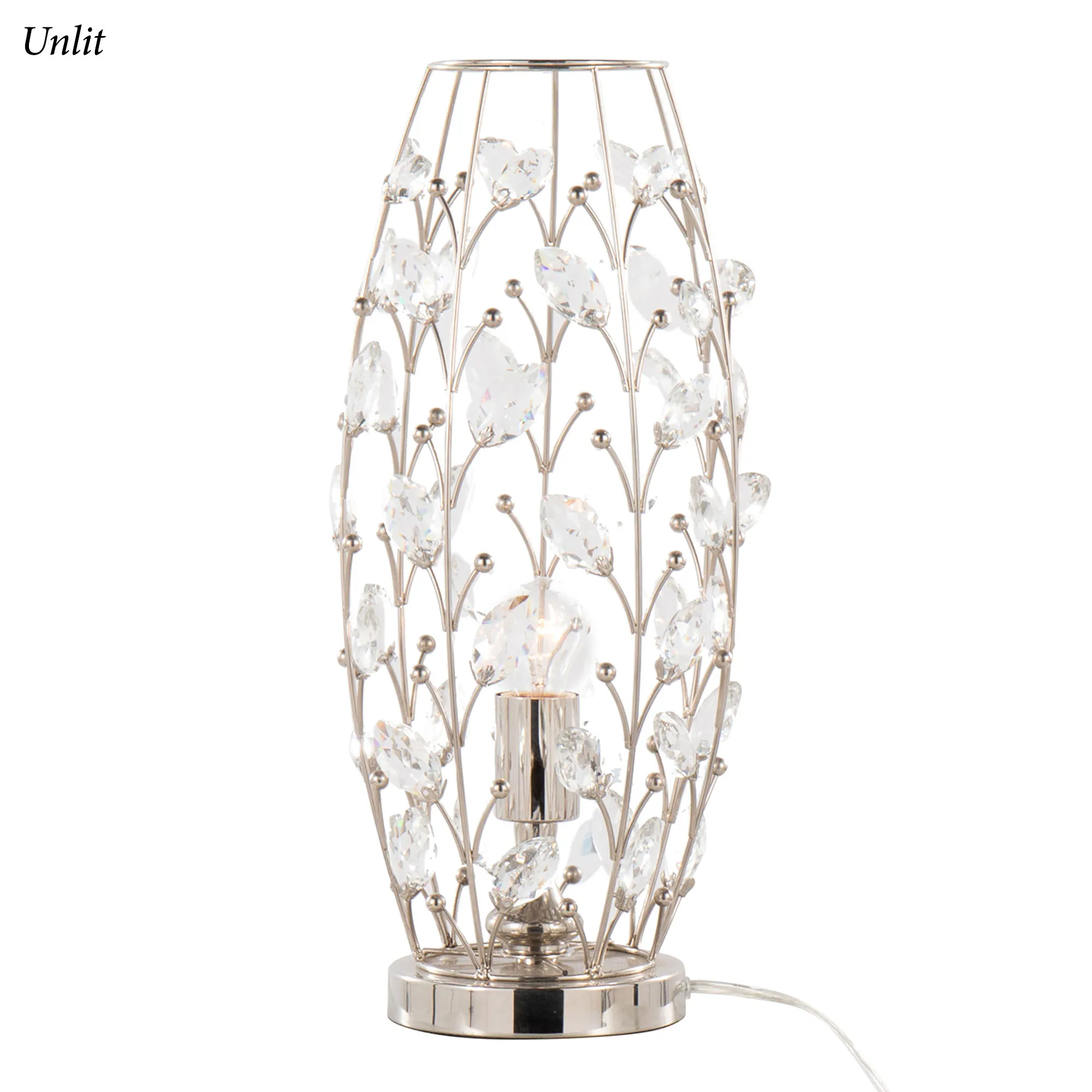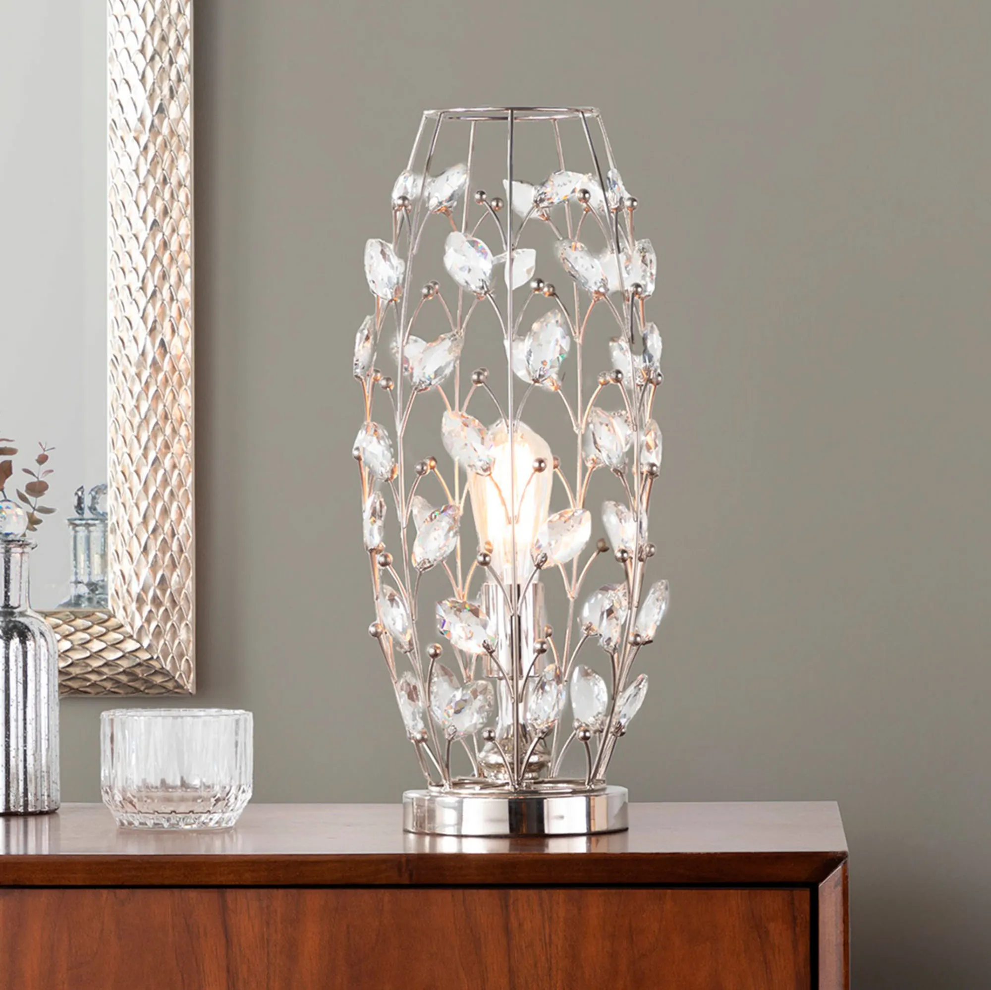 Sparkling leaves branch out with elegance on the Rowena Crystal Table Lamp. This metal uplight table lamp has a polished nickel finish and crystal accents. UL listed. Requires one 60W max. bulb. Inline switch is on the cord. Measures 8"dia.x19"H.