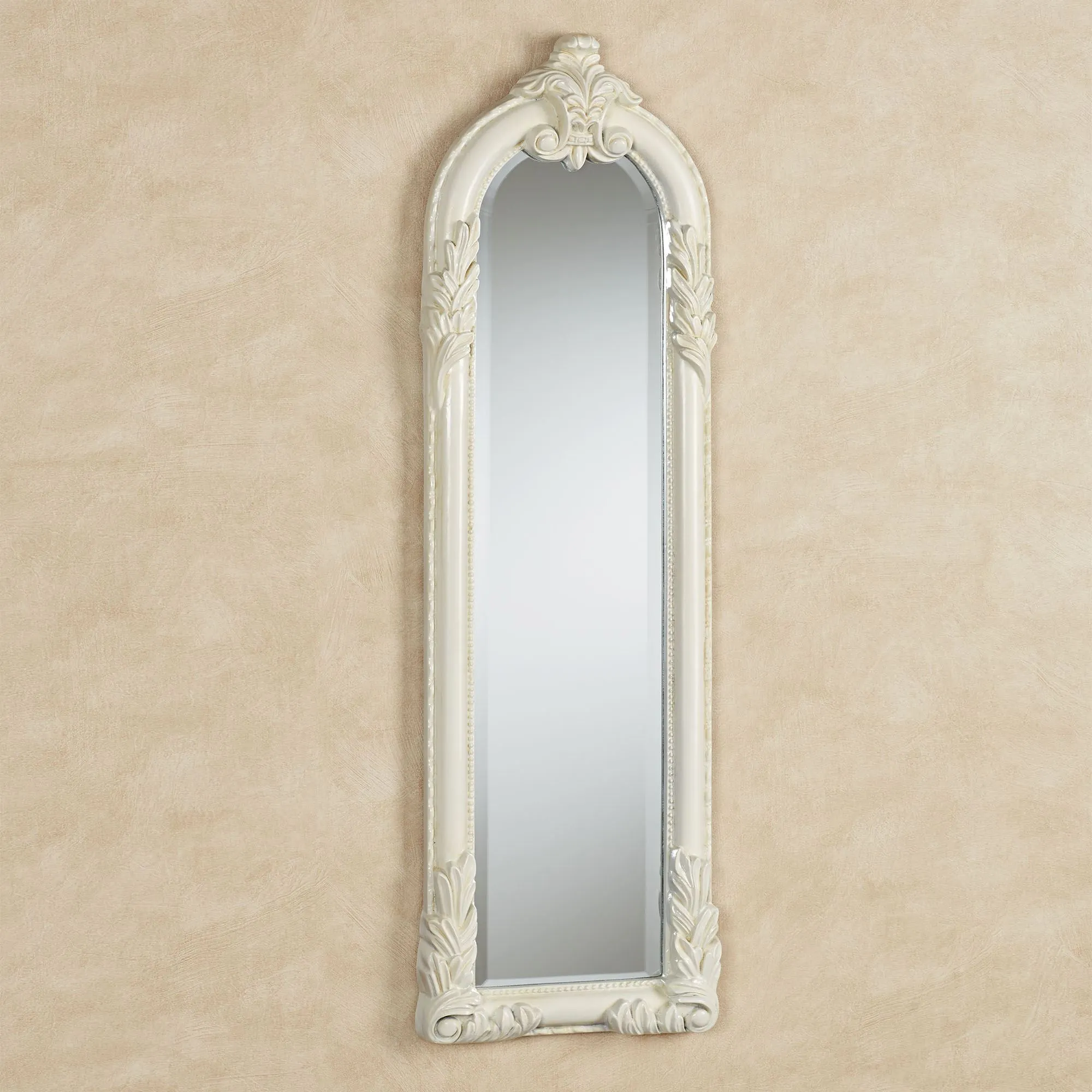 Posh style is easily defined with the Royal Acanthus Antique White Arched Panel Wall Mirror. Finished in antique white, the resin wall accent has ornate motifs and leaves and a central beveled glass mirror. Measures 10"Wx2"Dx34"H.