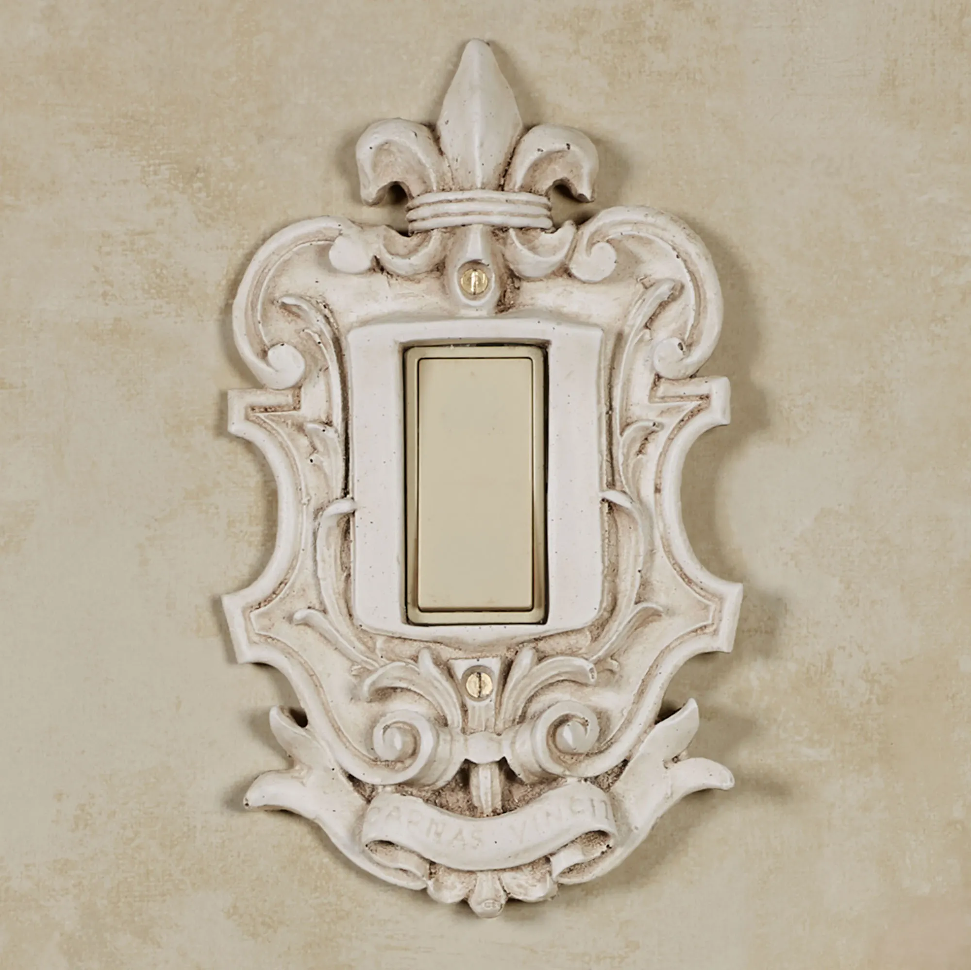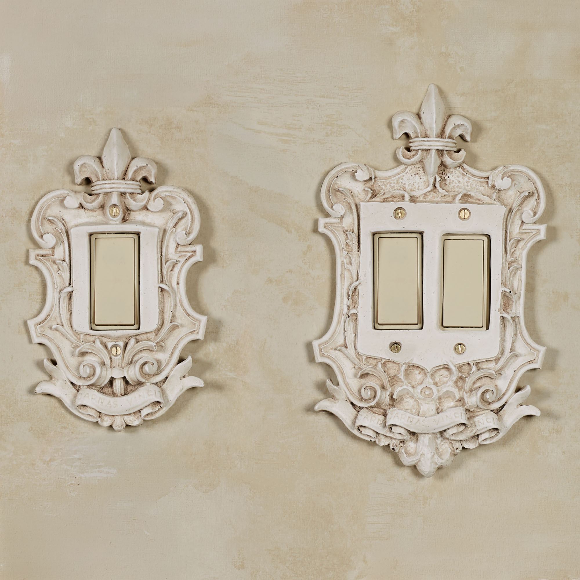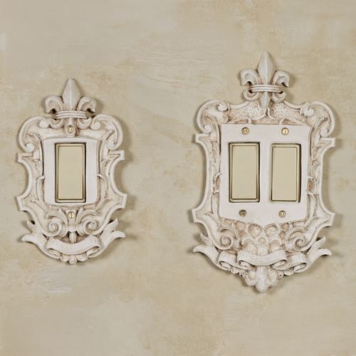 The Royal Old World White Fleur-de-Lis Dimmer/Rocker Switchplates will give your rooms an opulent air. These handcrafted resin switchplates feature flowing curves, fleur-de-lis finials on top, and scrolled banners on the bottom. A handpainted Old World white finish completes these regal pieces. Specify Single Dimmer/Rocker, 5"Wx8.25"H; or Double Dimmer/Rocker, 6.25"Wx10.5"H. Do not over-tighten the screws.
