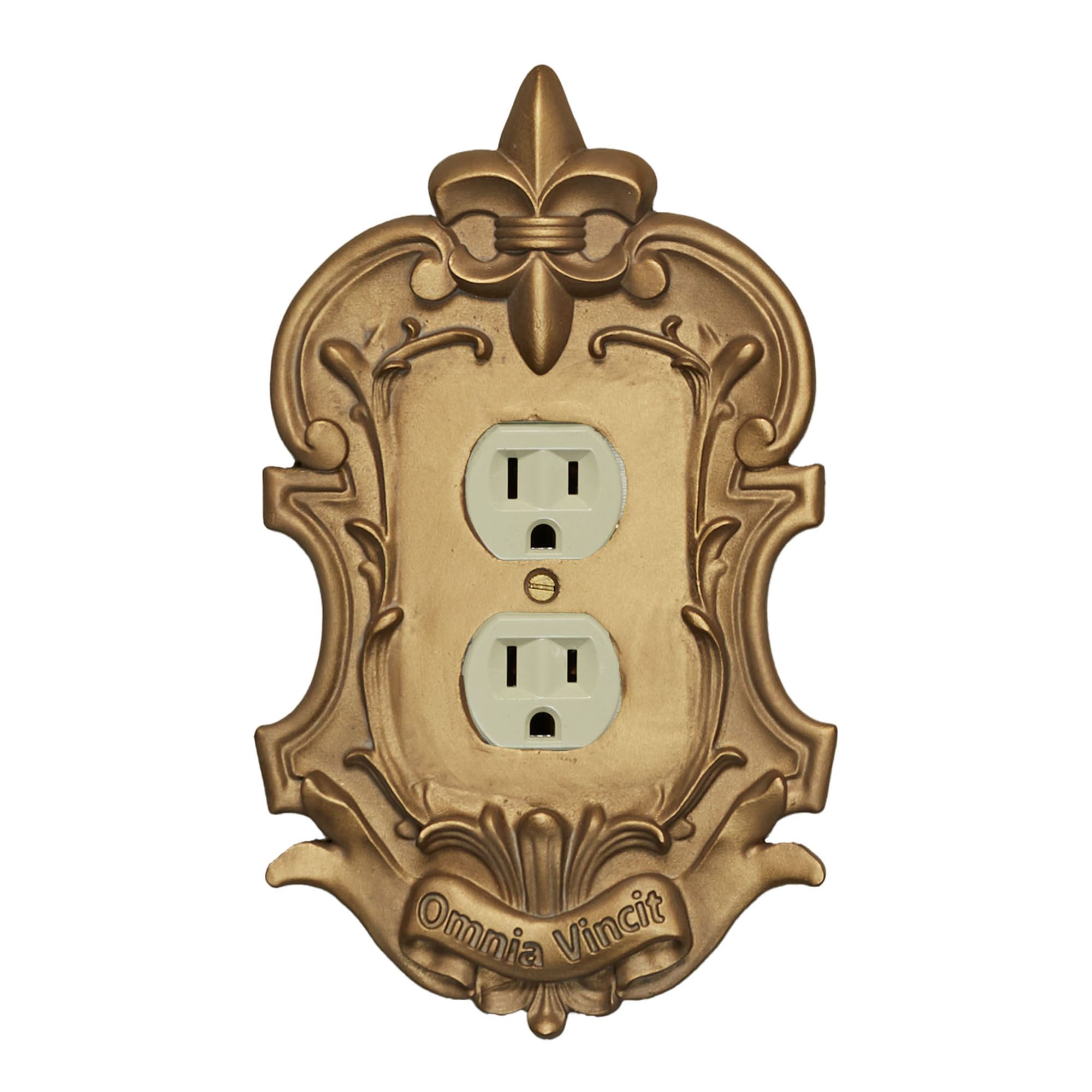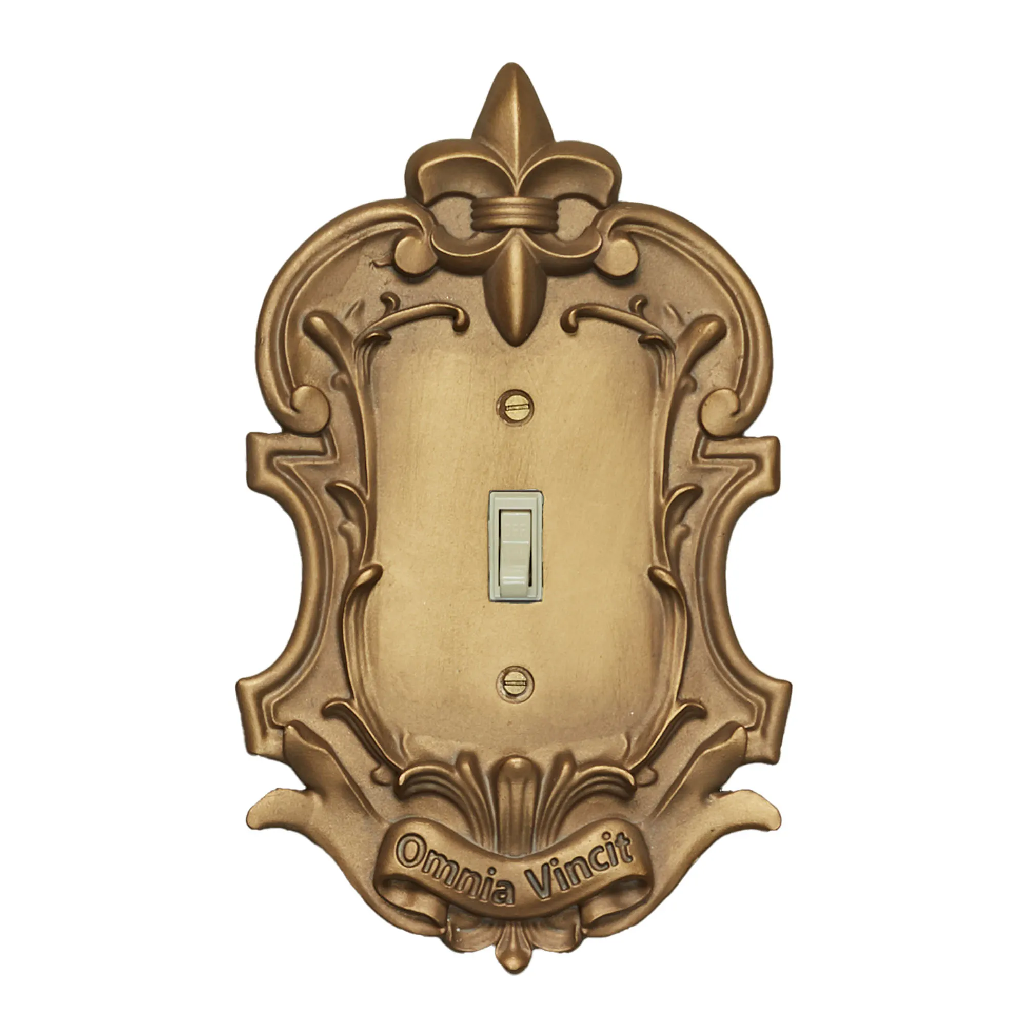 The Royal Aged Gold Fleur-de-Lis Switchplates add a regal finishing touch to a room. Each resin switchplate features stately scrolls, a grand banner, and a lovely fleur-de-lis topper. Specify Single Switch, Double Switch, Single Outlet (two sockets), Single Dimmer/Rocker Switch, or Double Dimmer/Rocker Switch. Do not over-tighten the screws.