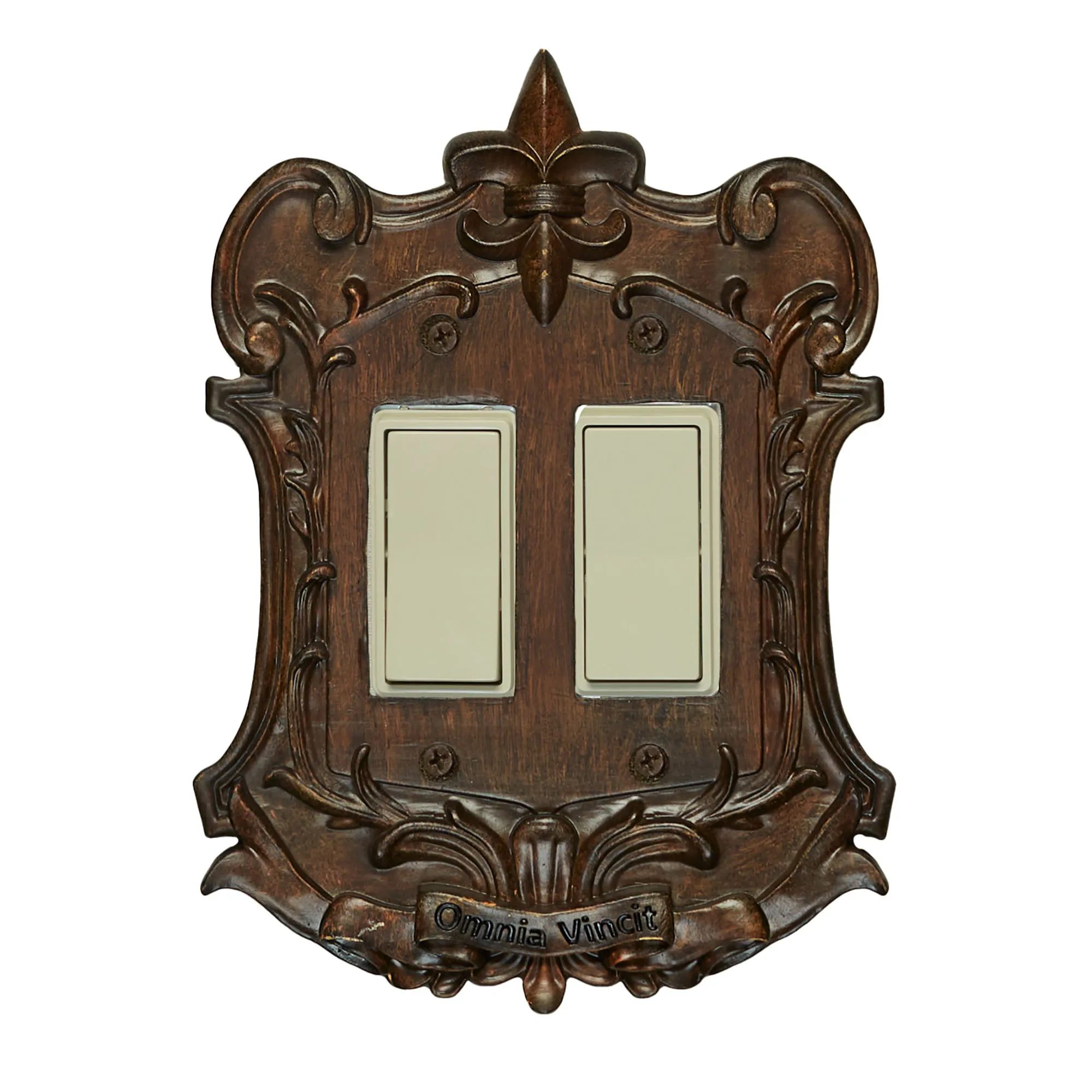 The Royal Brandywine Fleur-de-Lis Switchplates add a regal finishing touch to a room. Each resin switchplate features stately scrolls, a grand banner, and a lovely fleur-de-lis topper. Specify Single Switch, Double Switch, Single Outlet (two sockets), Single Dimmer/Rocker Switch, or Double Dimmer/Rocker Switch. Do not over-tighten the screws.