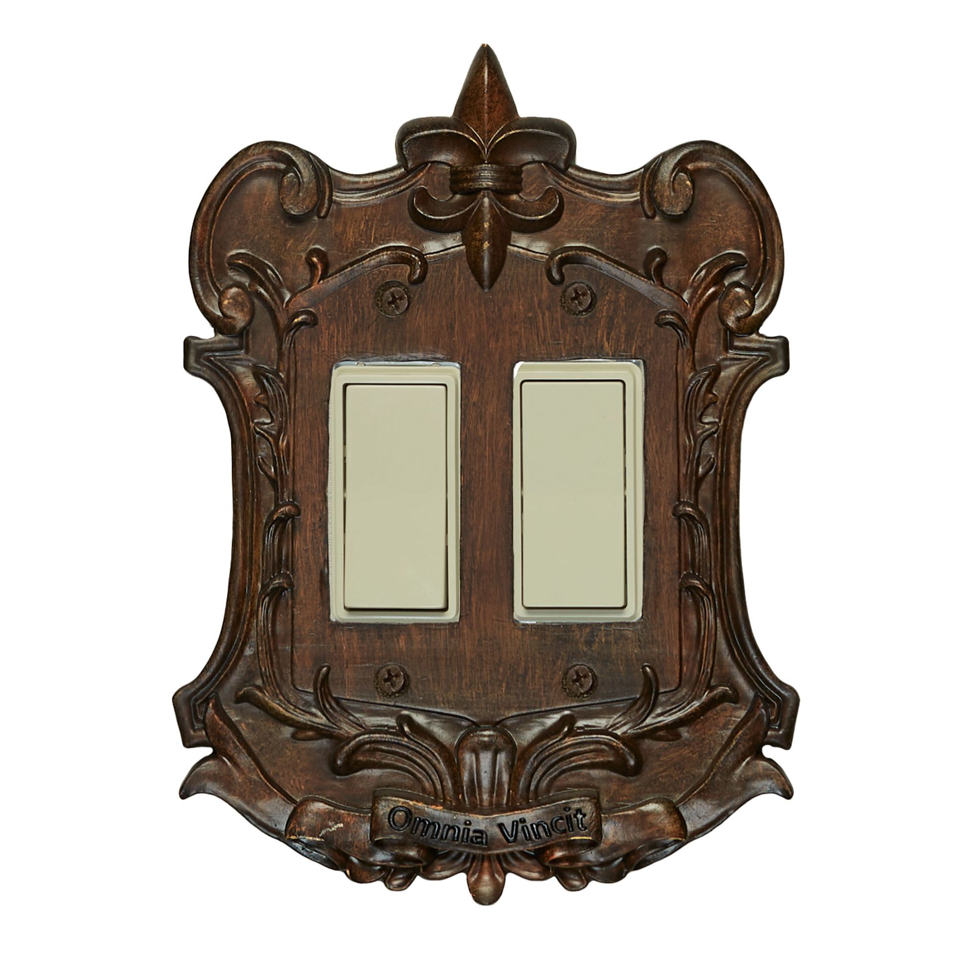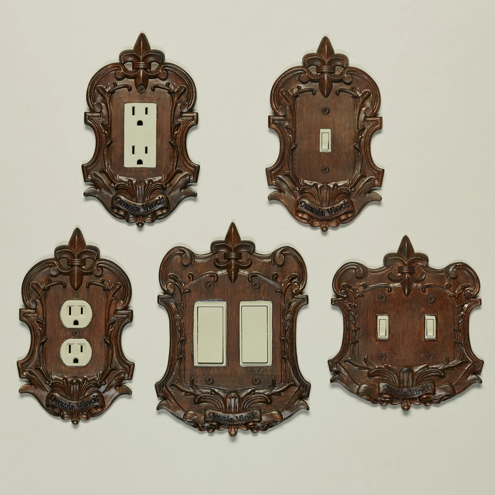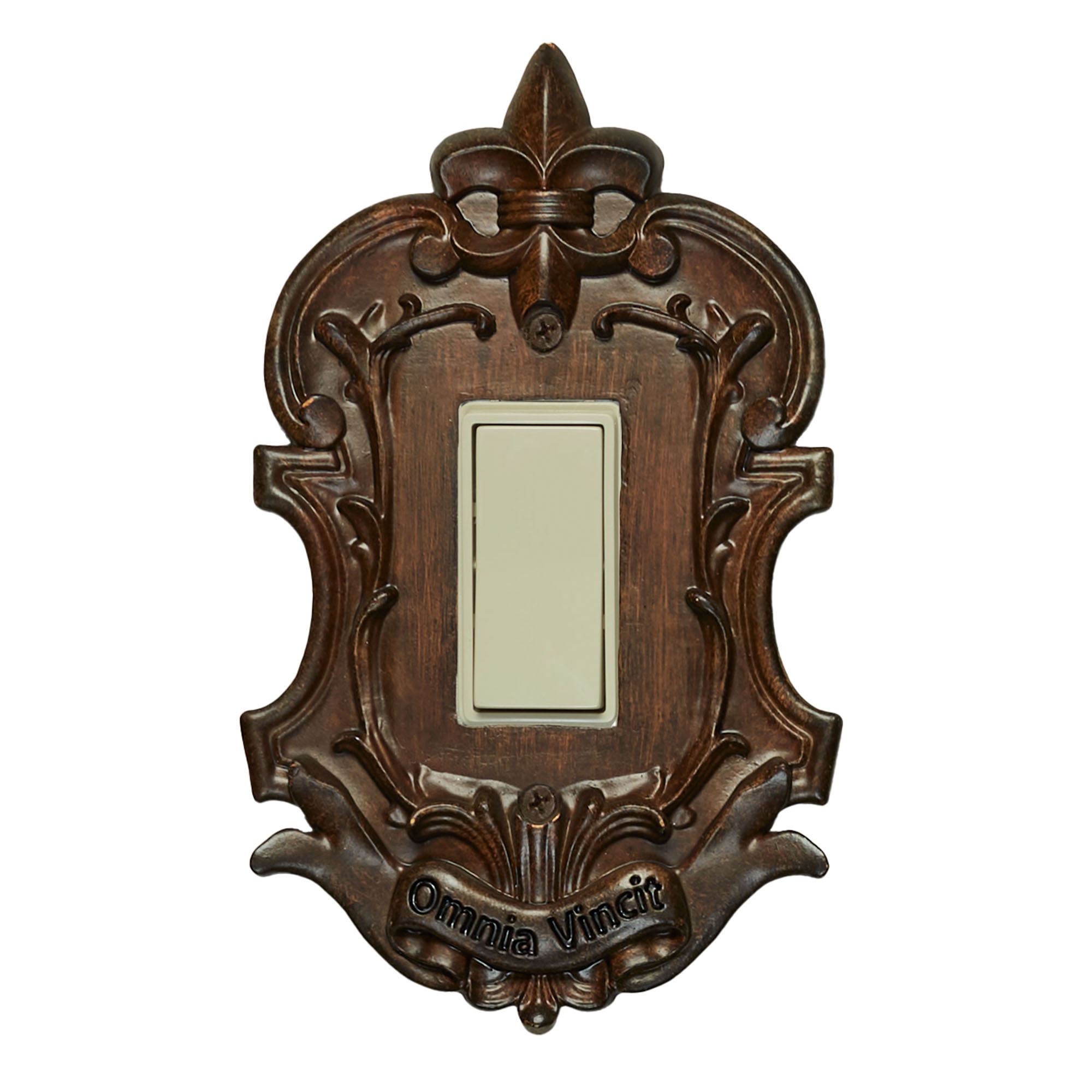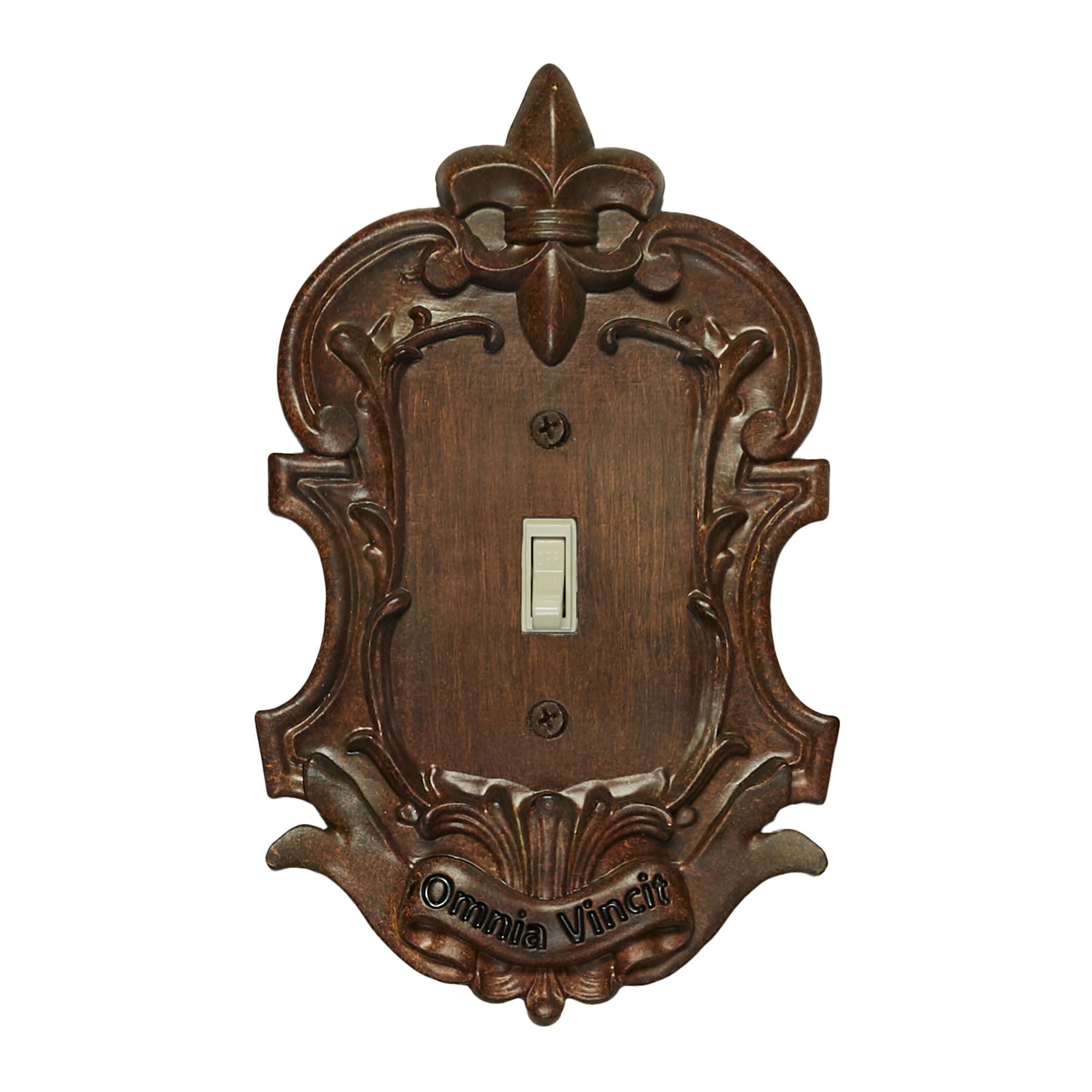 The Royal Brandywine Fleur-de-Lis Switchplates add a regal finishing touch to a room. Each resin switchplate features stately scrolls, a grand banner, and a lovely fleur-de-lis topper. Specify Single Switch, Double Switch, Single Outlet (two sockets), Single Dimmer/Rocker Switch, or Double Dimmer/Rocker Switch. Do not over-tighten the screws.