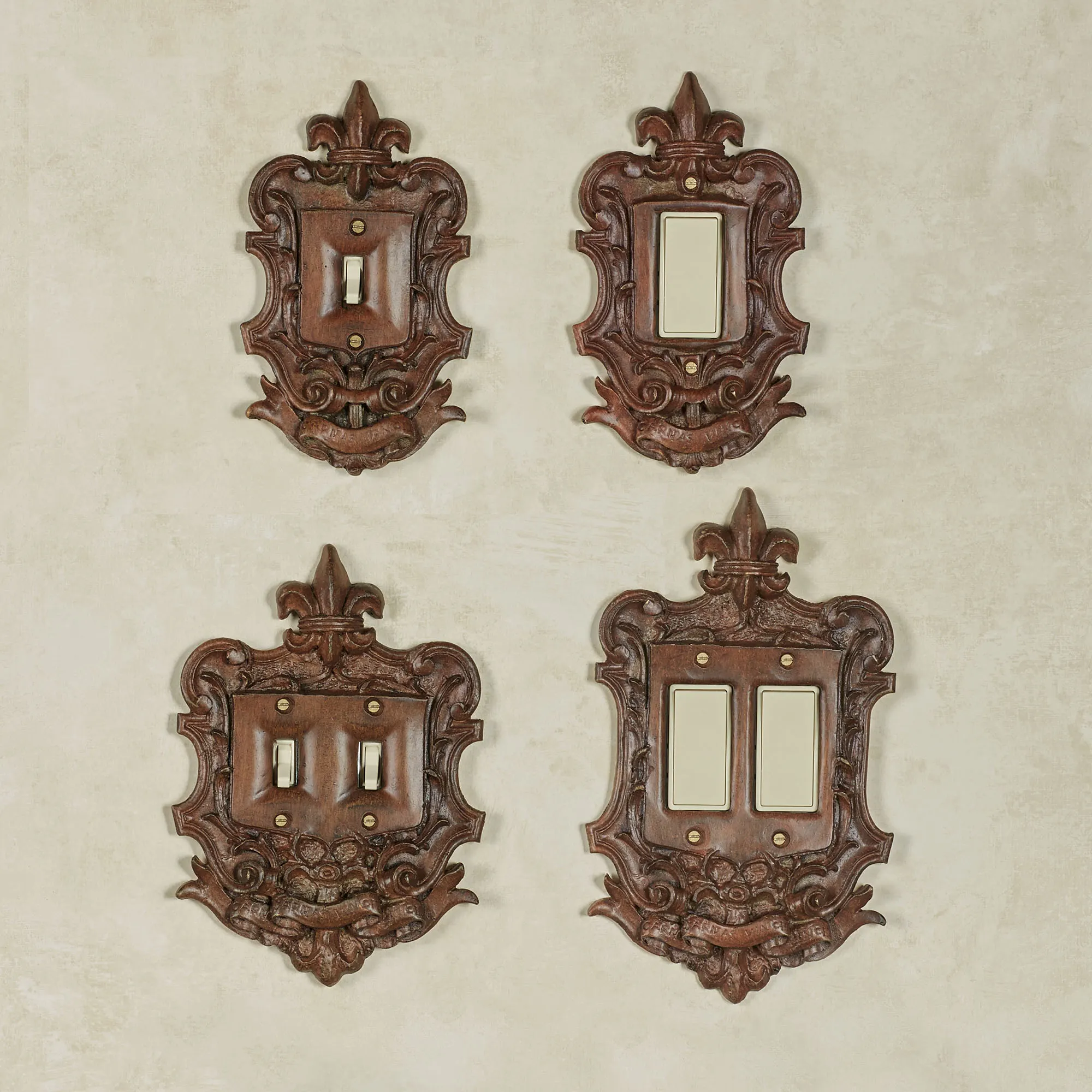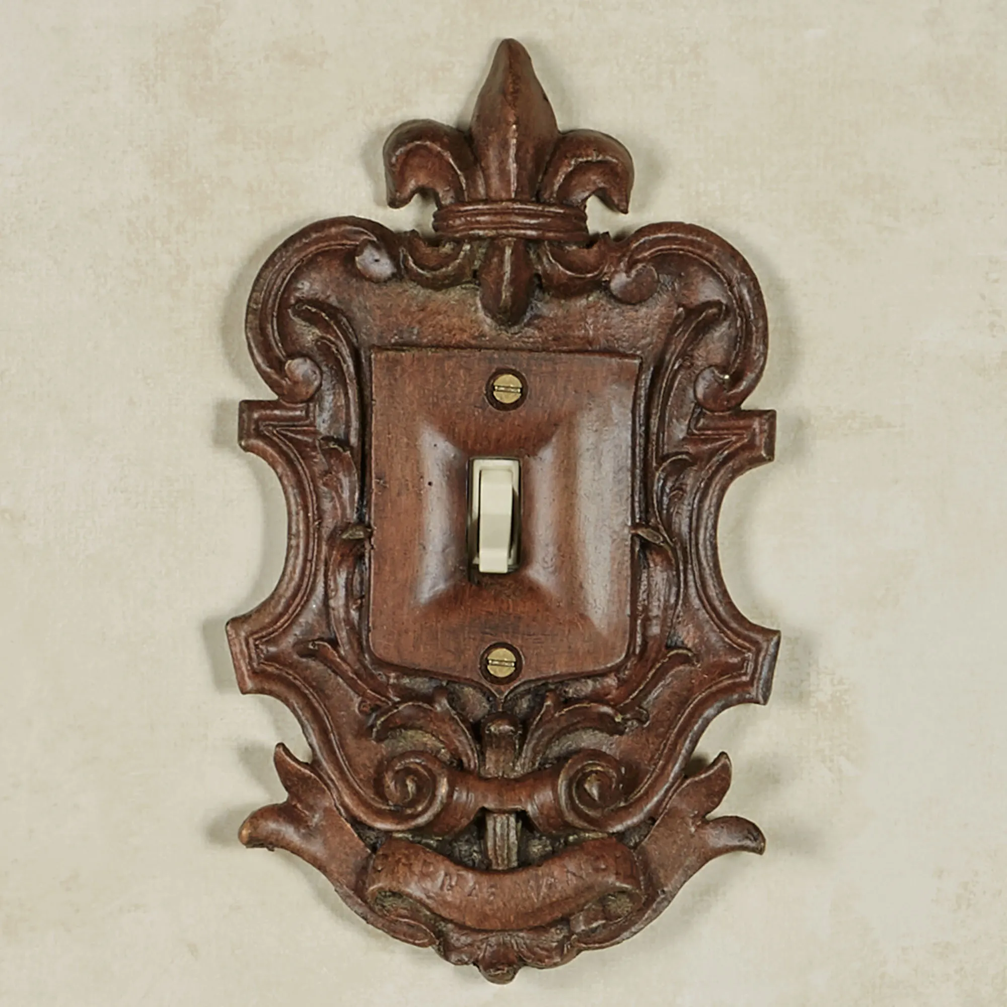 The Royal Brandywine Fleur-de-Lis Switchplates will give your rooms an opulent air. Handcrafted resin switchplates feature flowing curves, fleur-de-lis finials on top, and scrolled banners on the bottom. A handpainted brandywine finish completes these regal pieces. Specify Single Switch, Single Dimmer/Rocker, or Double Dimmer/Rocker. Click on the Sizes tab for measurements. Do not over-tighten screws.