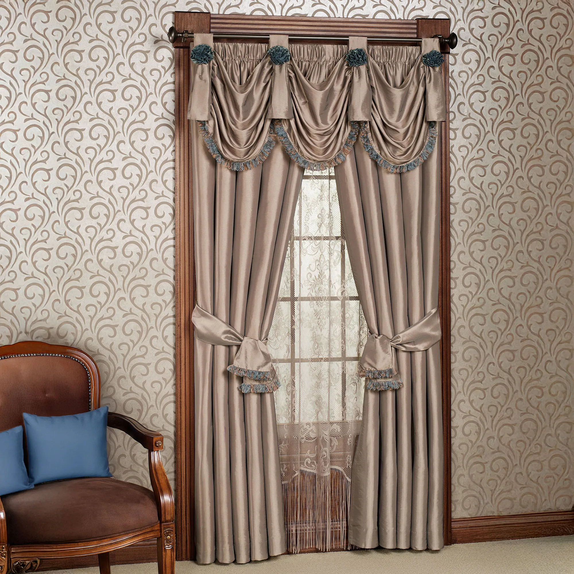 Window Treatment is solid dusky taupe. Lined Curtains include 48" sash tiebacks with ribbon loop fringe; 3" rod pockets. Curtains are available in two lengths. Regent Swag Valance has scoop swags, ascot flaps accented with provincial blue fabric roses, and ribbon loop fringe. Flaps form 3" tabs for rod enclosure. Choose 54"W (three-swag valance) or 72"W (four-swag valance).