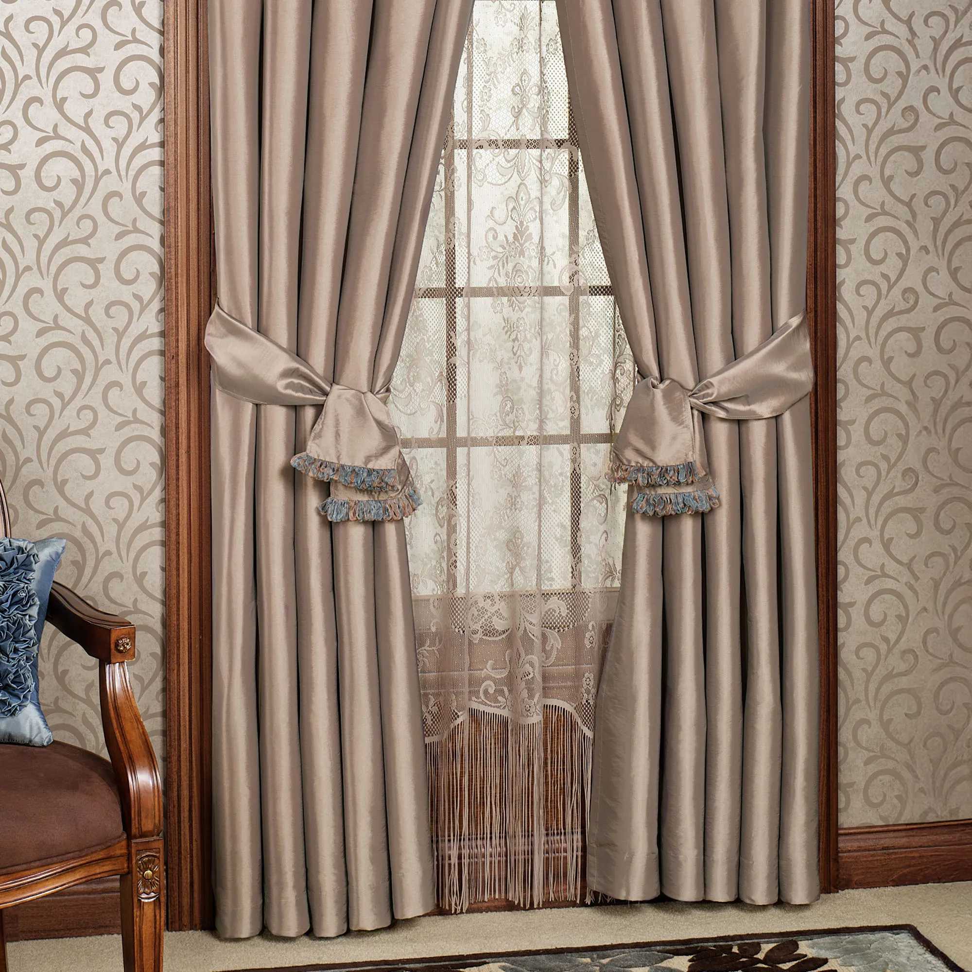 Royale Window Treatment will treat you to all splendor you crave. Polyester/nylon window treatment includes hues of dusky taupe and provincial blue. Selected pieces have multicolored, sparkling, iridescent ribbon loop fringe. Designed by Touch of Class(R)!