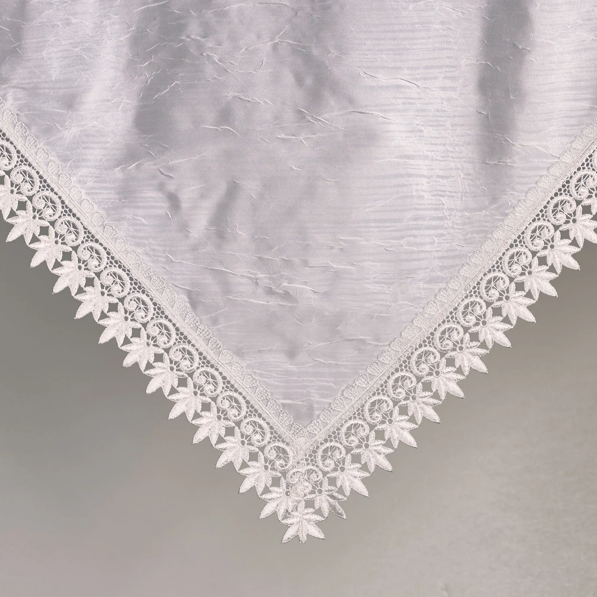 The unique charm of the Rozelle Window Treatment lends itself to a love of fanciful details. Each solid color, semi-sheer crushed voile polyester accent features lustrous macrame lace trim for a delicate touch. Specify Curtain Panel, 56"W; or Ascot Valance, 40"Wx25"L. Panel features a scalloped bottom edge; tieback is included. Rod pockets measure 1.5". Machine washable. Imported.