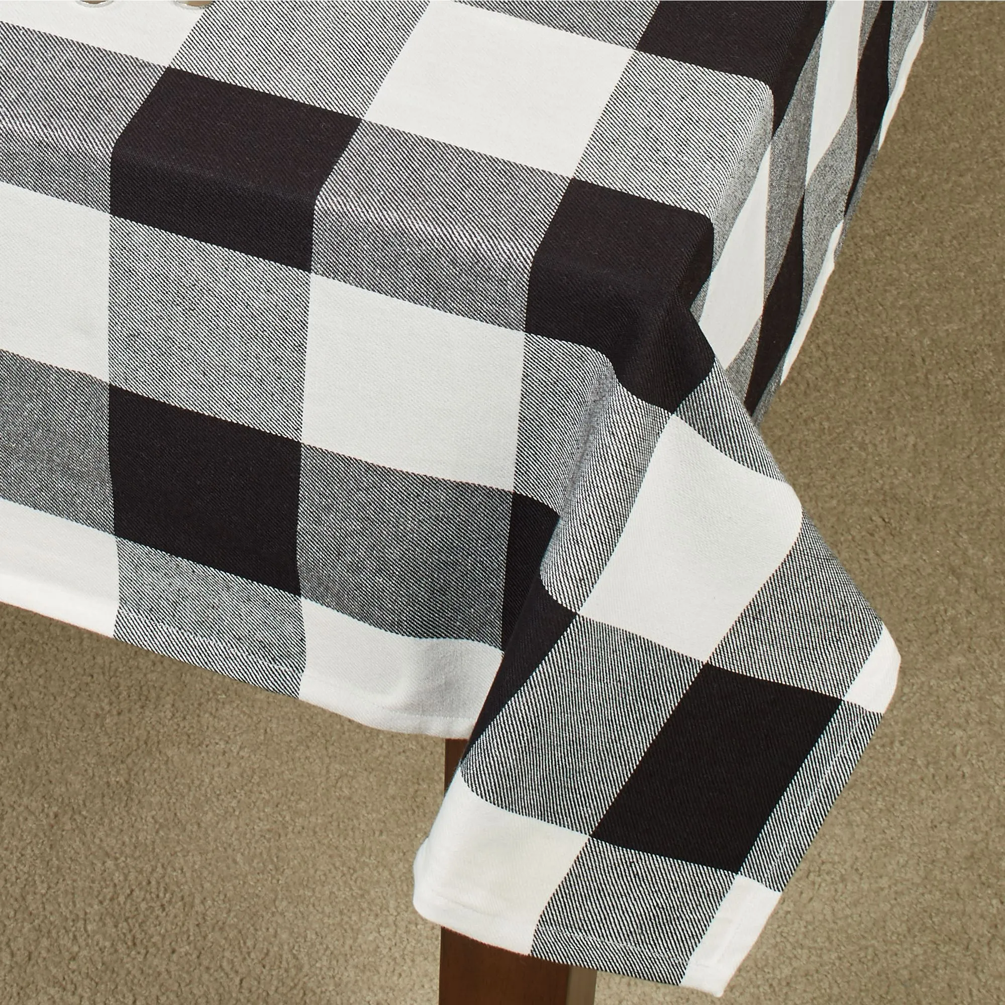 The distinctive check pattern on the Rustic Buffalo Plaid Black and White Table Linens decorates with classic farmhouse charm. These cotton table linens have a black and white pattern and tailored edges. Measurements are approximate. Oblong Tablecloth is 65"W; available in multiple lengths. Square Tablecloth is available in two sizes. Table Runner is 16"Wx72"L (no longer available). Napkins are 20" sq. each and are sold in a set of four. Machine washable. Imported.