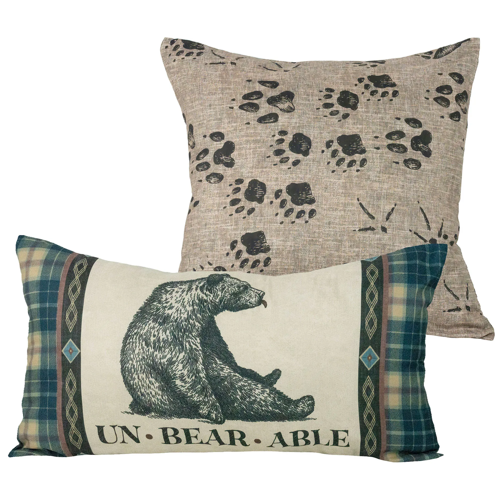 The Pillow Set of Two includes one square pillow and one rectangle pillow. Pillow fill is polyester. Spot clean. The tailored square pillow has black paw prints on a woven, mingled warm gray and light cream background. The tailored rectangle pillow has a sitting black bear and the word "Un Bear Able," along with Southwestern and plaid designs.