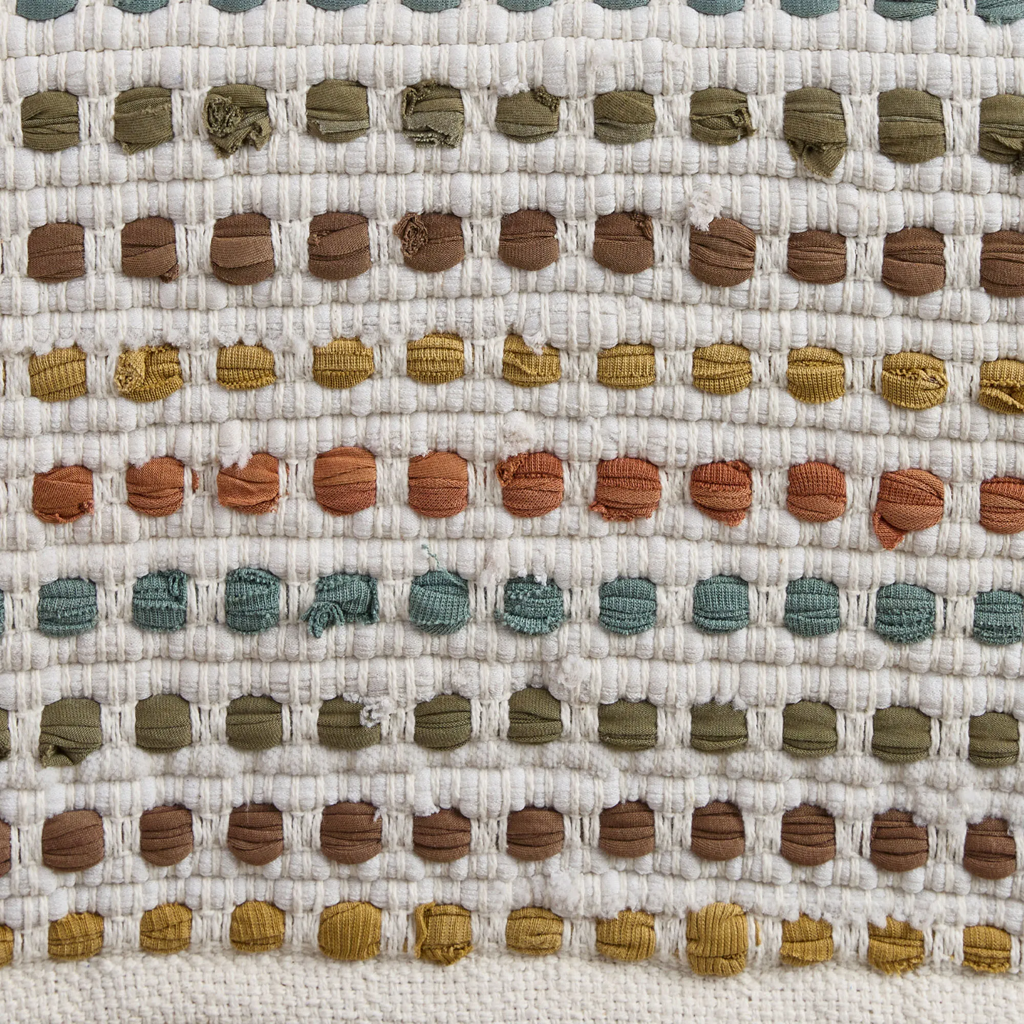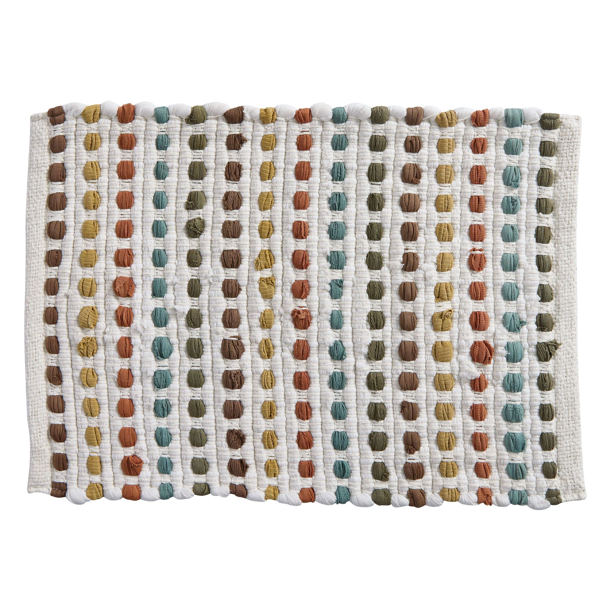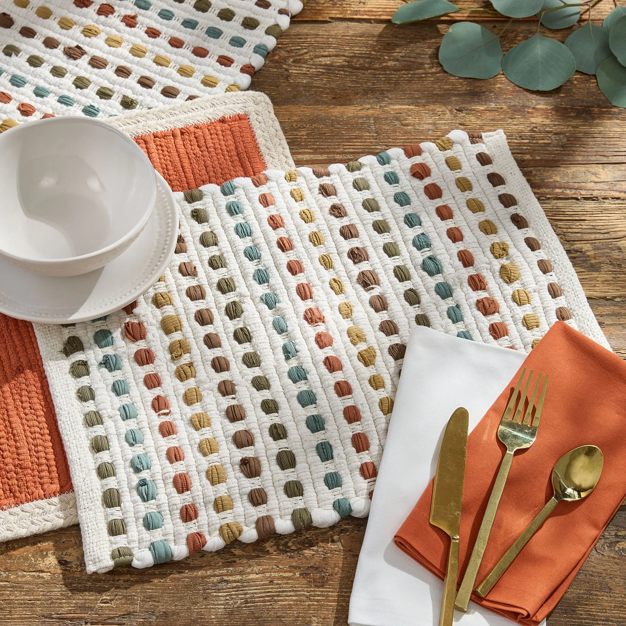 Color and charm pattern the Ryland Chindi Table Linens. Woven from cotton, each white design features a dimensional, textured weave filled with strips of sage, slate blue, rust, ginger, and chocolate brown. Table Runner is available in two sizes. Placemats are 19"x13" each; sold as a four-piece set. Hand wash. Imported. The orange trivet shown is not available.