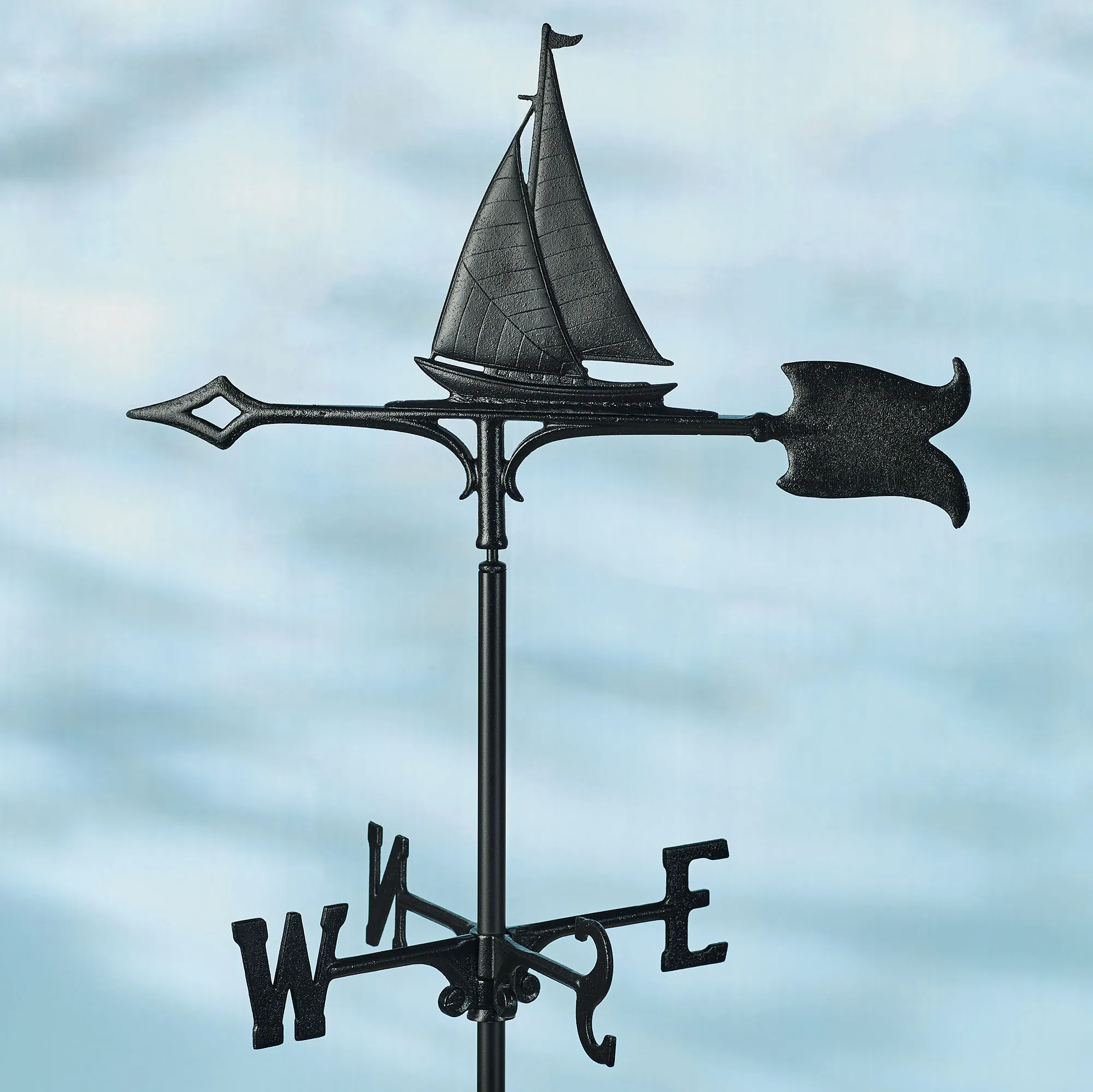 The Sailboat Garden Weathervane Stake keeps an eye on the wind while adding a touch of charm. Finished in classic black, the aluminum design features bold "N," "E," "S," and "W" indicators below the spinning arrow and detailed, stamped decorative design. Overall, the arrow itself measures 23.5"Wx4.5"H. A sailboat tops the vane. The sailboat accent is 8"Wx10"H; the weathervane measures 68"H overall. The staked weathervane can be driven into the ground to your desired height and is perfect outdoors year round. USA/Imported.