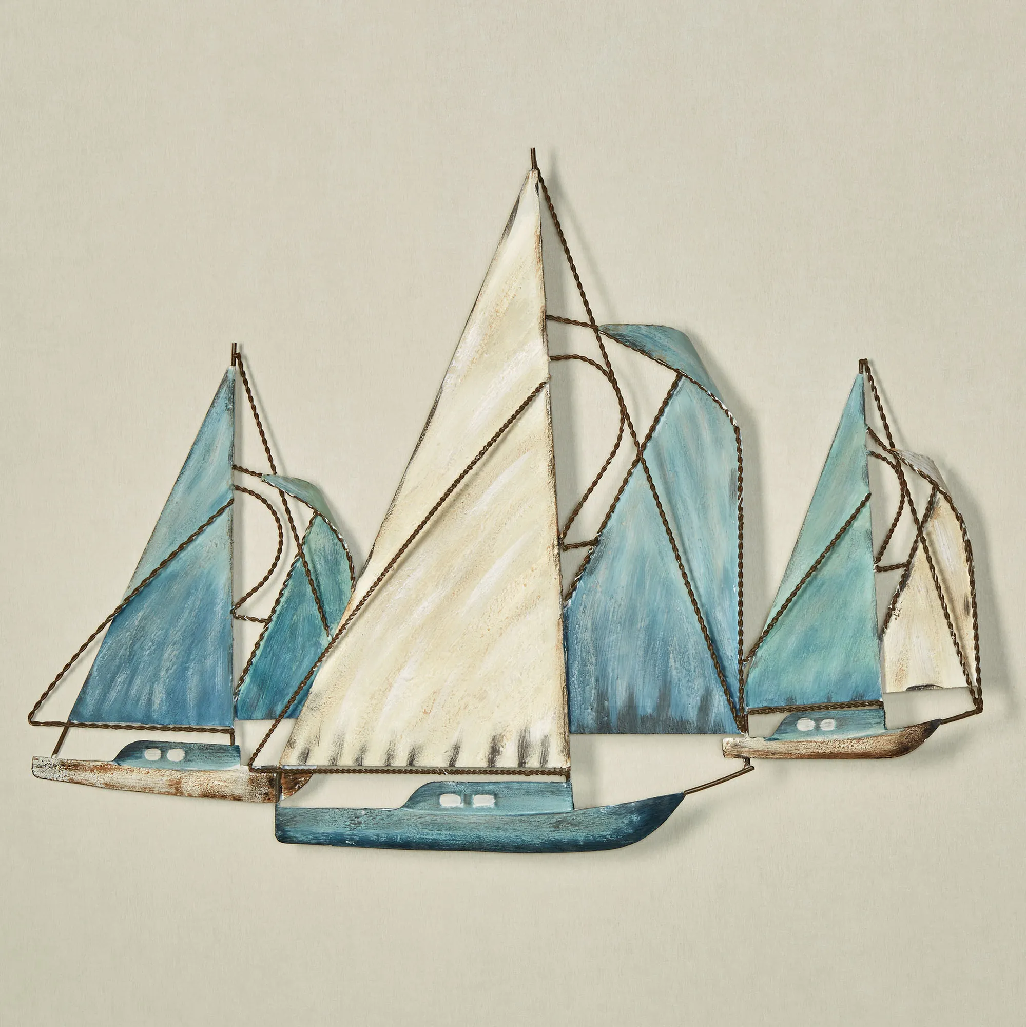 Journey out to sea with the Sailboat Wall Sculpture. Made of metal with a powder-coat finish, this weather- and fade-resistant nautical wall art features five sailboats with fluttering sails and streamlined hulls. Colors include soft blue, ivory, and white. Due to the handcrafted nature, minor variations may occur. For indoor or outdoor year-round use. Measures 41"Wx2"Dx29"H.