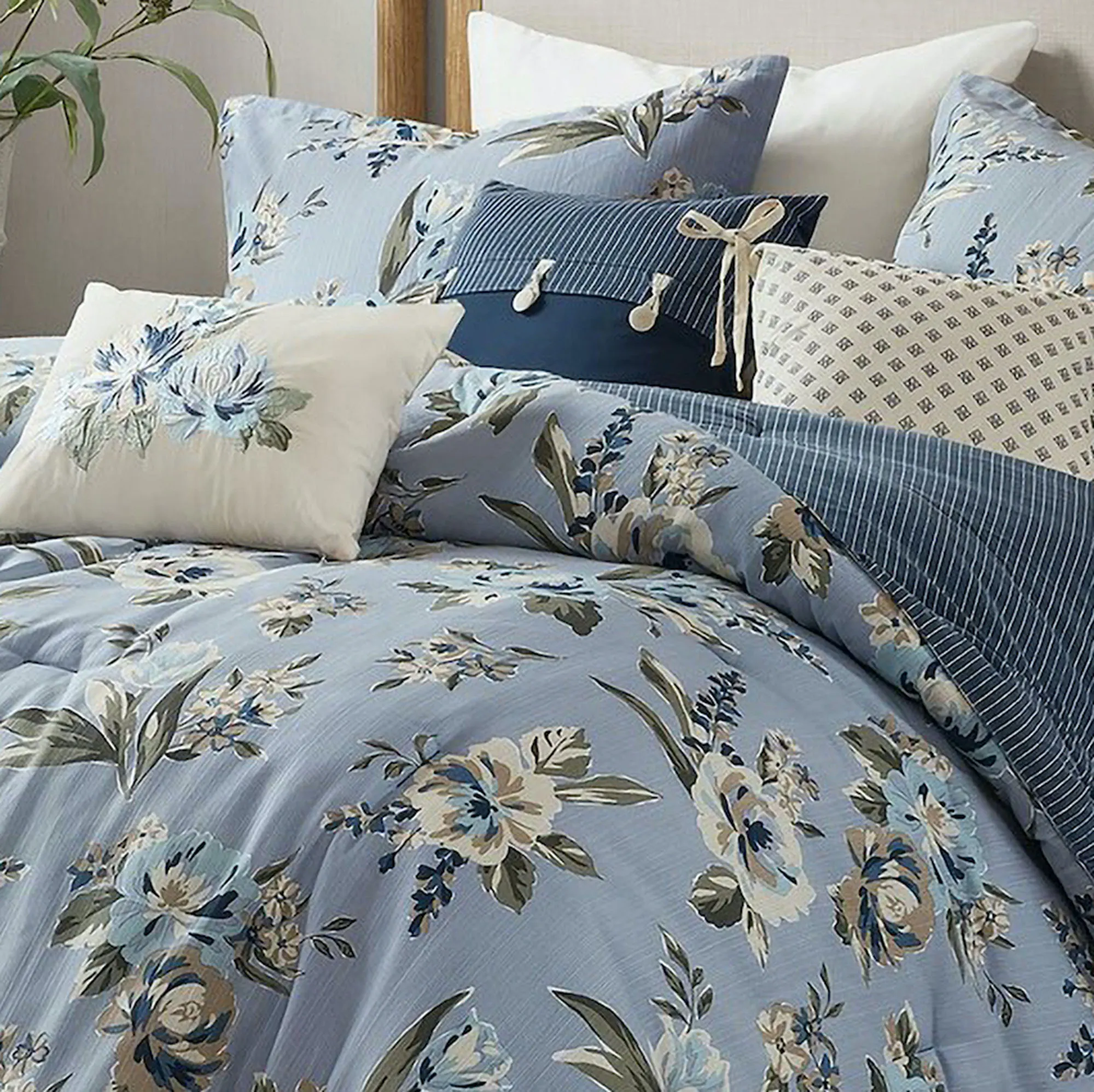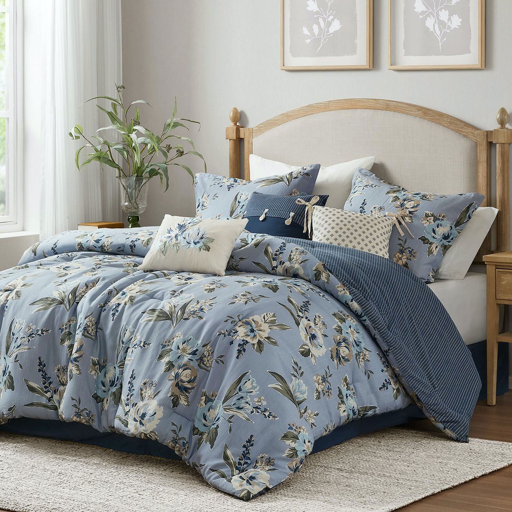 Let the spirit of spring bloom in your bedroom with the Salara Floral Bedding from Madison Park. The 7-piece Bed Set includes a comforter, 2 shams, a bedskirt, and 3 accent pillows. The cotton/polyester comforter features a vintage flower print in blue, eggshell, brown, white, and sage on a textured blue slubbed ground. Comforter reverses to dark blue polyester microfiber with white pinstripes. Click on the Details tab to read about the other items. Fill is polyester. Machine washable; spot clean the pillows. Imported.