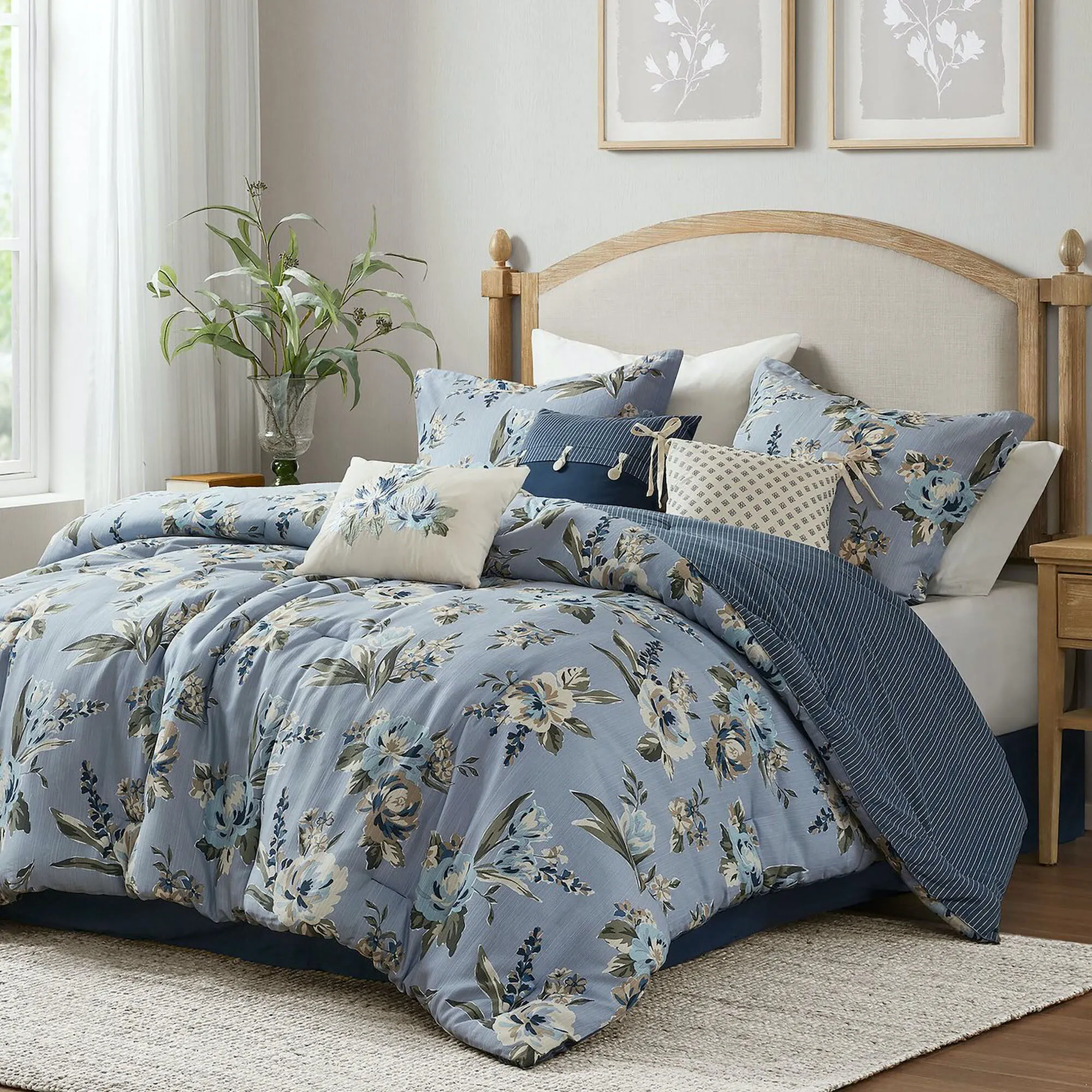 The tailored comforter has a vintage flower print on a textured blue slubbed background and reverses to a dark blue polyester microfiber background with white pinstripes. The flanged shams mimic the comforter and have French back closures. The tailored, polyester bedskirt is blue with split corners and a 15" drop.