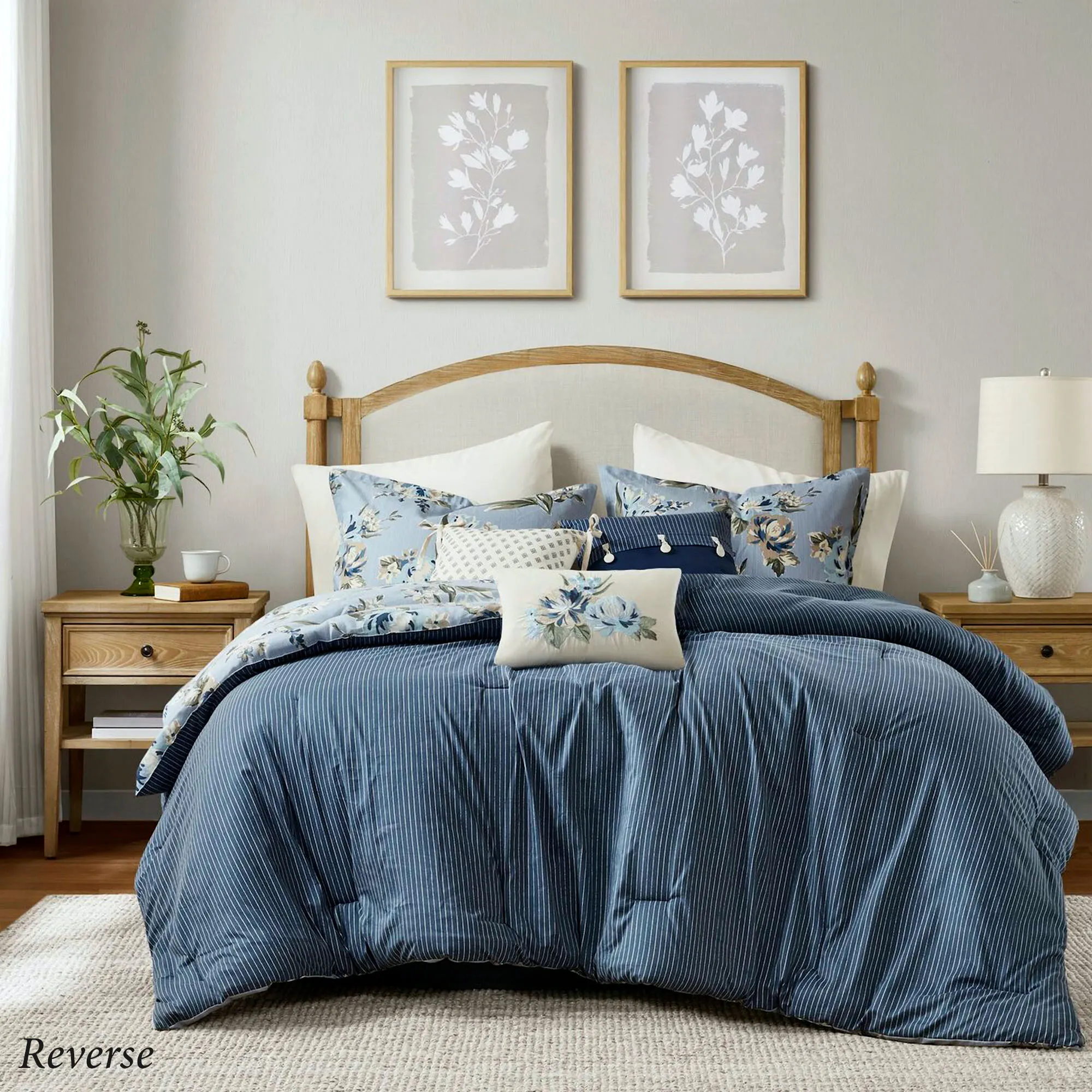 • Comforter reverses to dark blue with white pinstripes