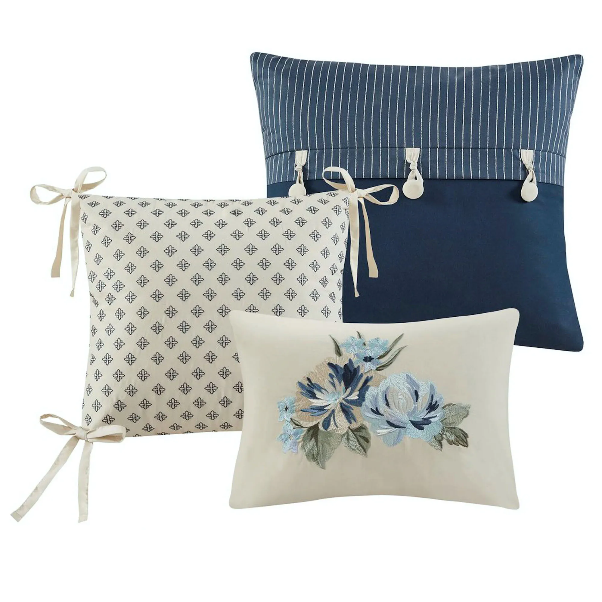 Spot clean the polyester pillows. The tailored 18" square pillow has pinstripes, button accents, a solid blue bottom, and a zipper closure. The tailored rectangle pillow has embroidered florals on an eggshell background. The tailored 16" square pillow has mini medallions printed on an eggshell background and corner ties.
