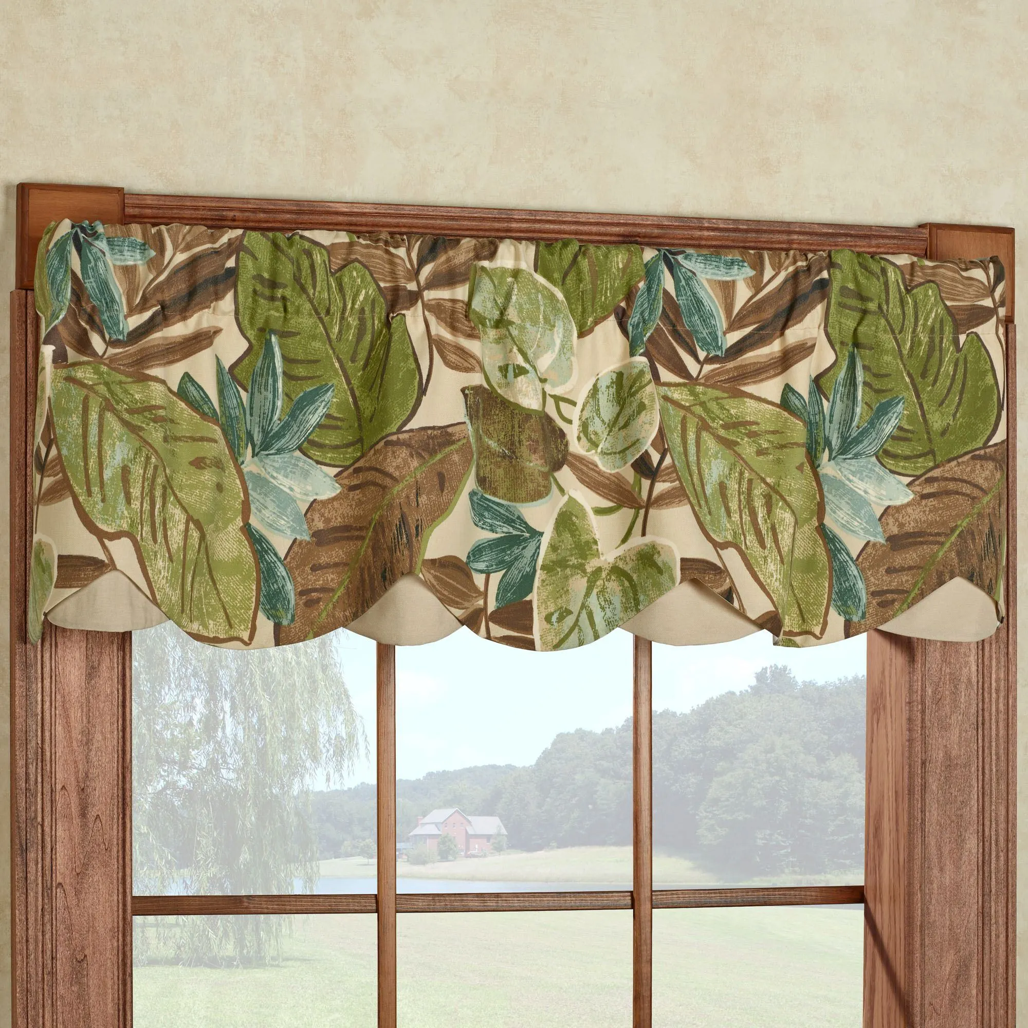 The Saliceto Tropical Scalloped Petticoat Valance is made of 100% polyester and lined with polyester/cotton. Layered window valance has a solid-color straw background, accented with large tropical leaves in shades of brown, cream, tan, celadon, peridot, and blue-green. Rod pocket is 3". Petticoat valance is 52"Wx15"L. Machine wash.