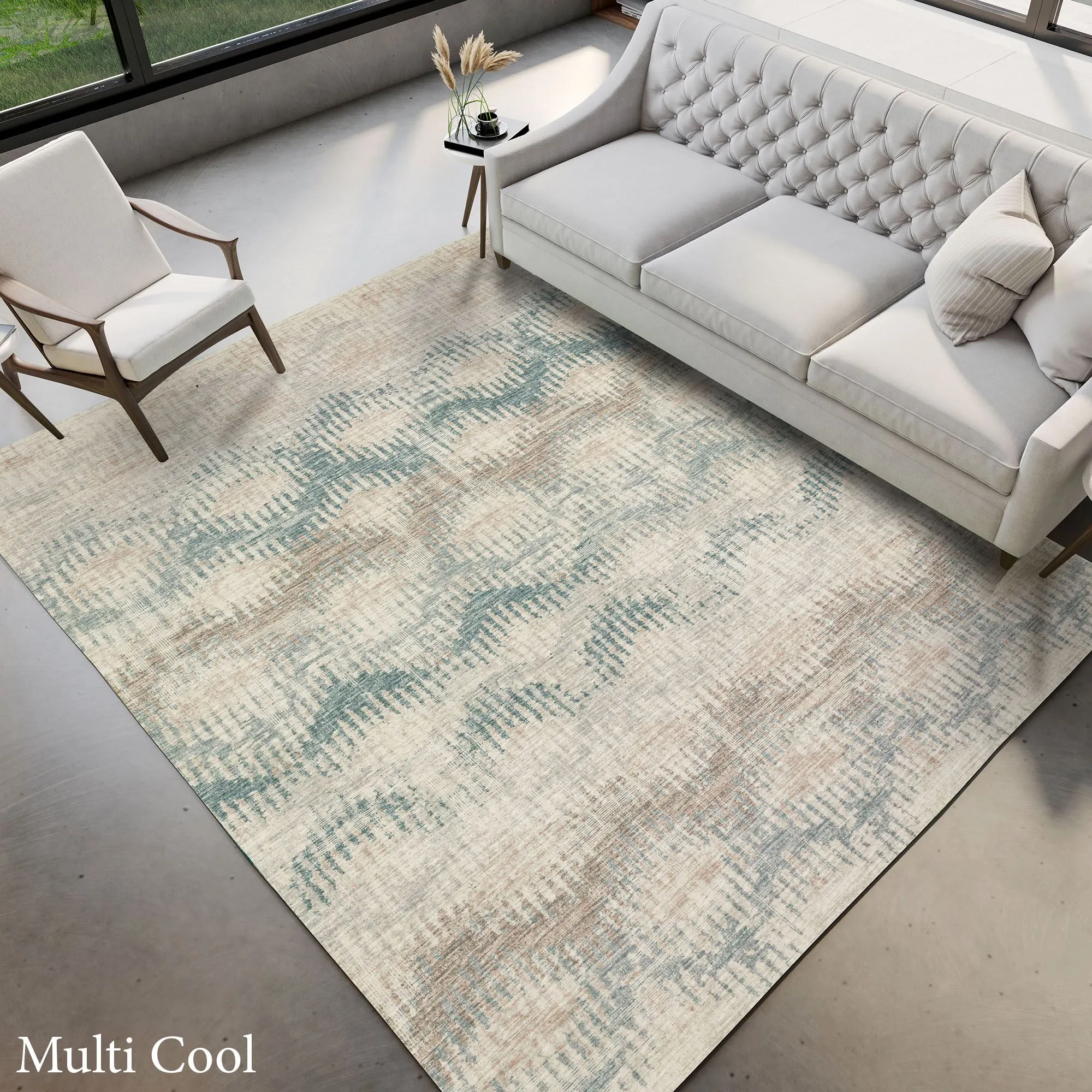 Abstract style is defined by the wavy pattern on the Saltash Rug. Power-loomed of polyester microfiber, this luxuriously soft and plush area rug, 1" thick, has a cloth-covered latex backing. Blue includes shades of midnight, dark and light denim, ivory, tawny, charcoal, and gray. Multi-Cool includes colors of blue, cream, and light tan. Multi-Warm includes hues of orange, red, gold, and brown. Tan includes shades of tan, light brown, beige, light blue, and gray. We recommend professional cleaning by a rug cleaner. Crafted in the USA using the state-of-the-art Prismatic Color Processing Technology.