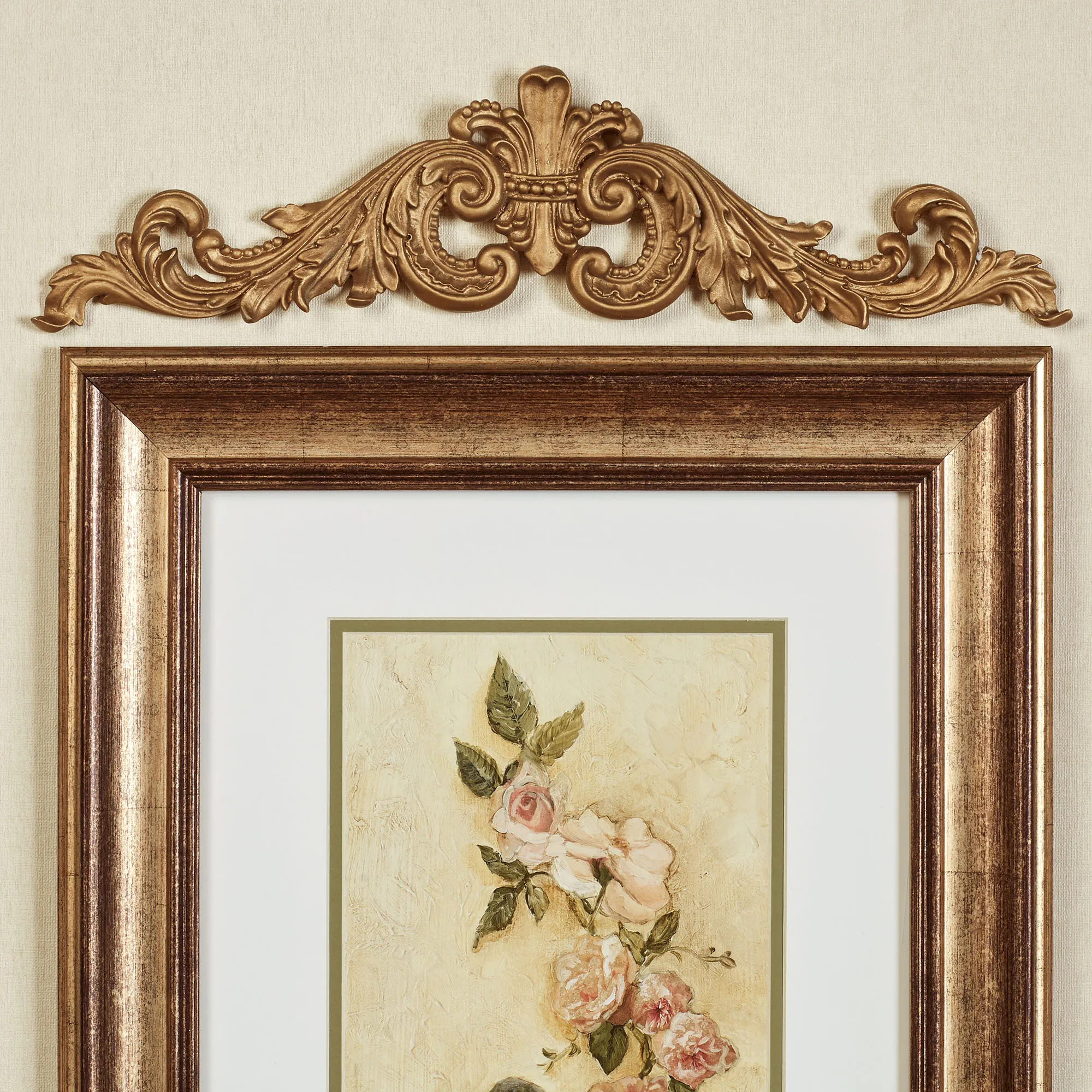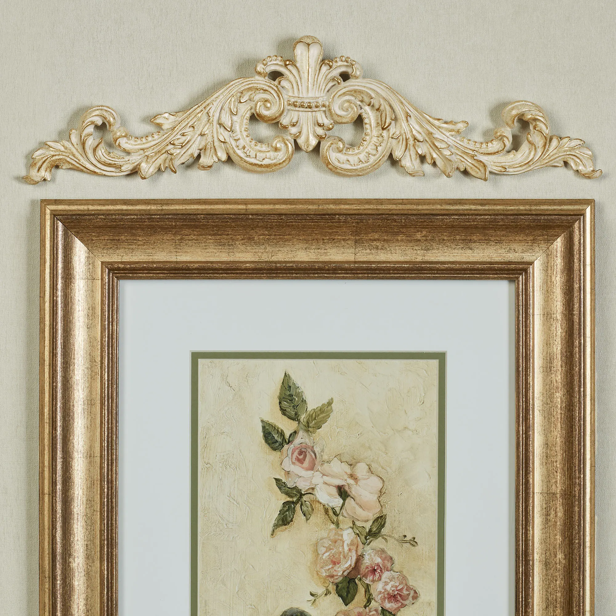 Crown an artwork or photograph with the grand Salvatar Scroll Picture Topper. Crafted from resin, the classic design features a center fleur-de-lis and flourishing acanthus leaves. Measures 17"Wx1"Dx4.5"H.