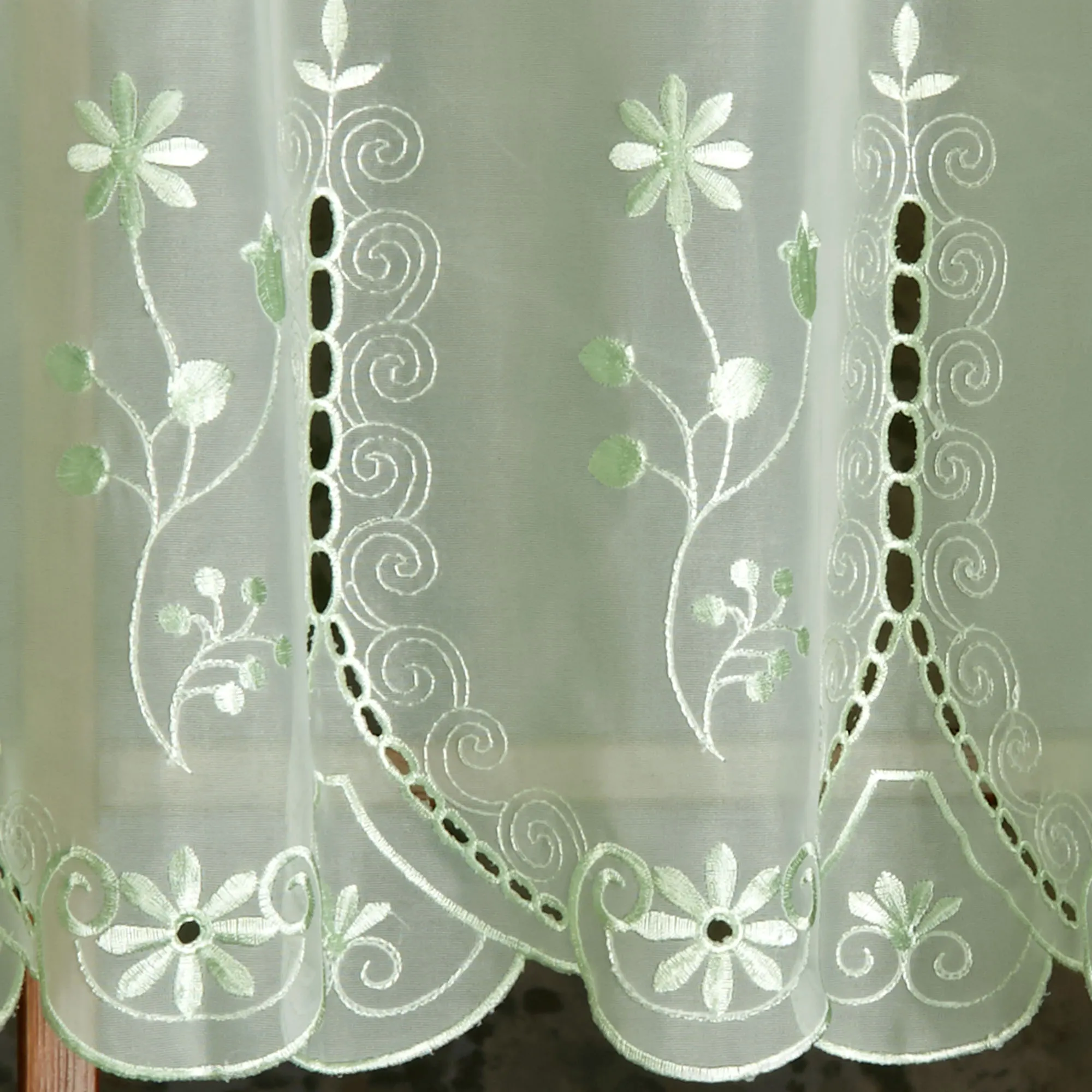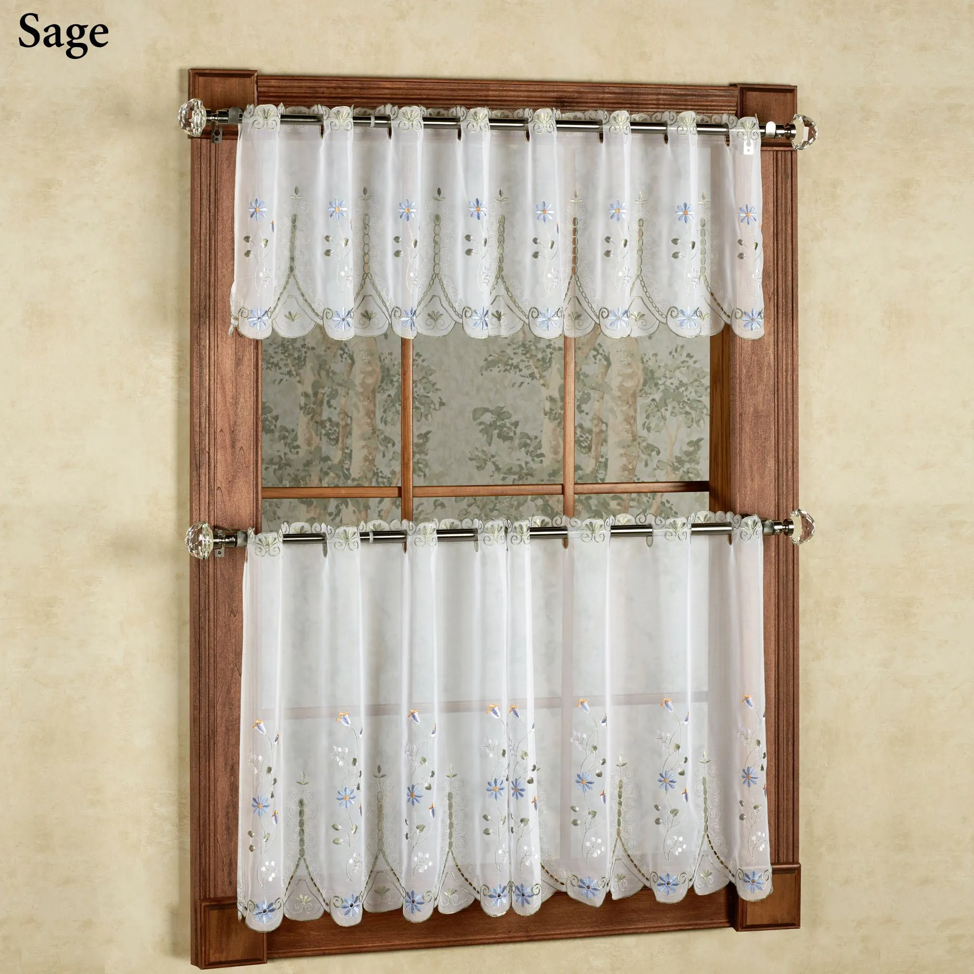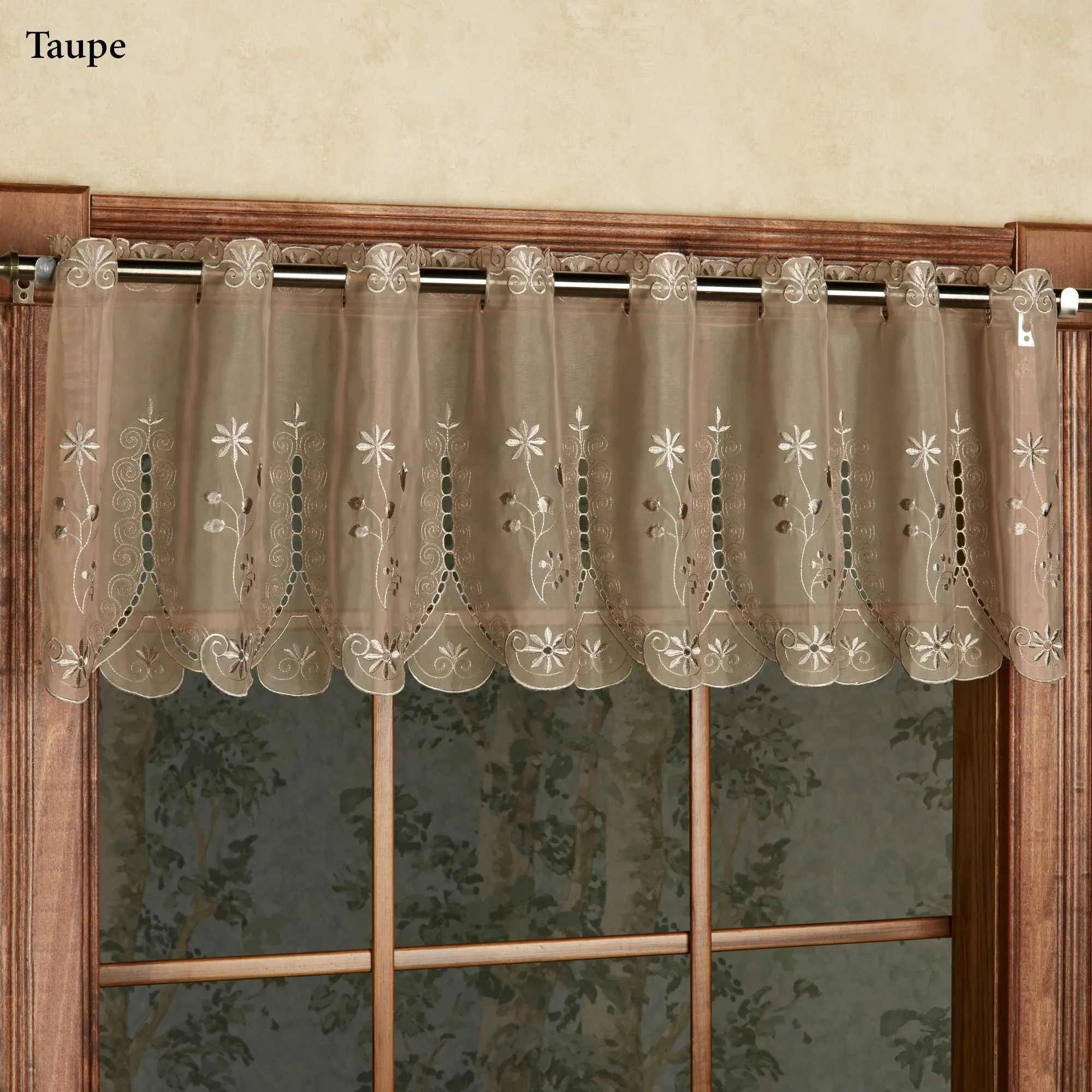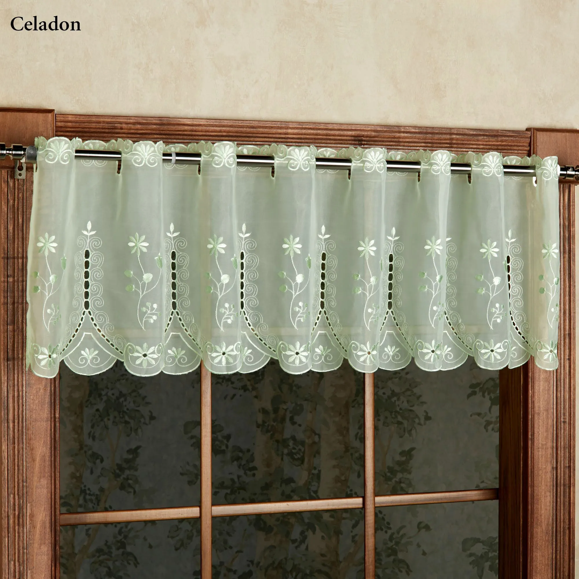 The polyester Samantha Sheer Tier Window Treatment will add a touch of formality and elegance to your decor with cutwork designs, beautiful floral embroidery on voile, and scalloped edges. Specify Tier Pair or Valance. Tailored Tier Pair is 59"W; available in two lengths. Valance is 59"Wx13"L. Choose Pearl, Black, Celadon, Lavender, Sage, Taupe, or White (see Details). Sage has a white background. Holes for cafe rods are 1.5"L. Machine wash. Imported.