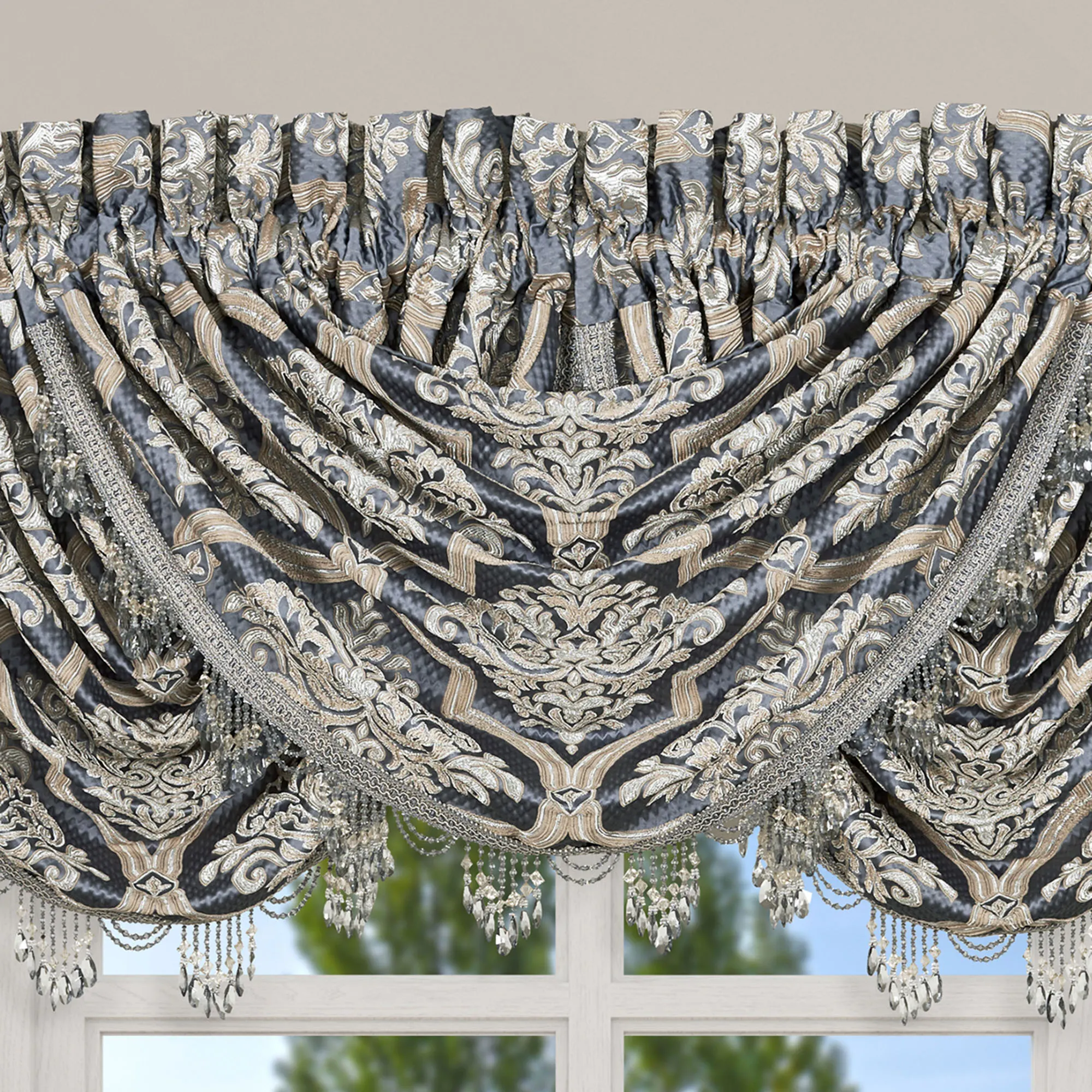 Classic beauty flourishes alongside intriguing texture throughout the San Marino Window Treatment. From J. Queen New York, the jacquard-woven polyester window treatment features antique white and satin gold leafy damask encased in color-coordinating elegant quatrefoil borders. A steel blue diamond matelasse ground adds further finery. The lined window treatment has 3" rod pockets. Specify Wide Curtain Pair or Waterfall Valance (no longer available). The Wide Curtain Pair has tailored edges and includes tiebacks. Each Waterfall Valance has a gimp-trim edge with teardrop crystal beaded fringe. We recommend one valance for every 12"-15" of window width. Dry clean only. Imported. The curtain pair width is the total width of two panels together.