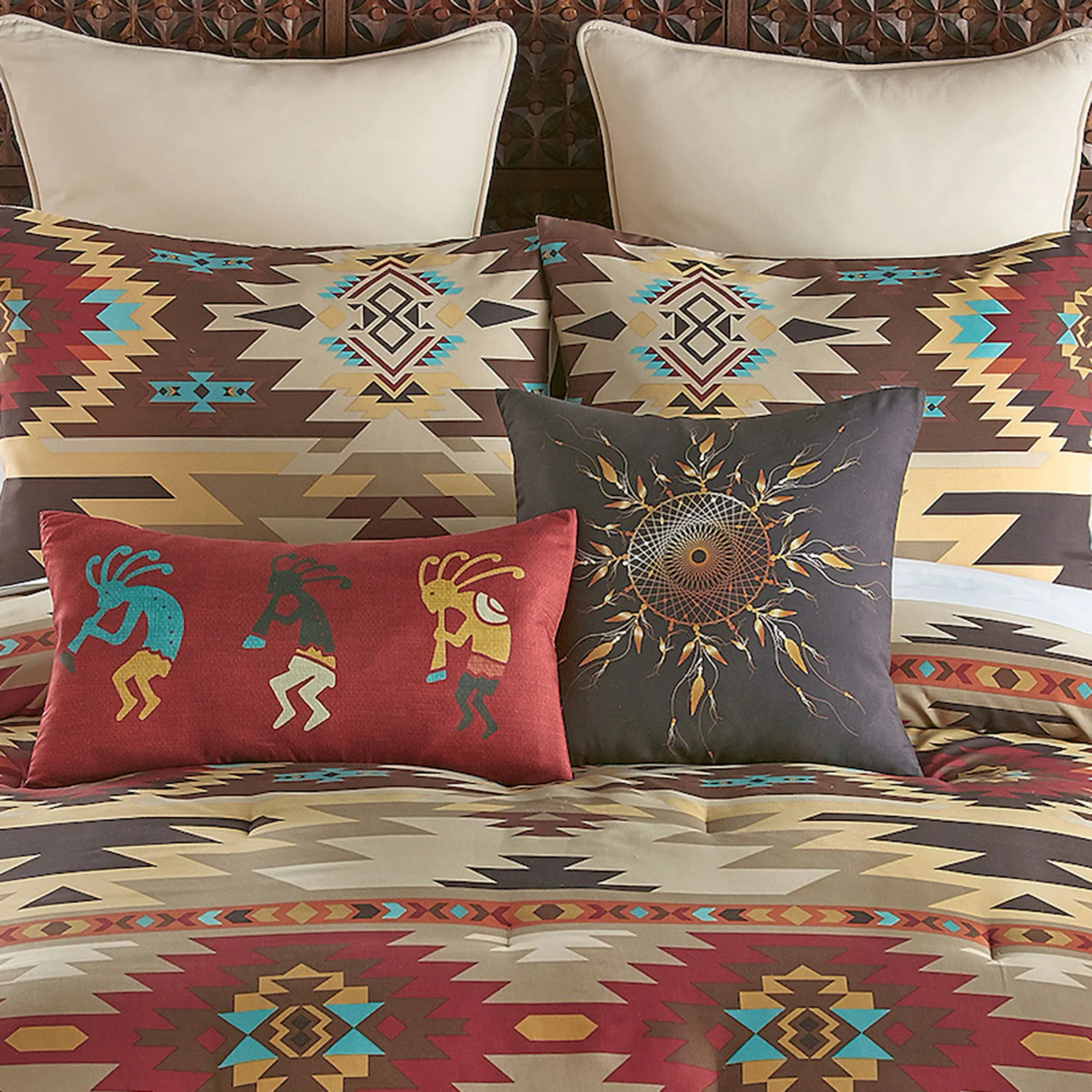The printed Pillow Set of Two includes a square pillow and a rectangle pillow. Spot clean. Square is deep umber with a dream catcher. Rectangle is brick red with three kokopellis.