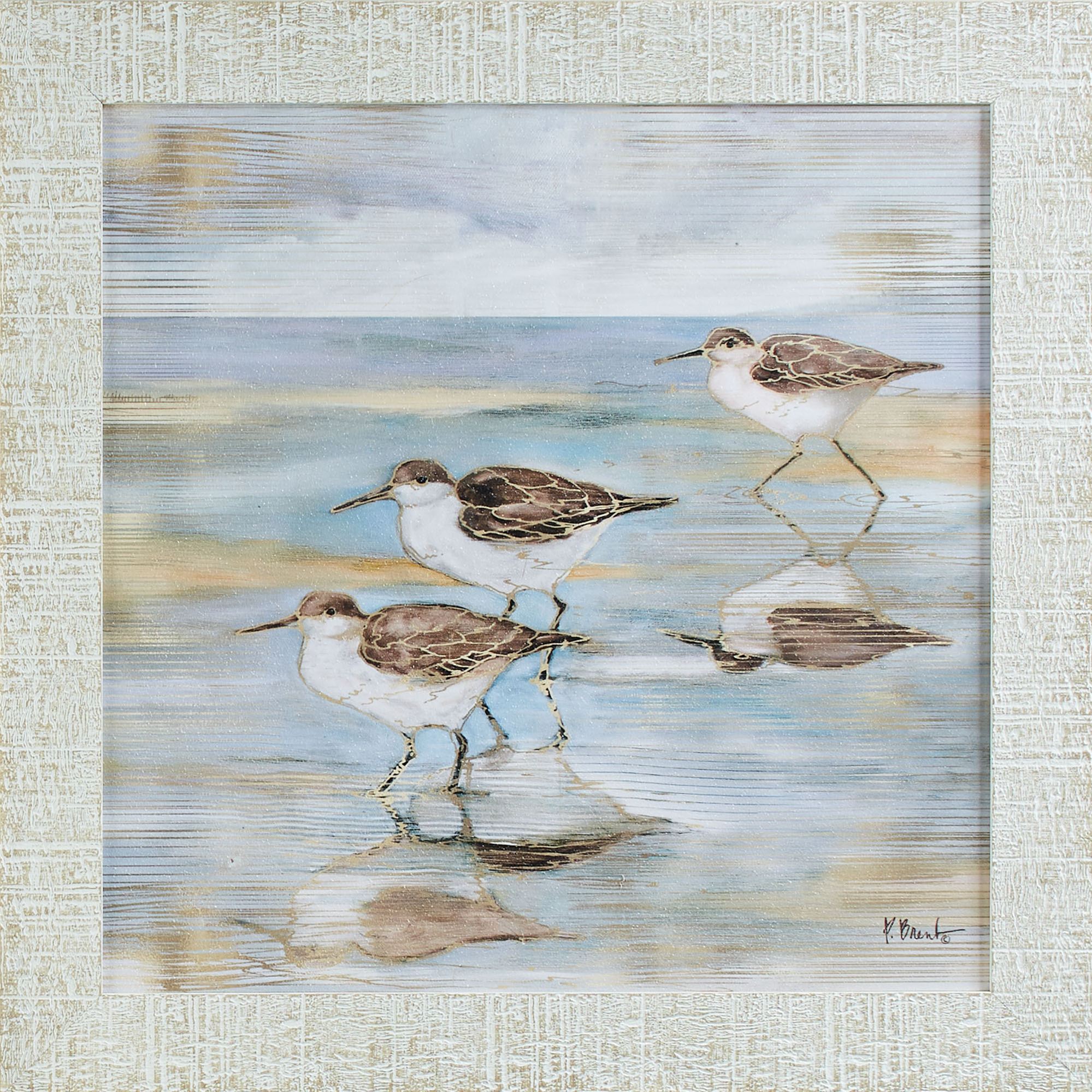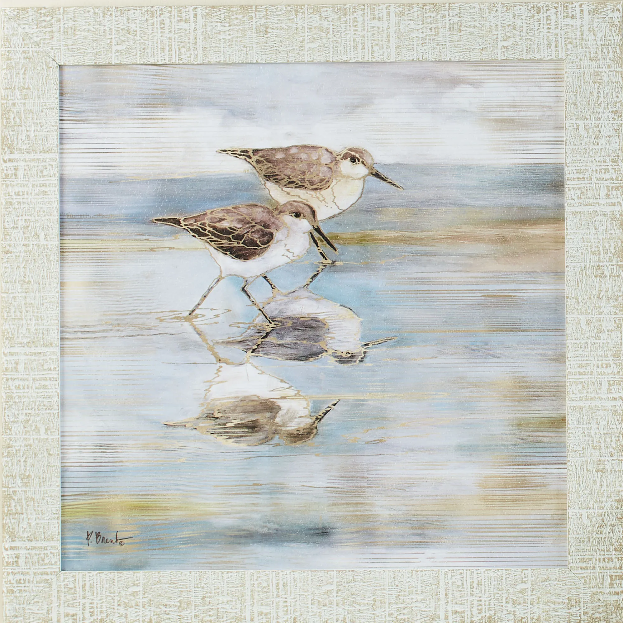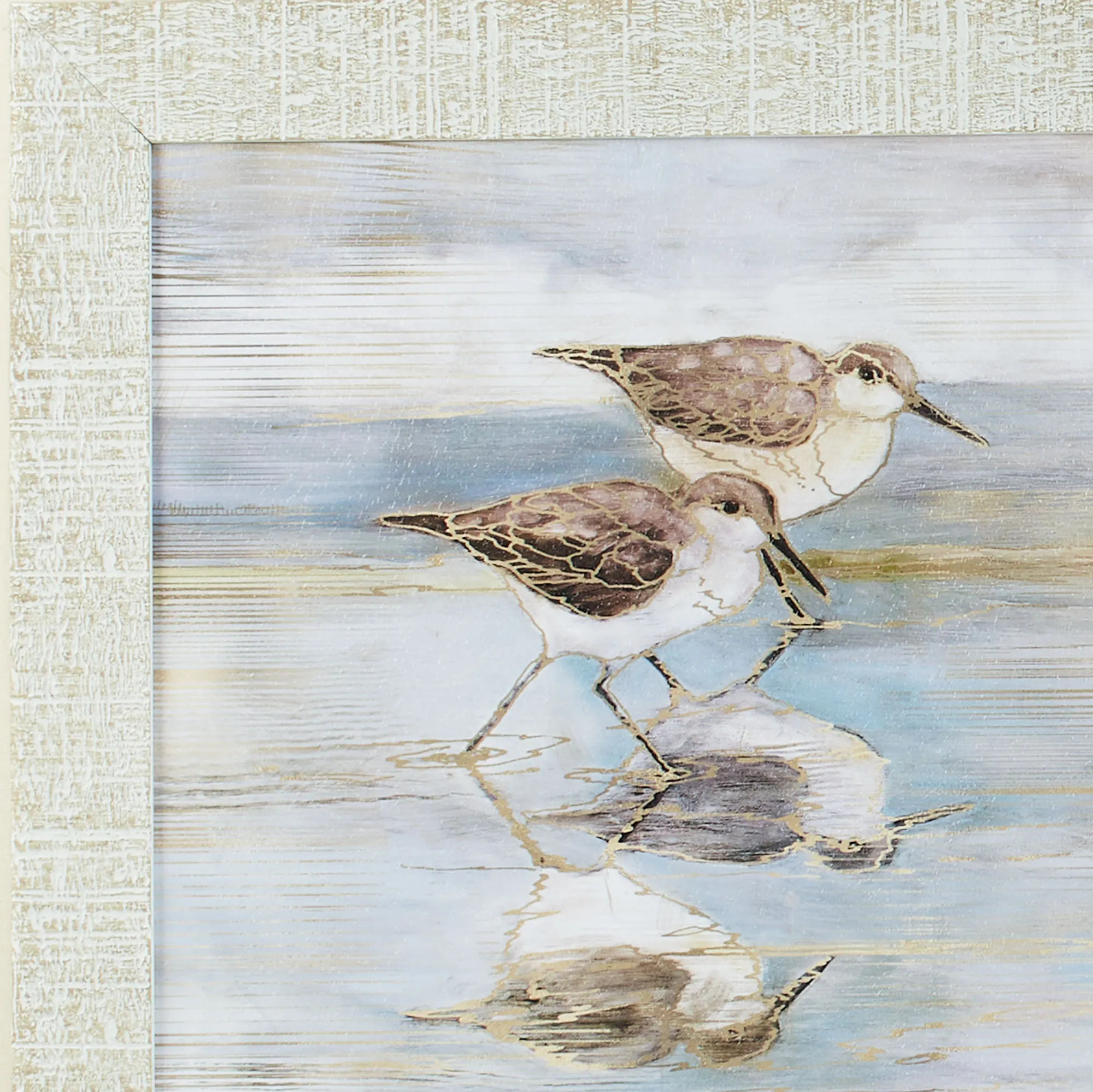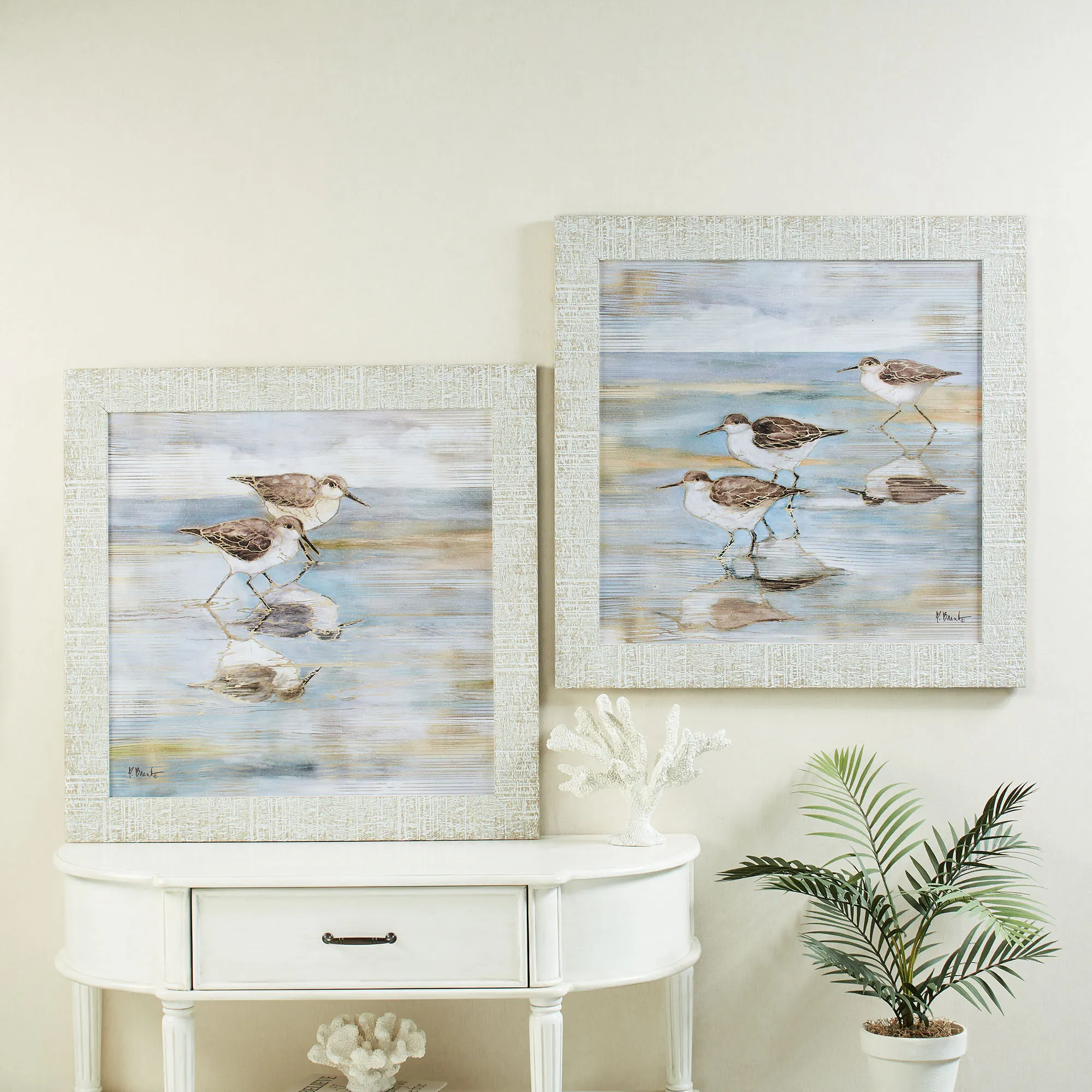 Coastal birds do the Sandpiper Scurry along the water's edge. Proudly made in the USA, each gel-coated textured paper print artwork features sandpiper birds and their reflections in the water. Sandpiper I has two birds facing right. Sandpiper II has three birds facing left. Tones of blue, gold, and white create an abstract beach landscape background within each textured faux wood polystyrene frame. Overall, each framed wall accent measures 31"sq.x1"D.