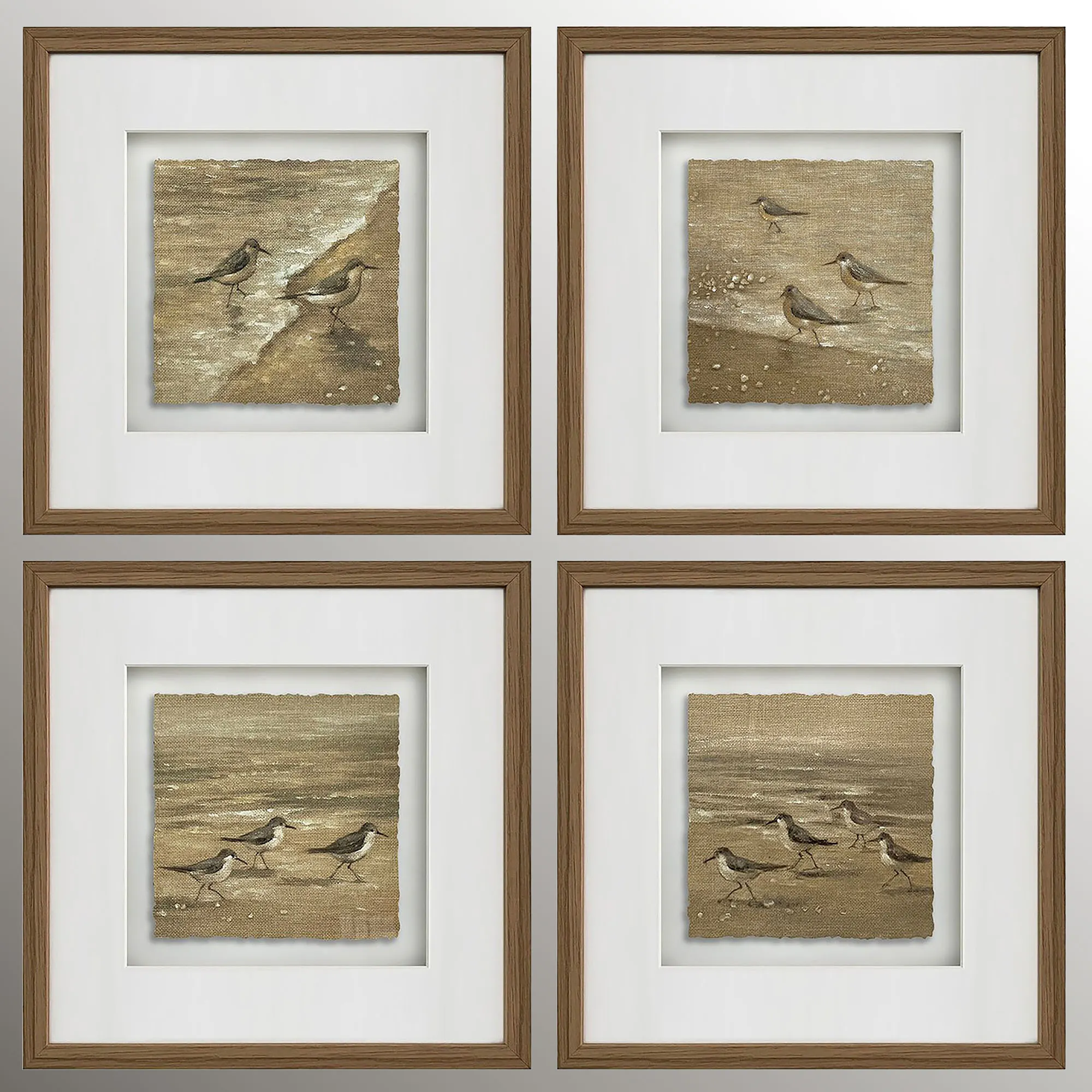 Watch the Sandpipers Scuttle along the water's edge. This cute wall art set features handpainted scenes of sandpiper shorebirds on the beach, rendered with meticulous detailing in sepia-toned paint. The torn-edge linen, the white mounting board, and the clear glass enhances the artworks. Outer wood frames are brown. Each is 20"sq.x1.5"D. Set weighs 23 lbs.
