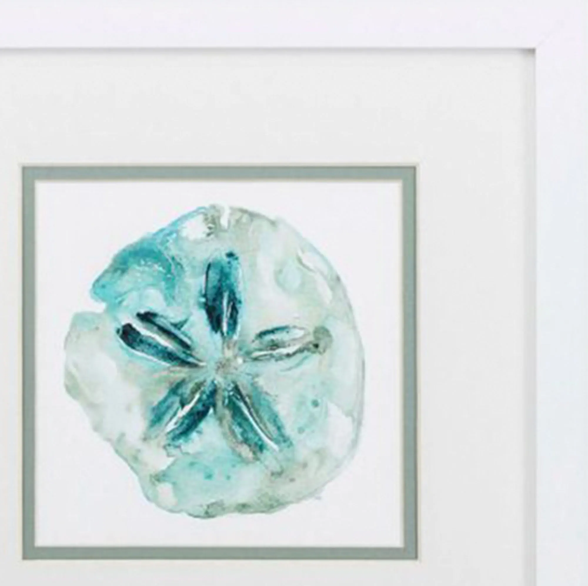 Oceanic shades of turquoise, teal, and aqua fill the Sandstar Framed Wall Art Set with coastal wonder. From original watercolor artwork by the artist Derice, the print set features a lovely mottled starfish and sand dollar on crisp white backgrounds. Sea mist and white mats, a glass insert, and a white polystyrene frame complete each chic artwork. Overall, each coastal framed wall art measures 11"sq.x2"D. Imported/USA.