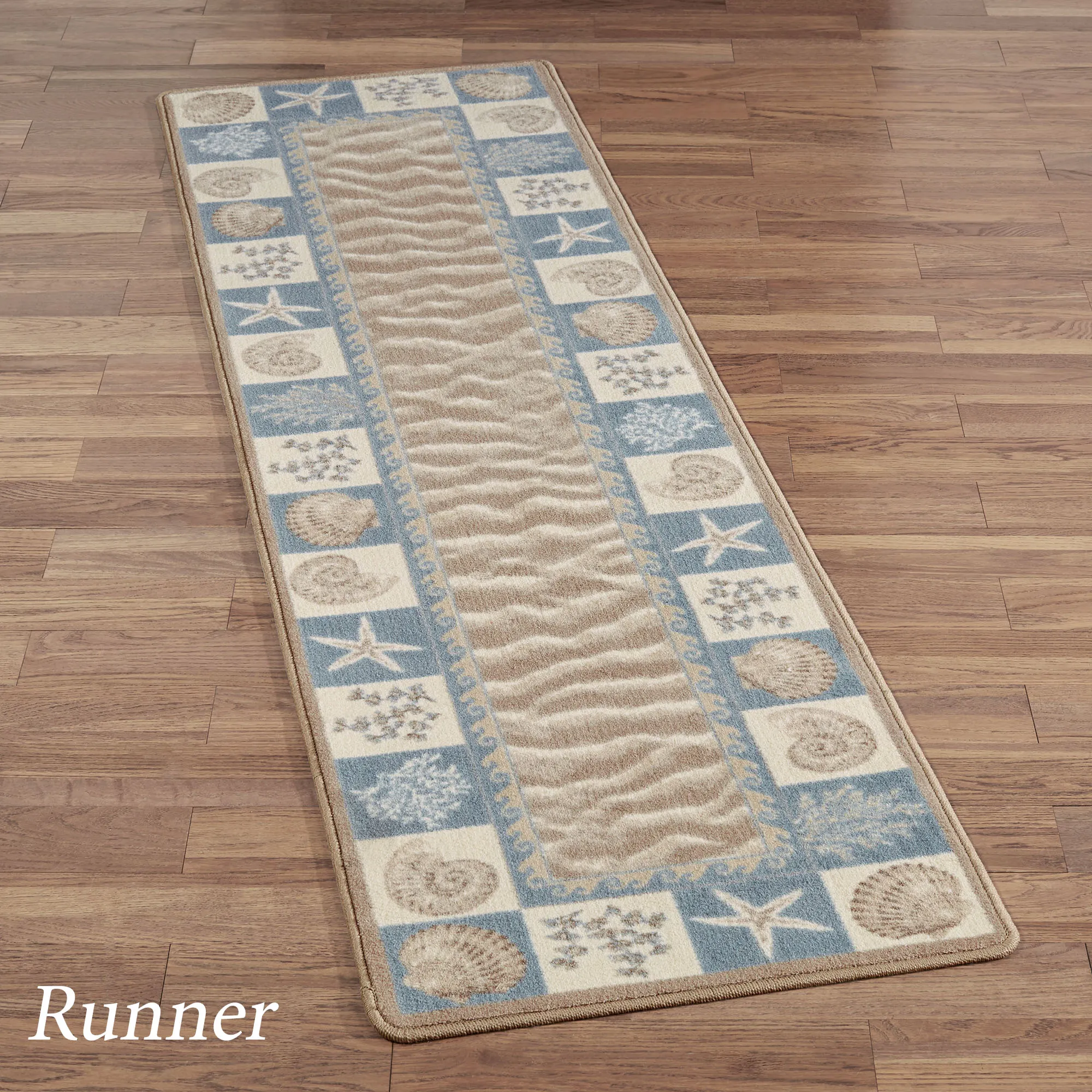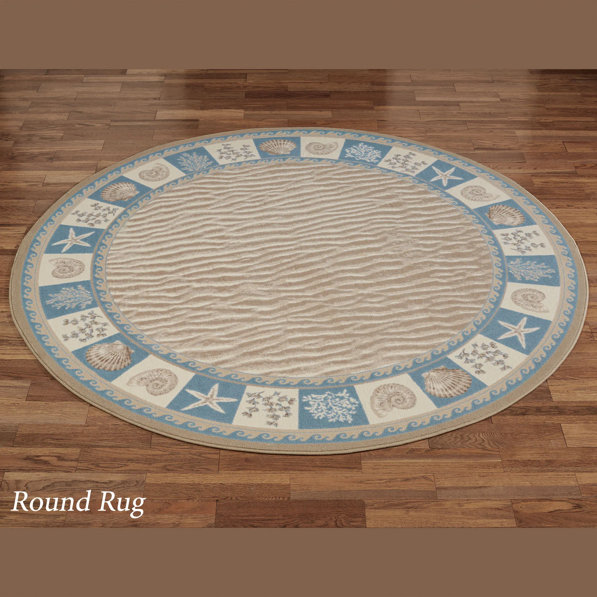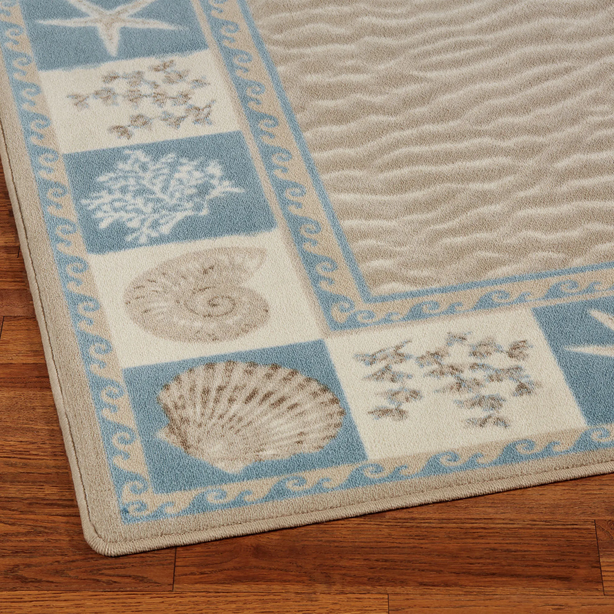 Step upon the Sandy Shore with this charming coastal rug from Milliken Carpets. Proudly made in the USA, the .375" thick, power-loomed nylon rug features a center of rippling sandy motifs framed in rolling waves and squares of sea fans, coral, starfish, nautilus, and scallop shells in shades of glacier blue, taupe, light taupe, and ivory. We recommend professional cleaning by a rug cleaner.