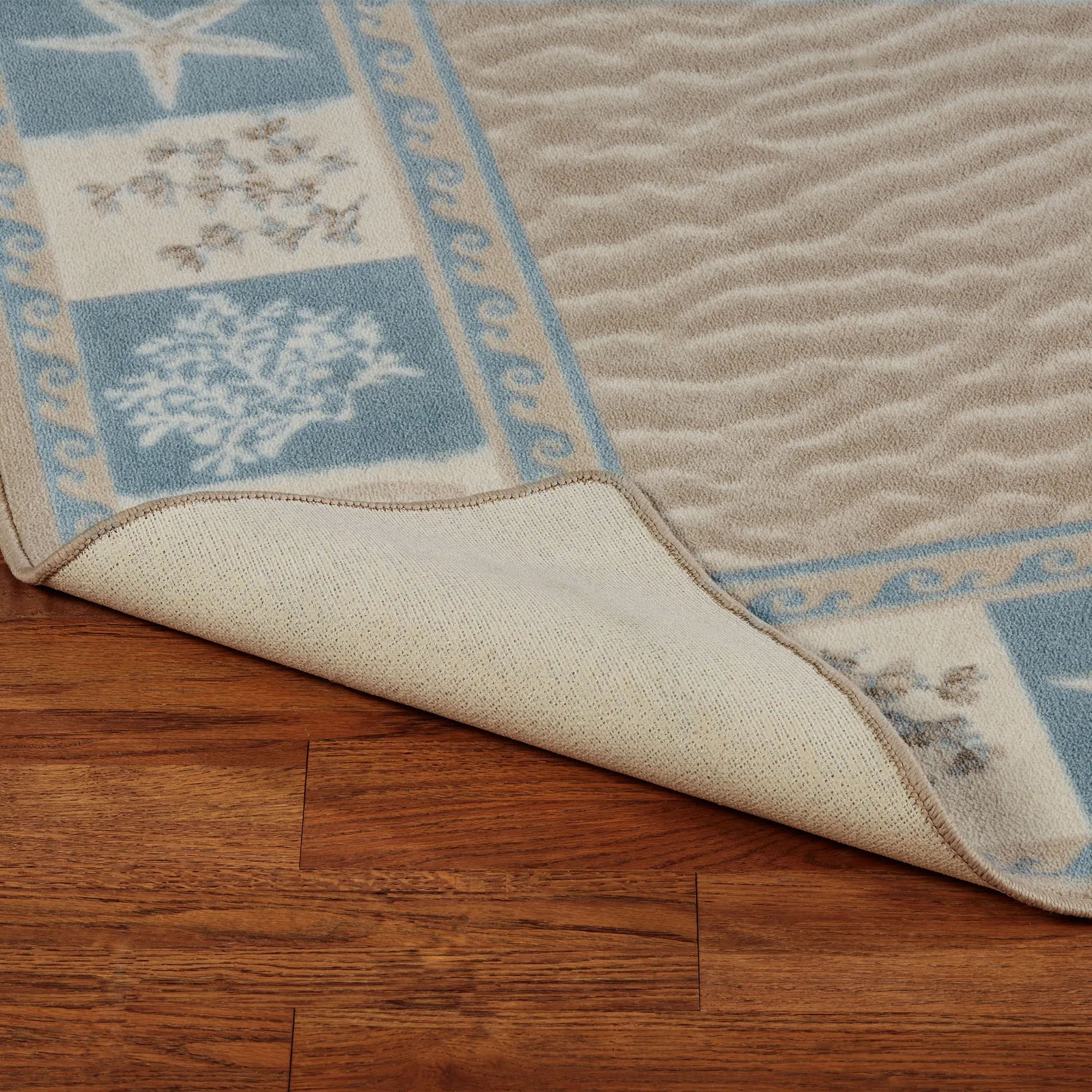 The Sandy Shore Coastal Rug is nylon with synthetic backing. Made in the USA.