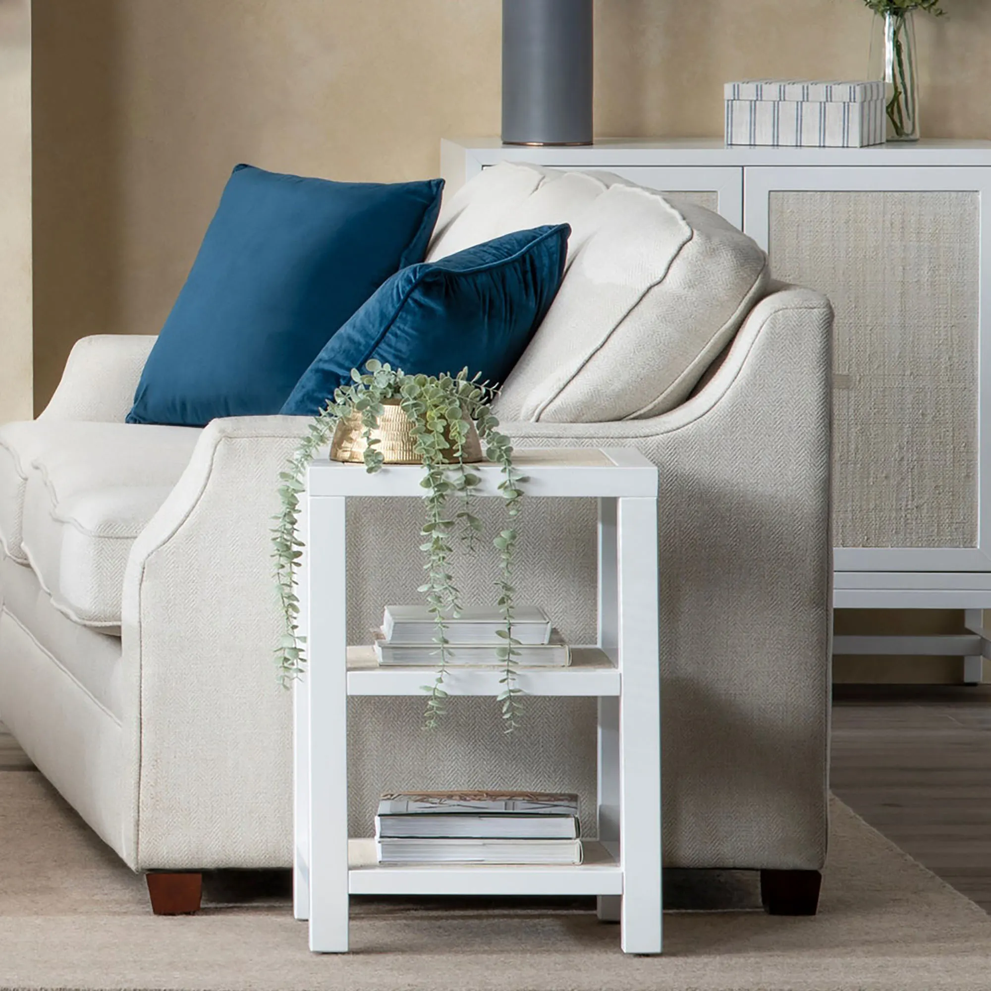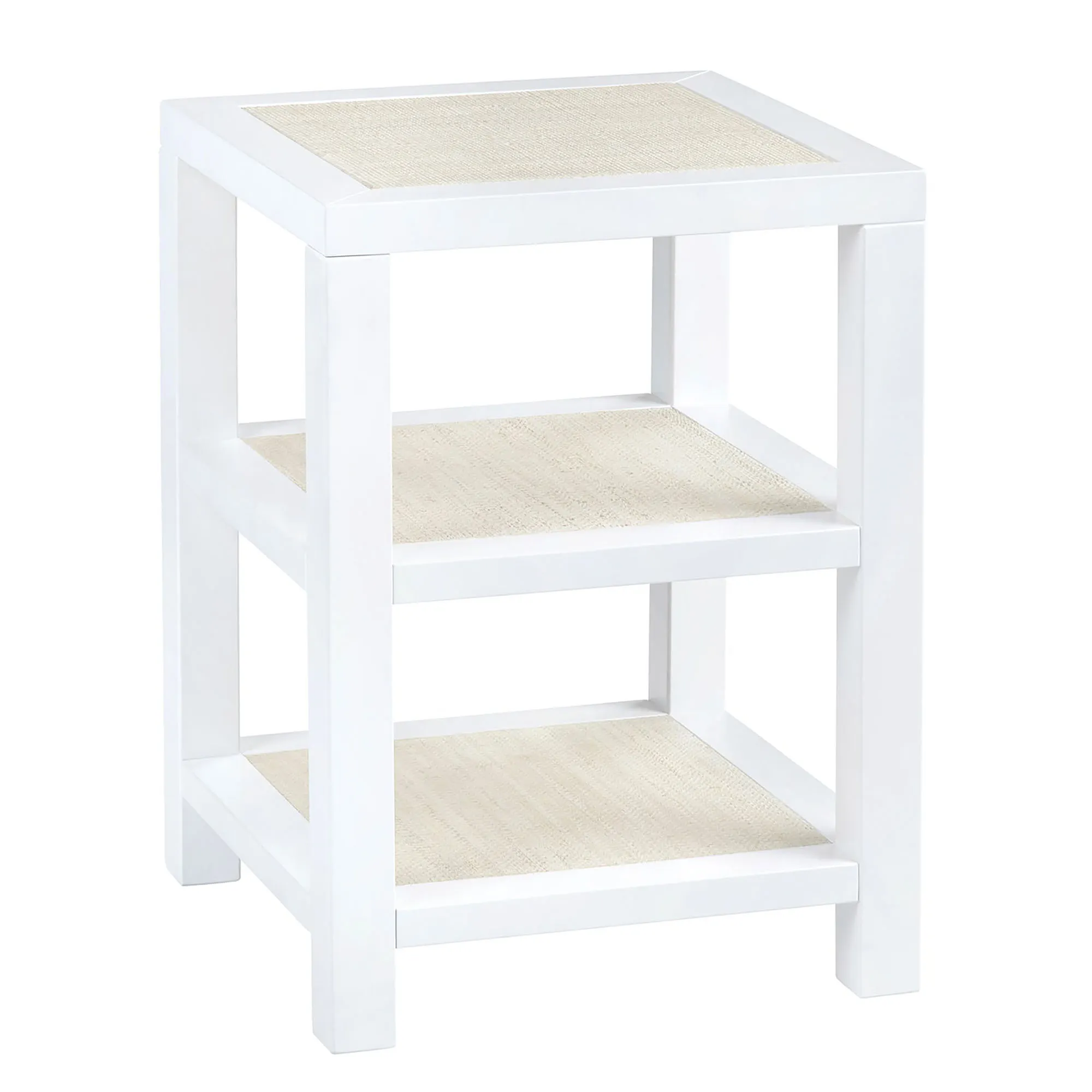The Sandy Shores Side Table exudes a relaxing, clean style with chic simplicity. Finished in a crisp whitewash, the mindi wood table features a square design with an ample display top and two open shelves. Accented with whitewash antiquing, a light-hued rattan weave accents the display areas for further charm. Overall, the end table measures 18"sq.x25"H and weighs approx. 24 lbs.