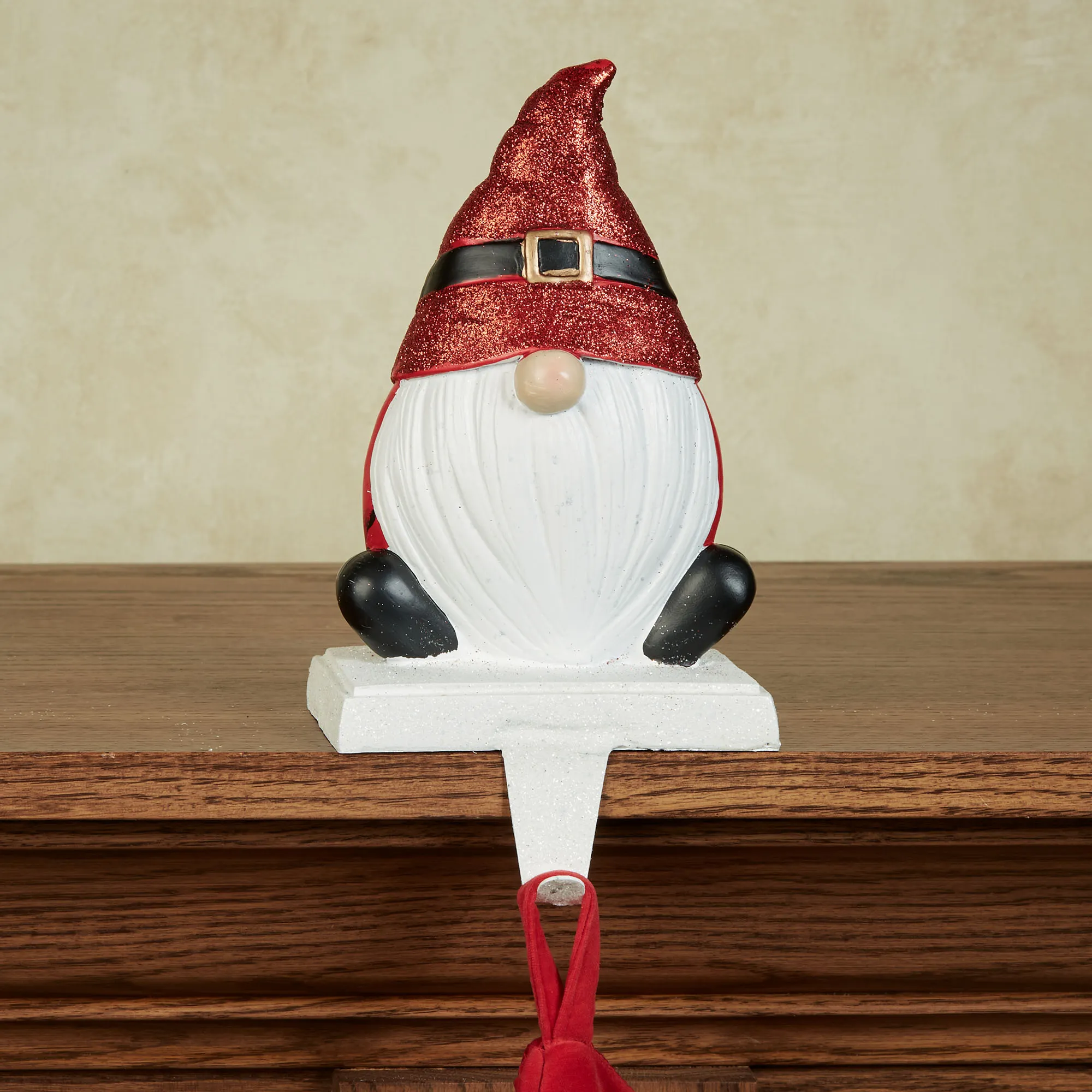 Santa Claus will love the Santa Gnome Christmas Stocking Holder that looks just like him! Designed by Kurt S. Adler, the white glittered base features a gnome sculpture. The gnome has a rosy nose, long white beard, and red glittered hat with an accent belt. With a metal hook, the resin gnome stocking holder measures 5"Wx4"Dx9.5"H.