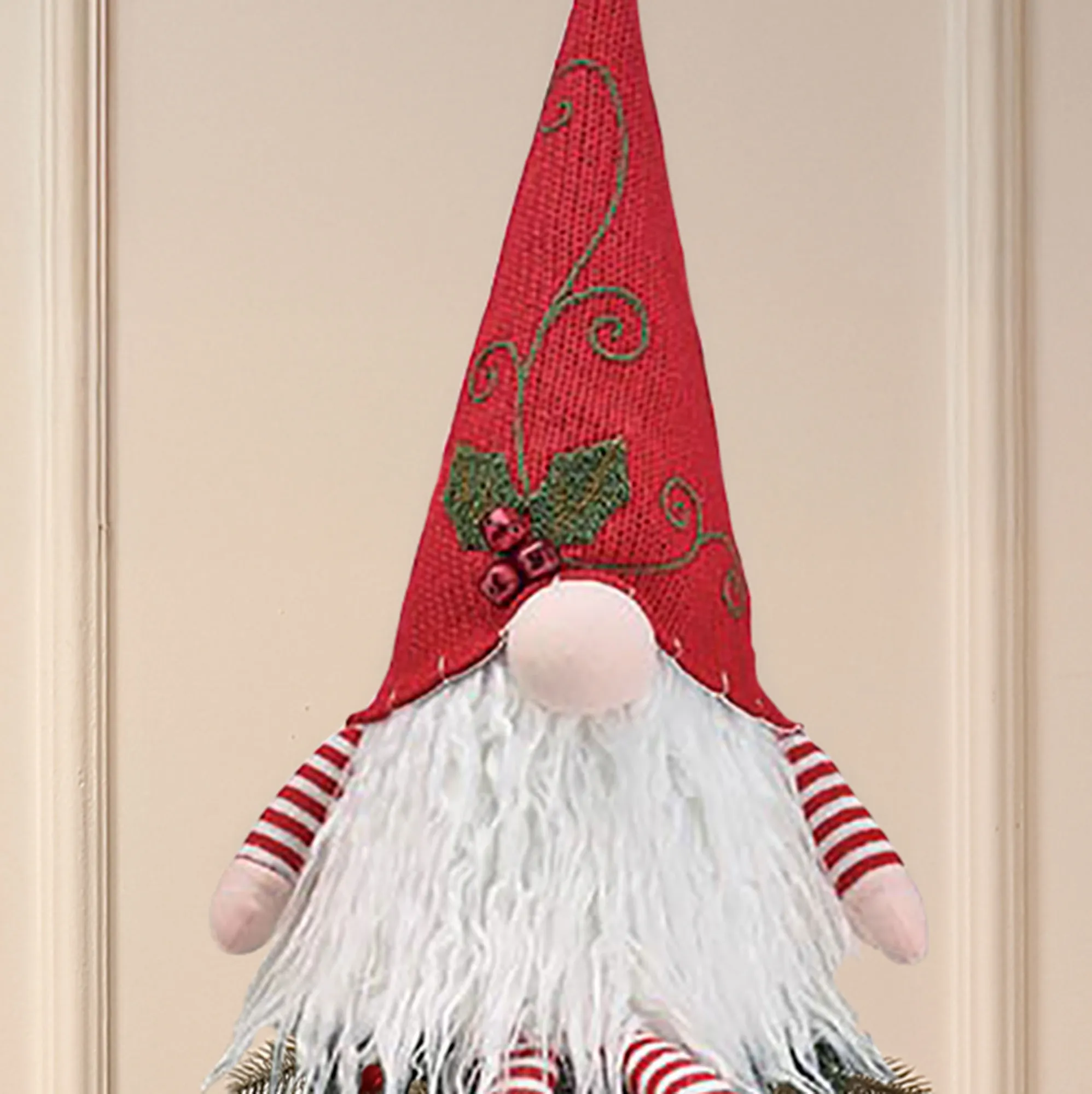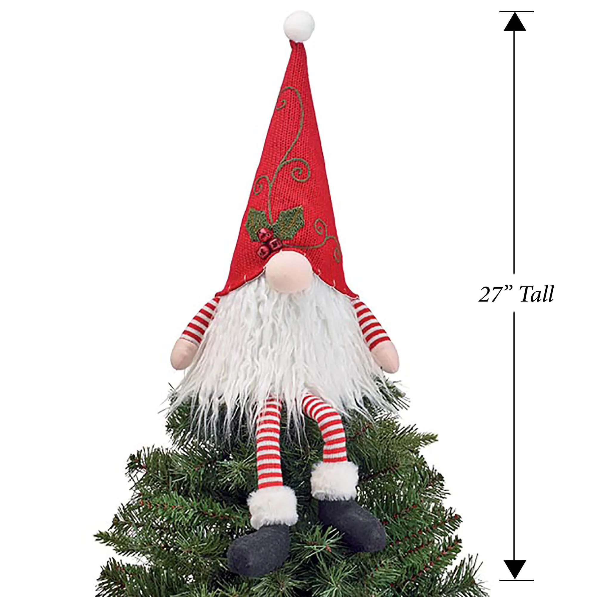 Santa Gnome will look so cute topping your tree. This polyester tree topper depicts a gnome with a white faux fur beard, a red cone hat with holly leaf embroidery and jingle bell accents, white faux fur cuffs, and black shoes. His arms and legs have red and white stripes. The formed cone, 8" dia, allows it to rest gracefully on a Christmas tree or table top. Measures approx. 10"Wx9"Dx27"H. Spot clean. Imported.