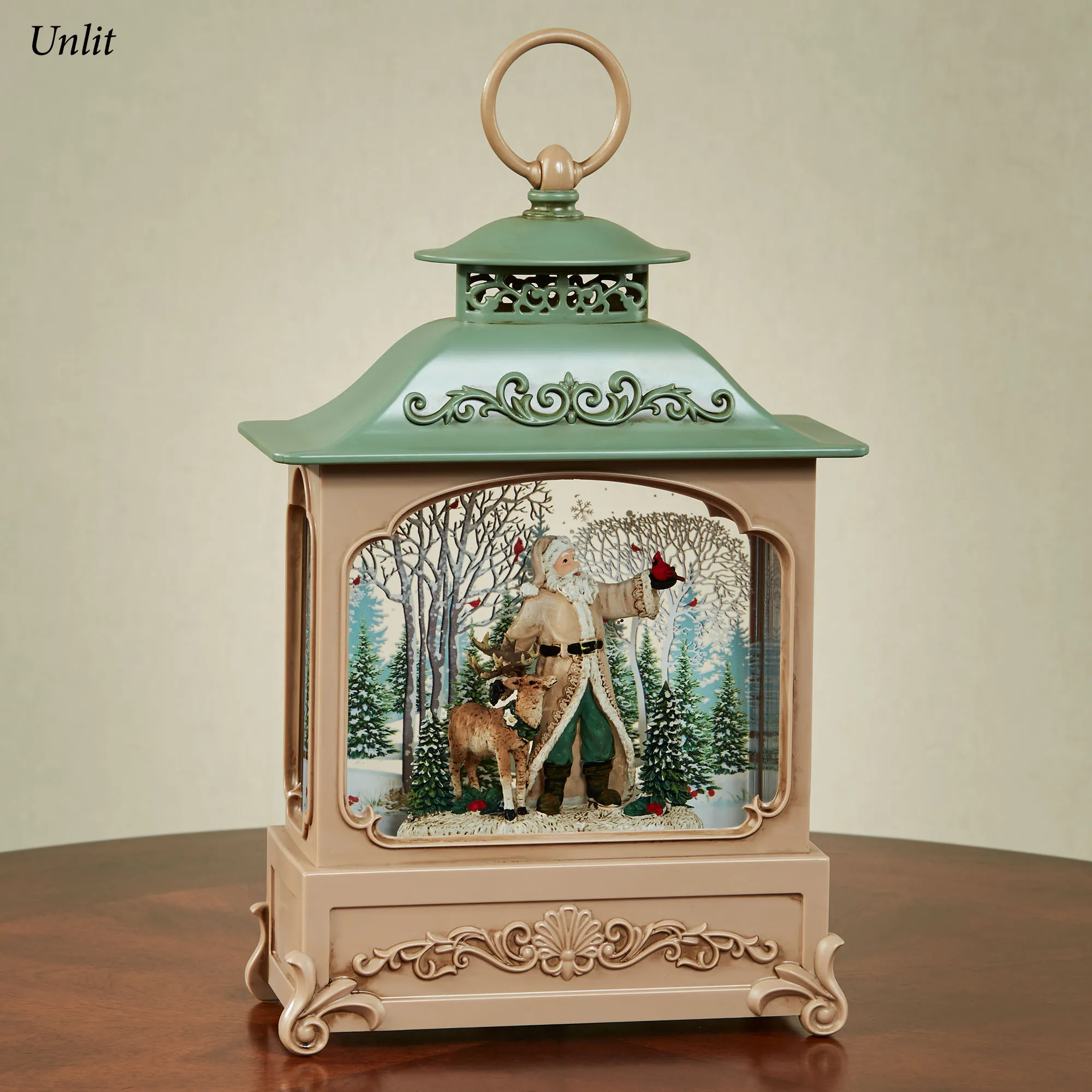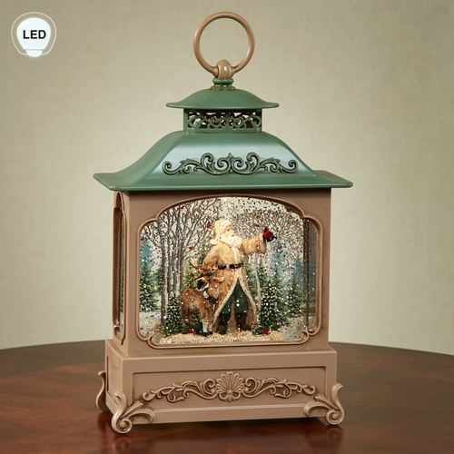 The Santa with Deer Swirl Lantern captures Santa visiting his red cardinal pals on a snowy trek through the birch and pine tree forest. From Confetti Lites(TM) by Roman, Inc., the molded plastic lantern has an ornate dark beige and pine green design adorned with scrollwork, openwork details, and a top ring. The liquid-filled center swirls with shimmering glitter and glows with LED lights. Requires three of your AA batteries or your adapter for use with the included USB cord and operates via an on/off switch on the bottom. Measures 7"Wx3.5"Dx12.5"H, including the ring at the top.