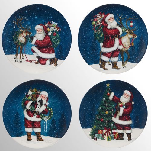 The Santa's Secret Dinner Plates display the holiday icon in winter scenes. This ceramic dinner plate set, by (C)Wendy Wiinanen, features decal designs of Santa Claus on a blue background. One plate has Santa kneeling down by a reindeer; another plate has Santa Claus standing next to a reindeer; the third plate has Santa holding a bag of gifts and a wreath; and the final one has Santa decorating a tree. The Christmas holiday plates are handpainted with a gloss finish. Each plate is 11" dia. Food-, dishwasher-, and microwave-safe.