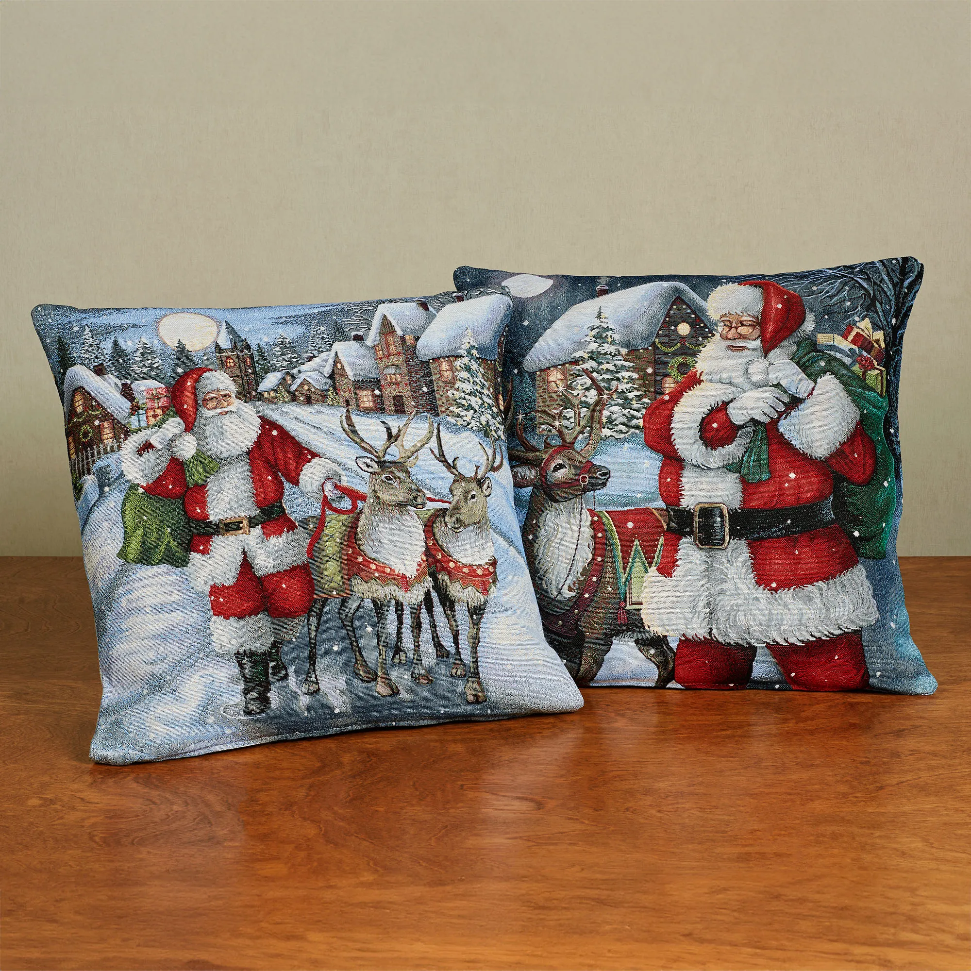 Santa's Village visits just require his trusty reindeer and green bag of goodies. With a tapestry-woven style, the polyester/cotton-blend pillows in this set each feature a different scene of Santa in his red suit making a special stop in the snow-laden town; zipper closure. Inserts are polyester; spot clean. Each reversible Christmas pillow is 17" sq. Machine wash the casings. Made in Spain.