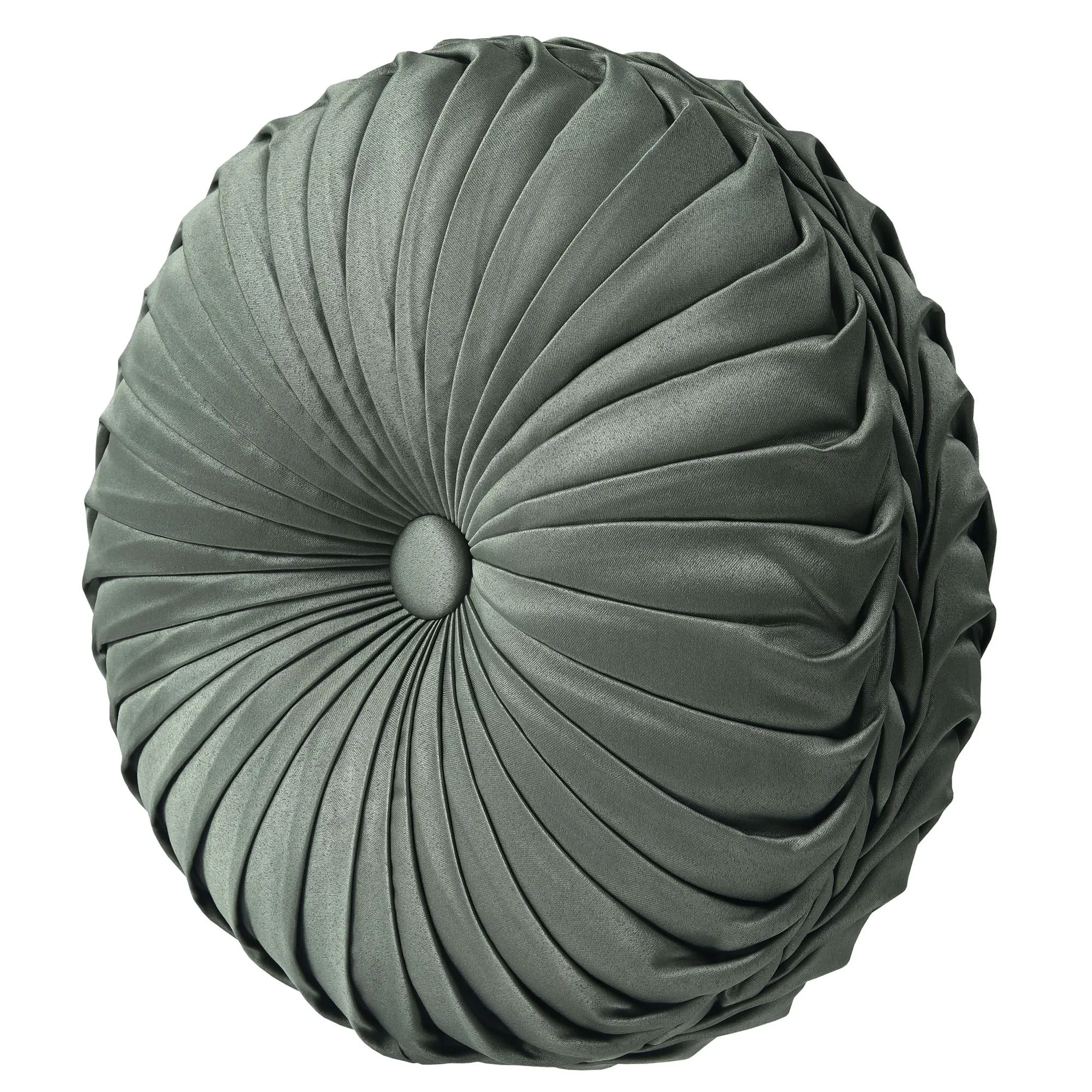 Pillows: Spot clean. The reversible, handmade Round is pleated dark green with a center button tuft and a 3" side gusset. Rectangle is sheared dark green pieced with trim bands and pleated flange ends; zipper closure. Square has damask and piped edges; zipper closure.